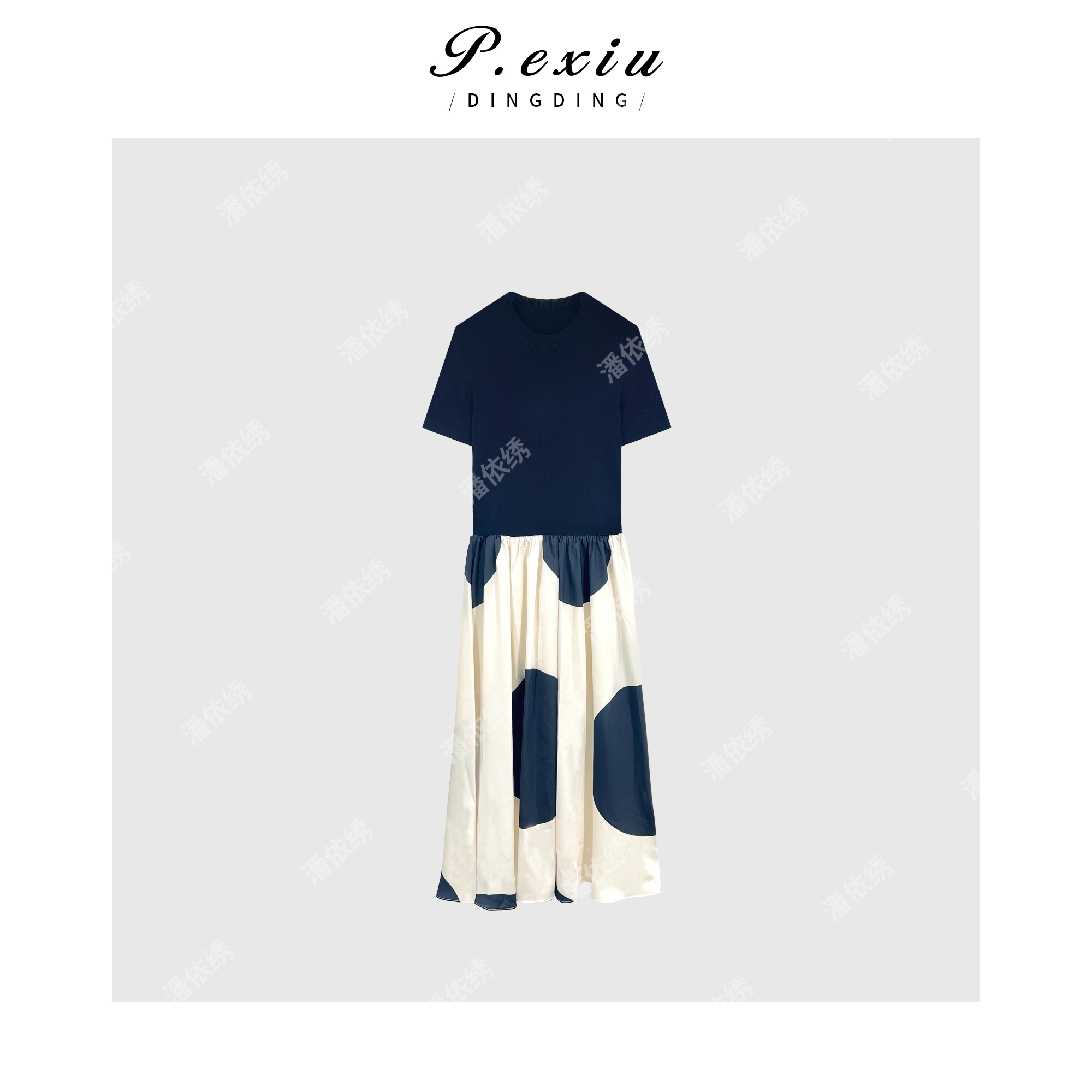 04-3潘依绣丁丁宠粉潘依绣 小众设计感针织拼接波点印花短袖连衣裙 Q8506