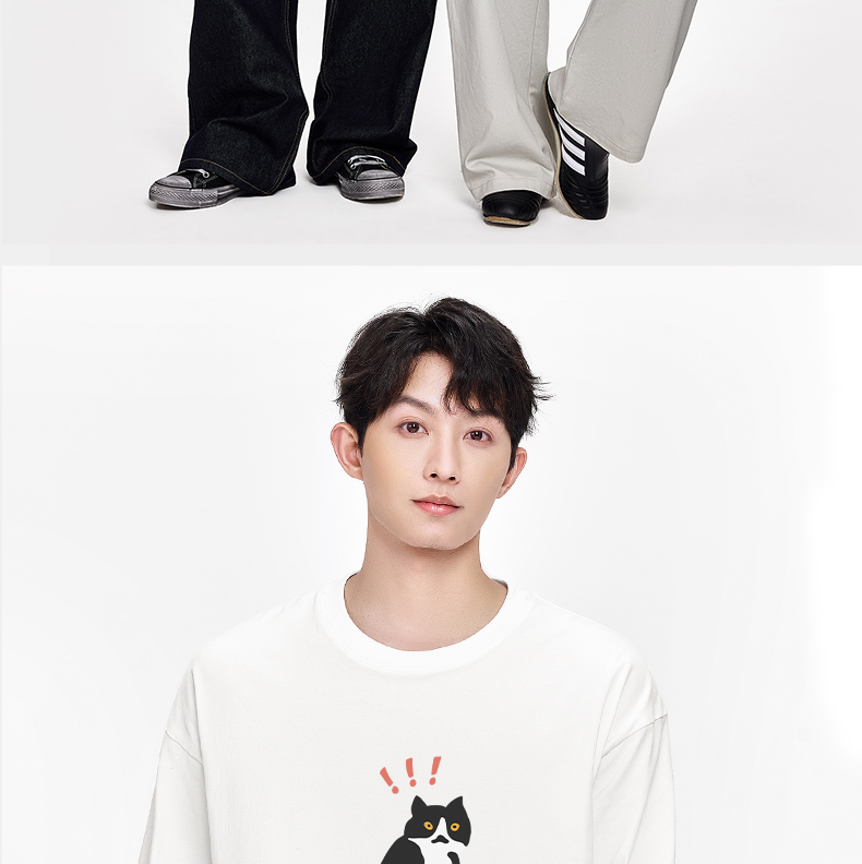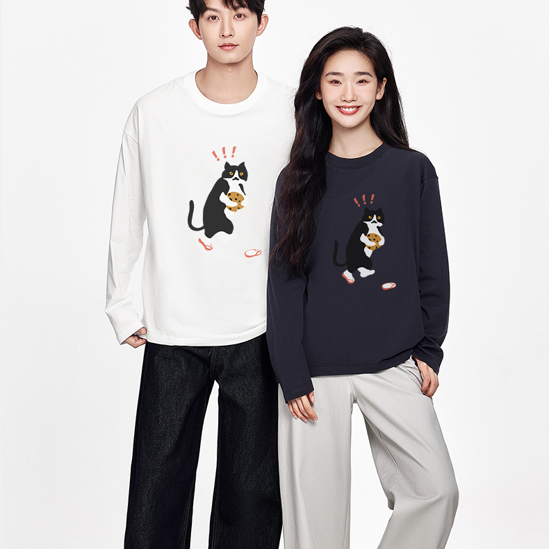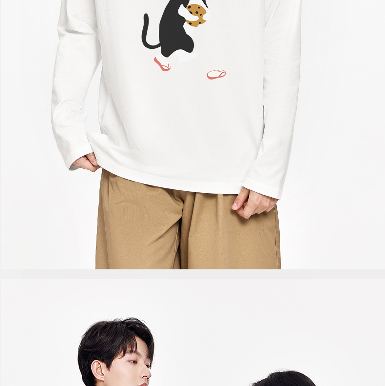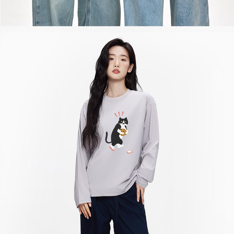 「棉的美学」纯棉卡通小猫印花T恤春秋打底衫休闲宽松百搭长袖上衣