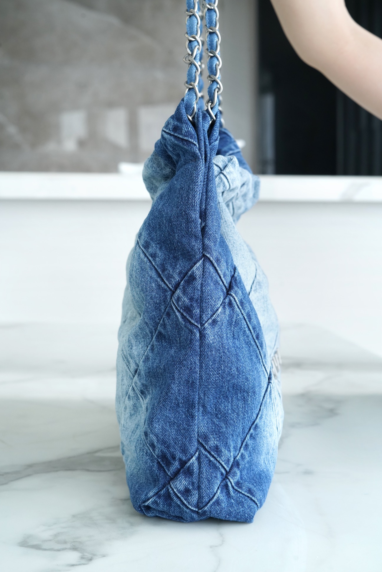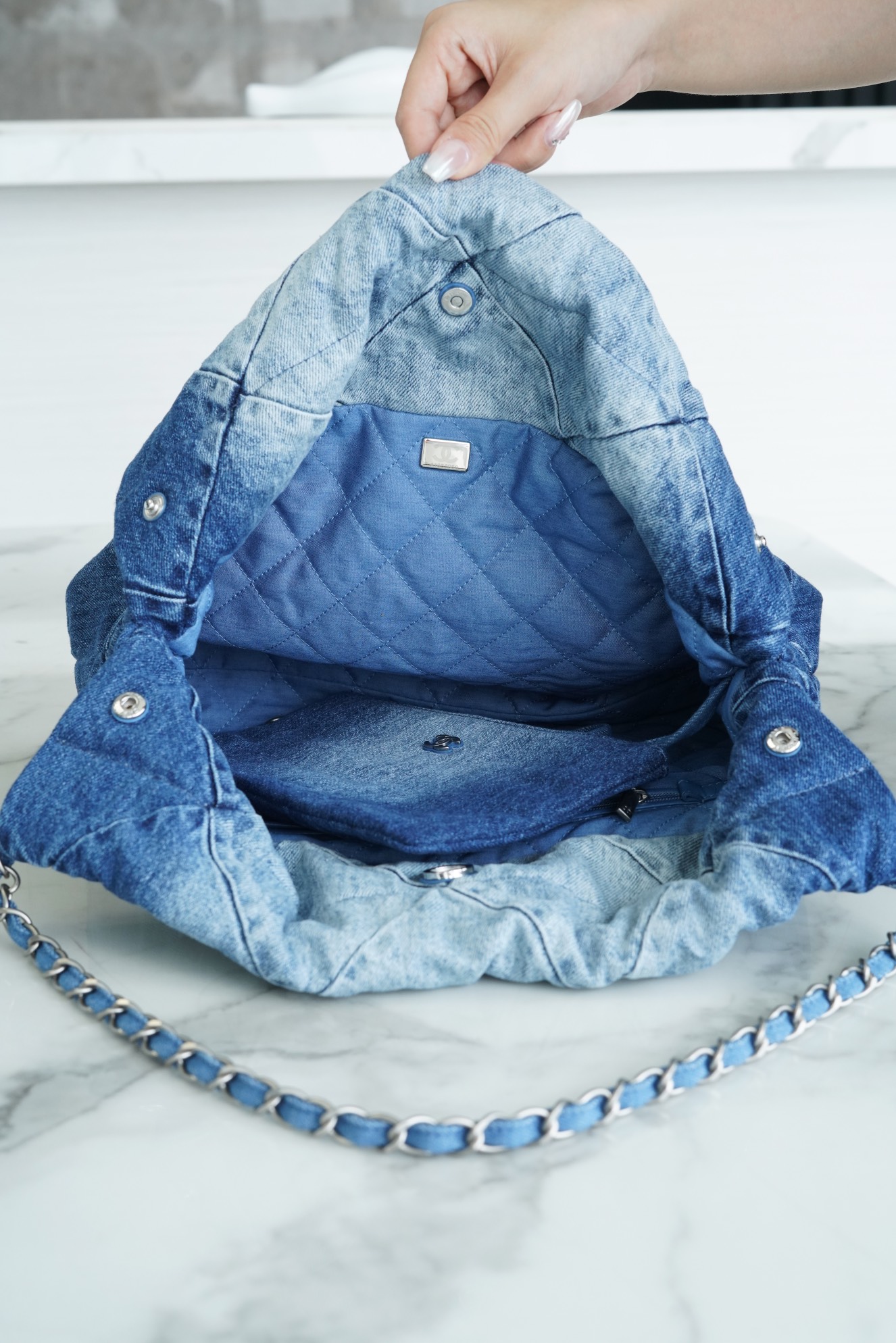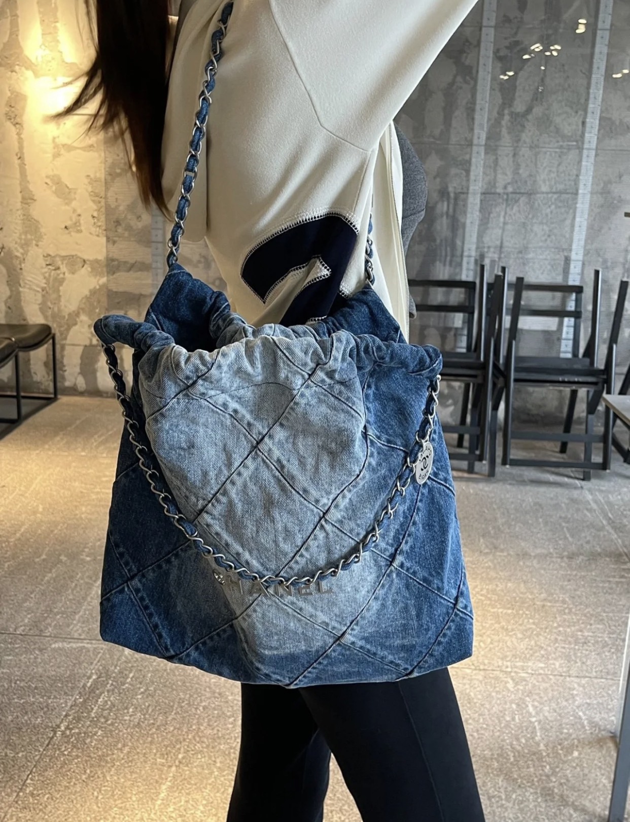 ??????????*春夏新款 22bag 牛仔蓝 小号 牛仔以随性休闲著称,换上银色五金配色,焕然一新,瞬间年轻感爆棚,冲刺着青春与活力的气息,有春夏季节的清爽感…将简约舒适融为一体,为你打包整个春日?? 小号尺寸:35*37*7cm