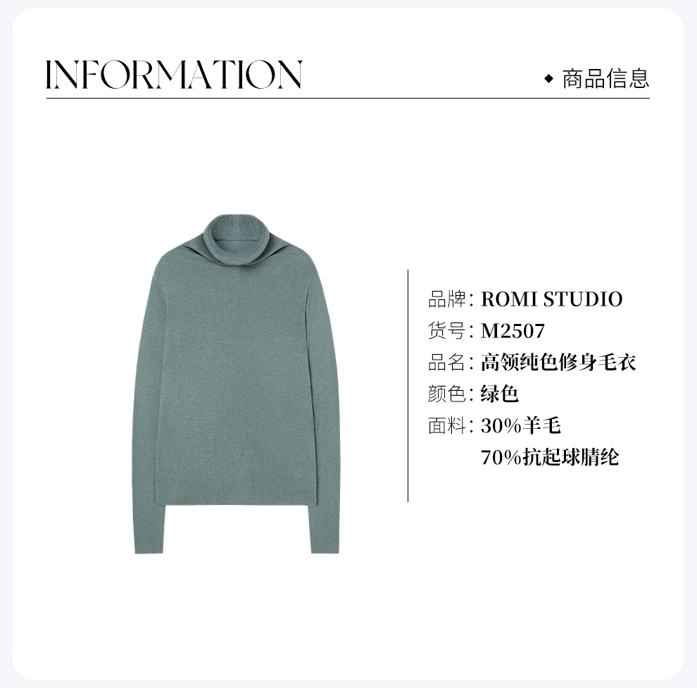 ROMI STUDIO 法式优雅精选48支羊羔毛时尚绿色高领打底毛衣M2507