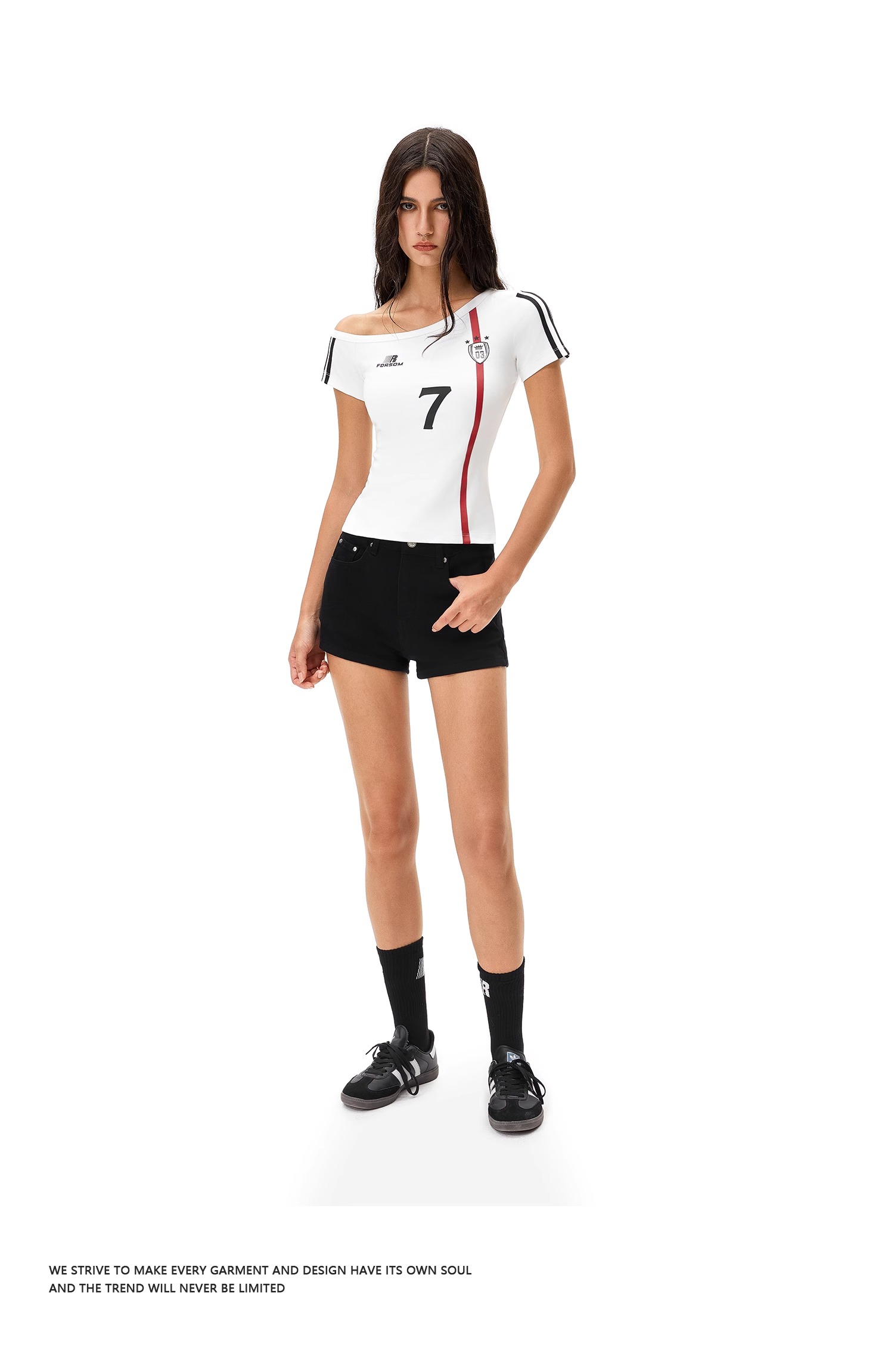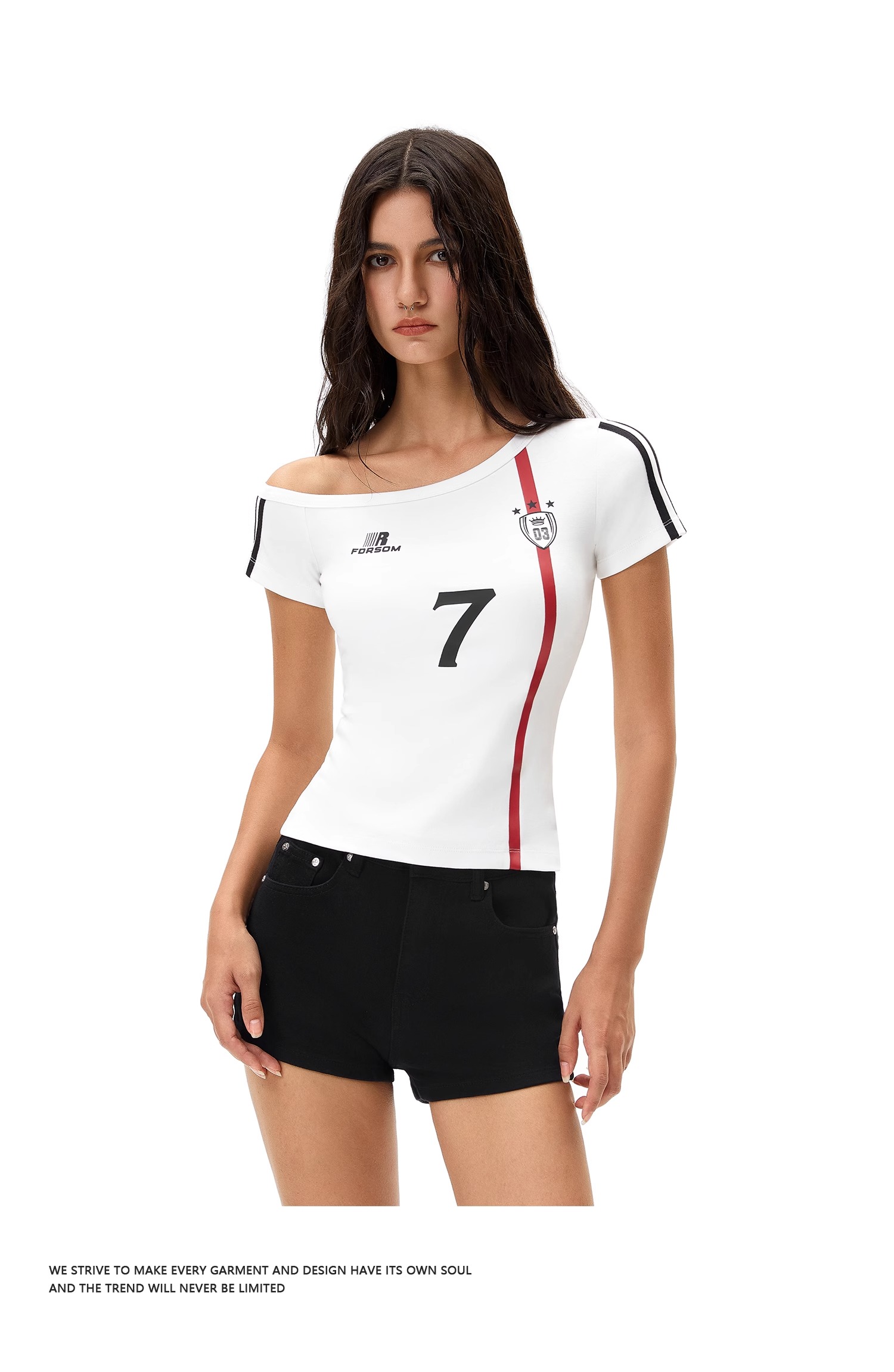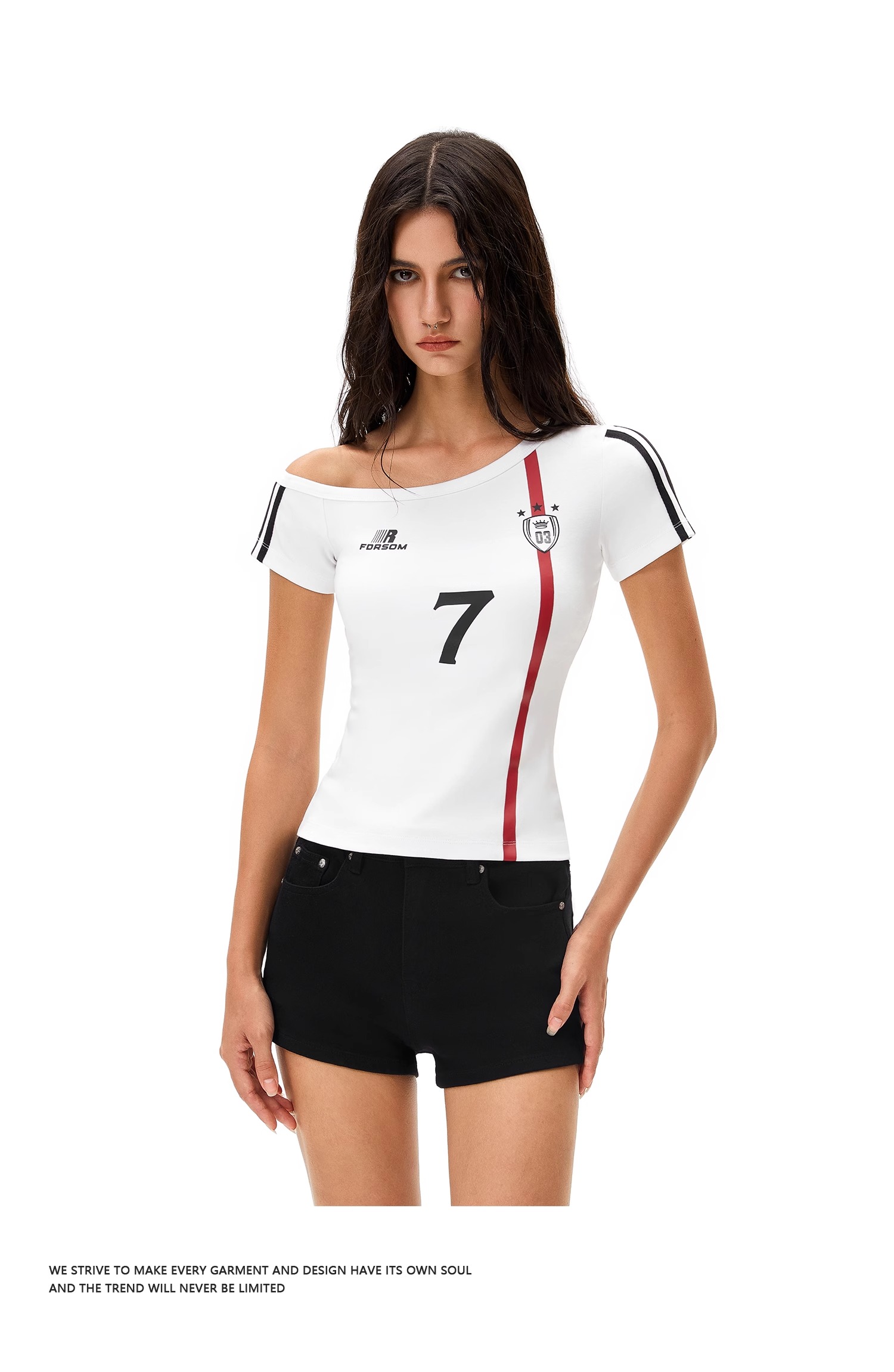 FDR官方店 斜肩数字运动修身短袖T恤女夏季美式辣妹露肩显瘦上衣