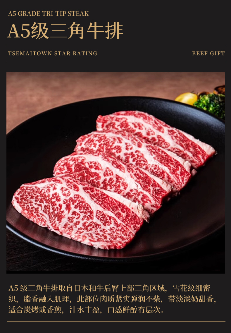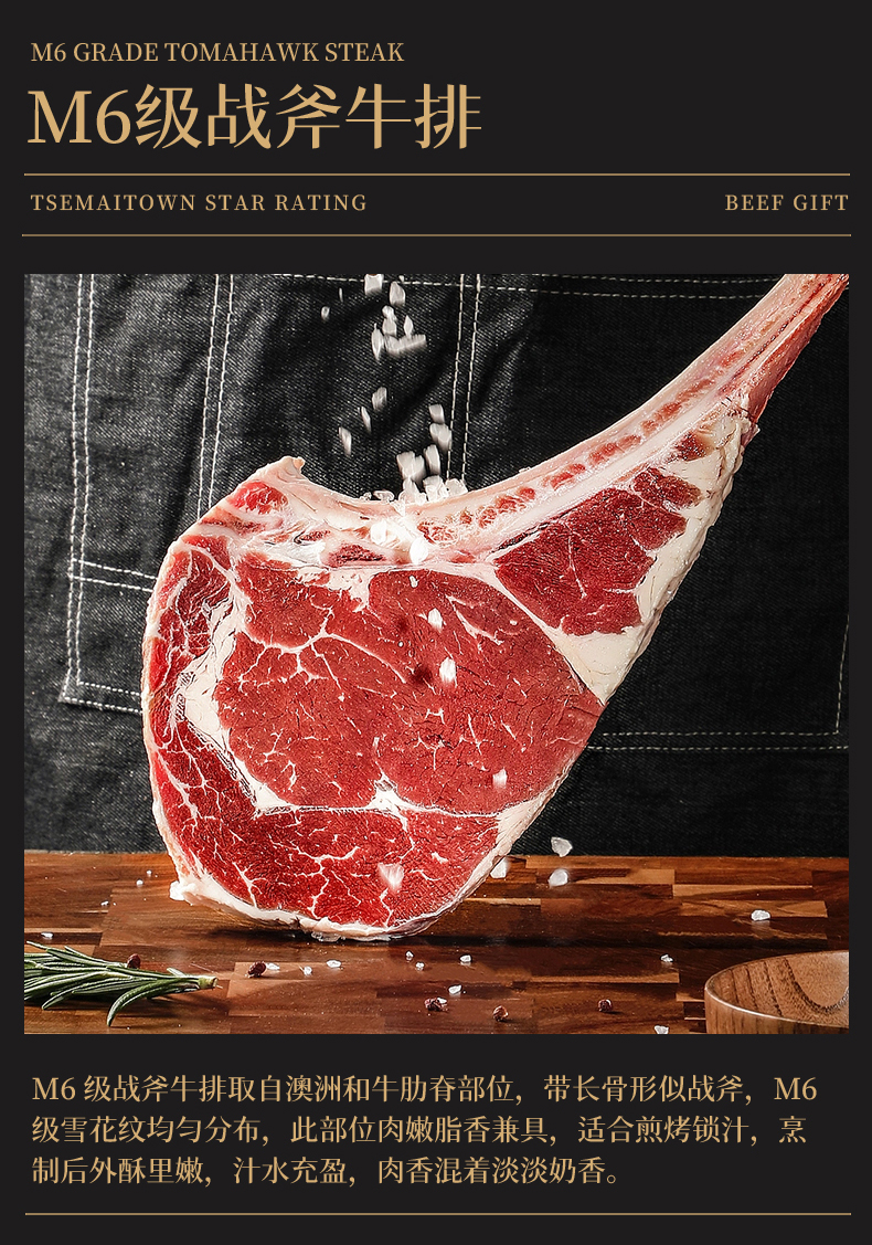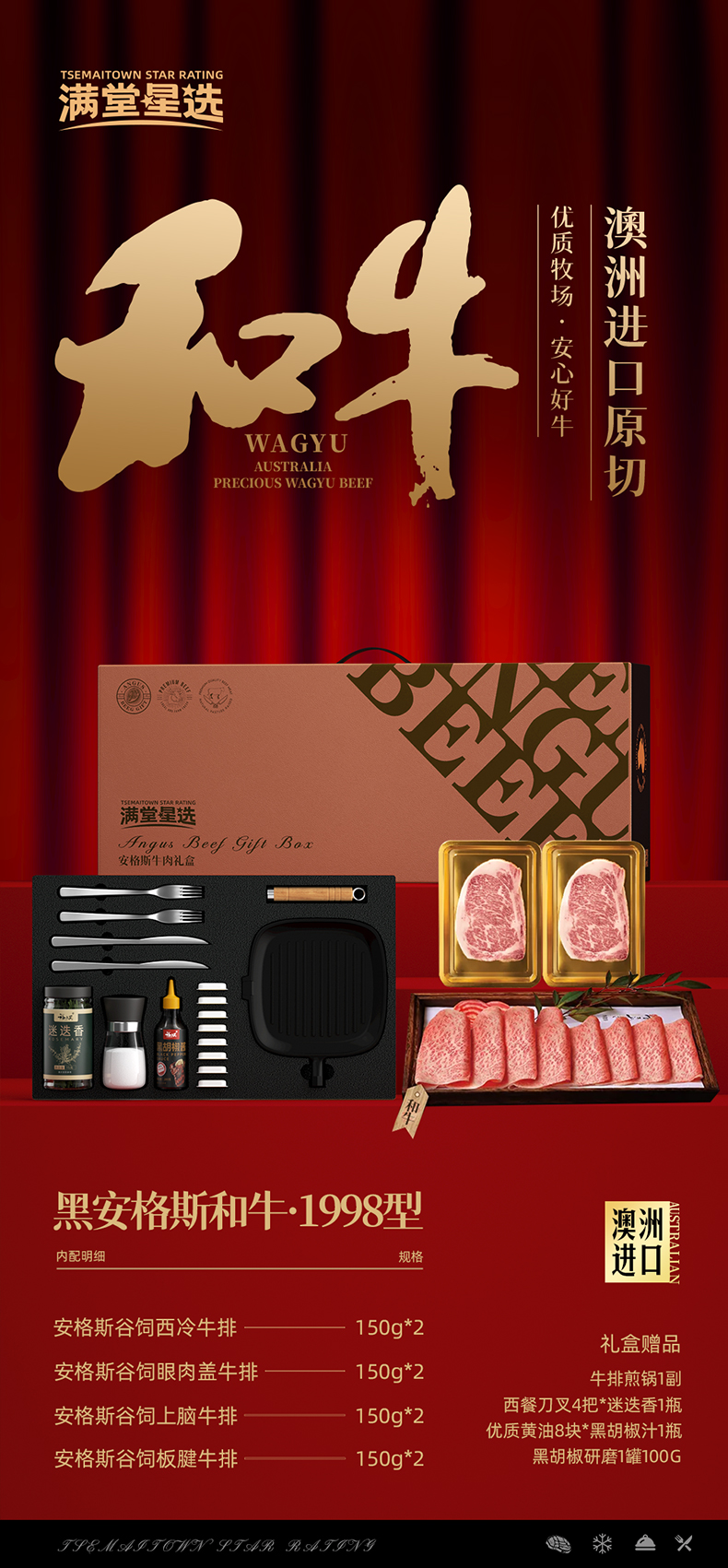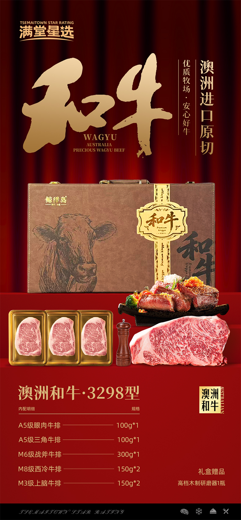 | 澳洲和牛3298型 | A5级眼肉牛排 100g*1 A5级三角牛排 100g*1 M6级战斧牛排 300g*1 M8级西冷牛排 150g*2 M3级上脑牛排 150g*2 礼盒赠品: 高档木制研磨器1瓶 | 1100g |