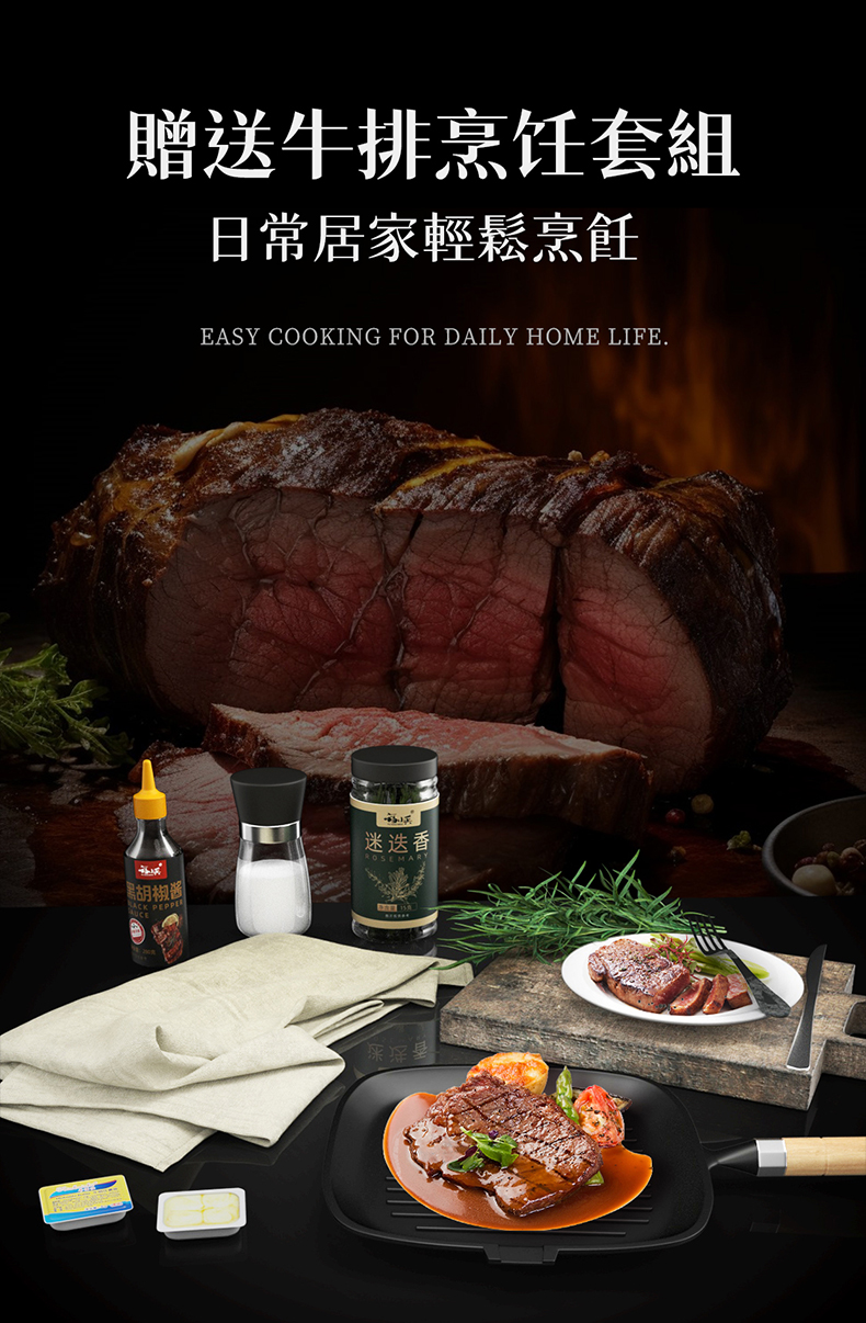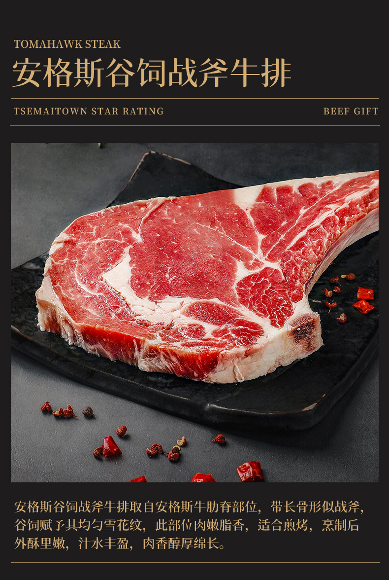 | 黑安格斯和牛2298型 | 安格斯谷饲战斧牛排 250g*2 安格斯谷饲西冷牛排 150g*2 安格斯谷饲眼肉盖牛排 150g*2 安格斯谷饲上脑牛排 150g*2 安格斯谷饲板腱牛排 150g*2 礼盒赠品:牛排煎锅1副 西餐刀叉4把*迷迭香1瓶*优质黄油8块 黑胡椒汁1瓶*黑胡椒研磨1罐(100g) | 1700g |