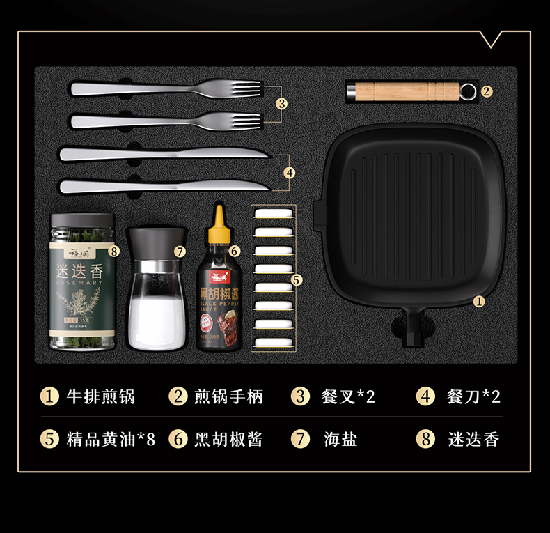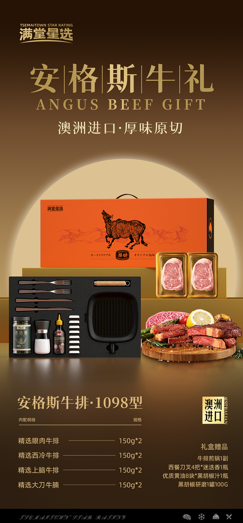 | 安格斯牛排1098型 | 精选眼肉牛排 150g*2 精选西冷牛排 150g*2 精选上脑牛排 150g*2 精选大刀牛腩 150g*2 礼盒赠品:牛排煎锅1副 西餐刀叉4把*迷迭香1瓶*优质黄油8块 黑胡椒汁1瓶*黑胡椒研磨1罐(100g) | 1200g |