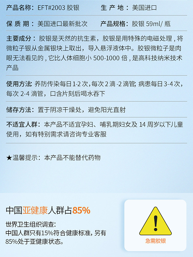 美国原装正品EFT2003天然抗生素杀细菌胶银59ml瓶品质保证新包装