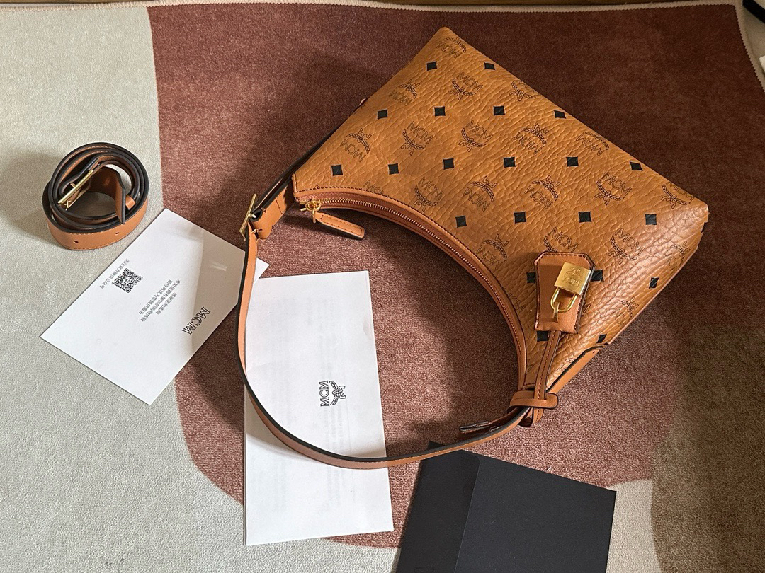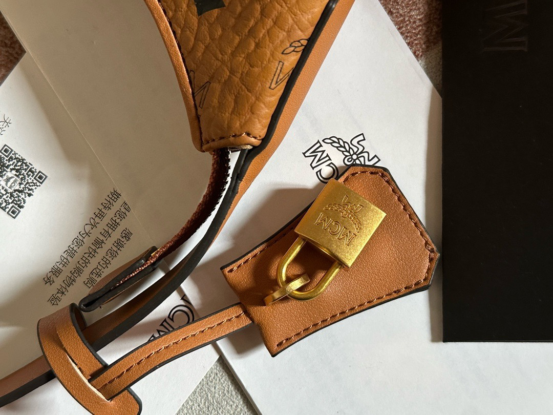 MCM Aren Visetos 老花满印金锁吊坠 潮流Hobo 人造革 腋下包 手提单肩包 小号 女款 棕色干邑色(CB)