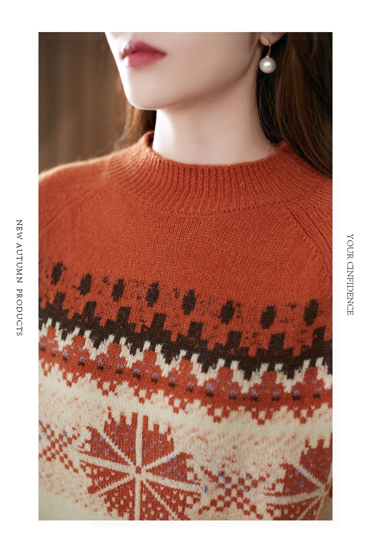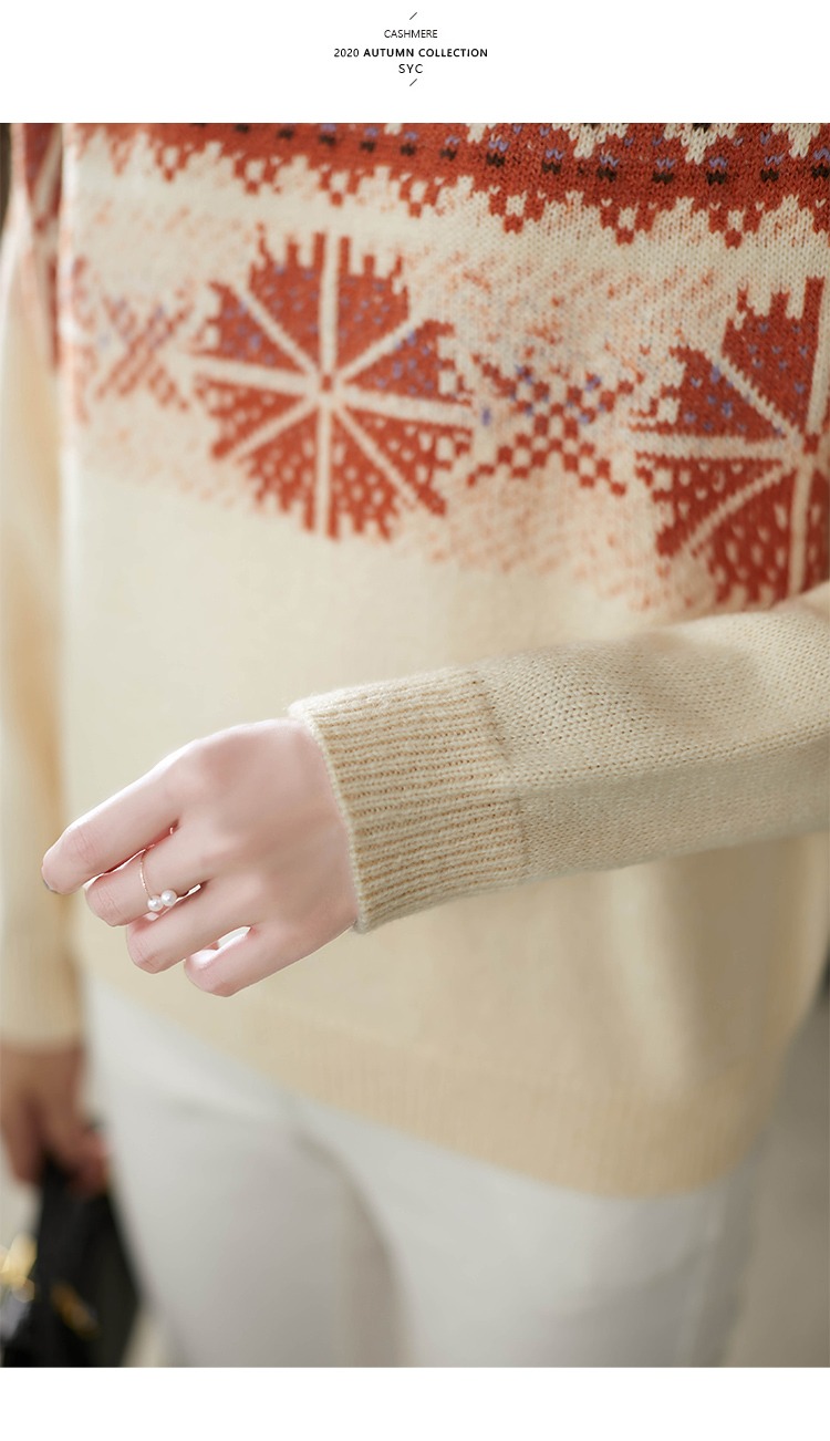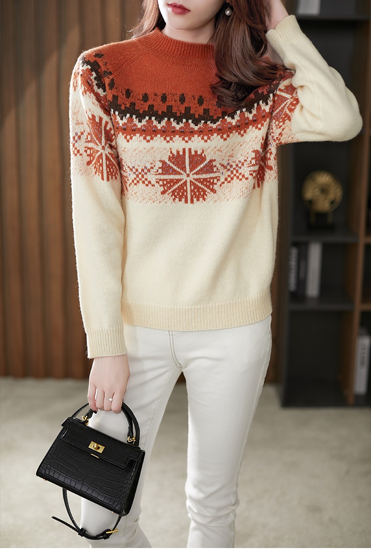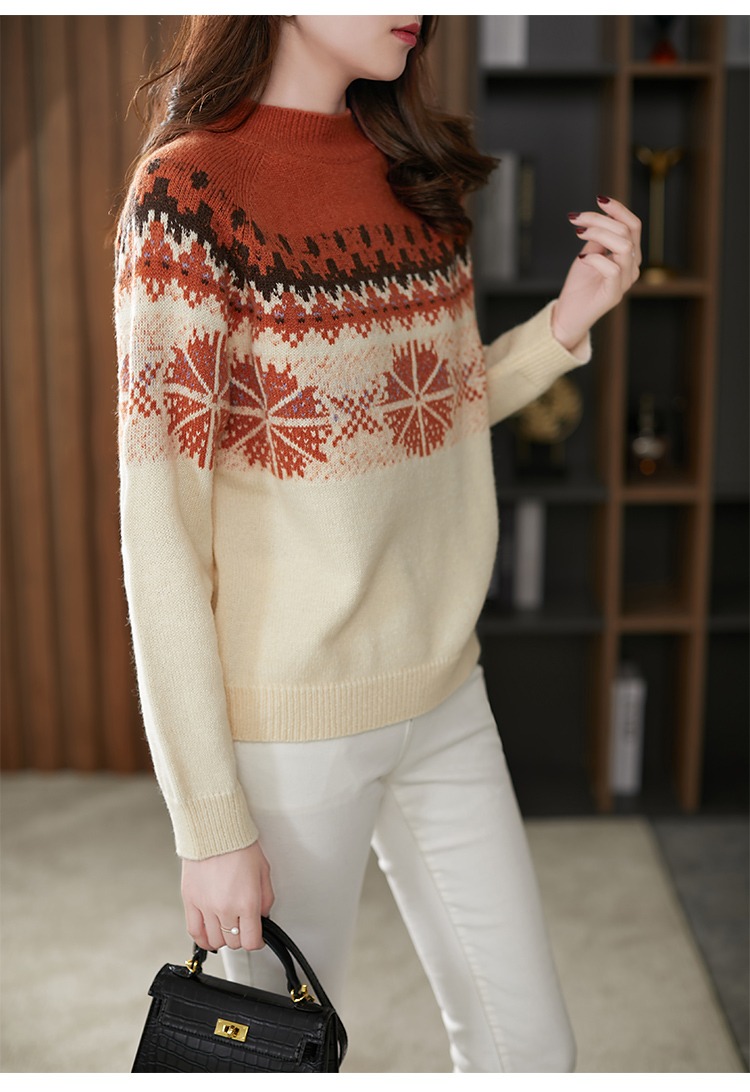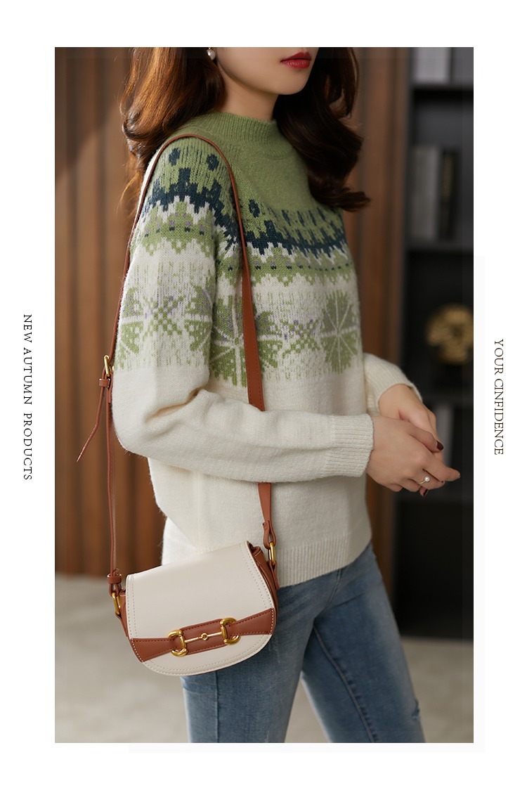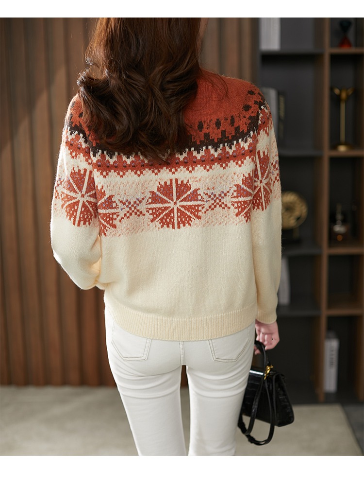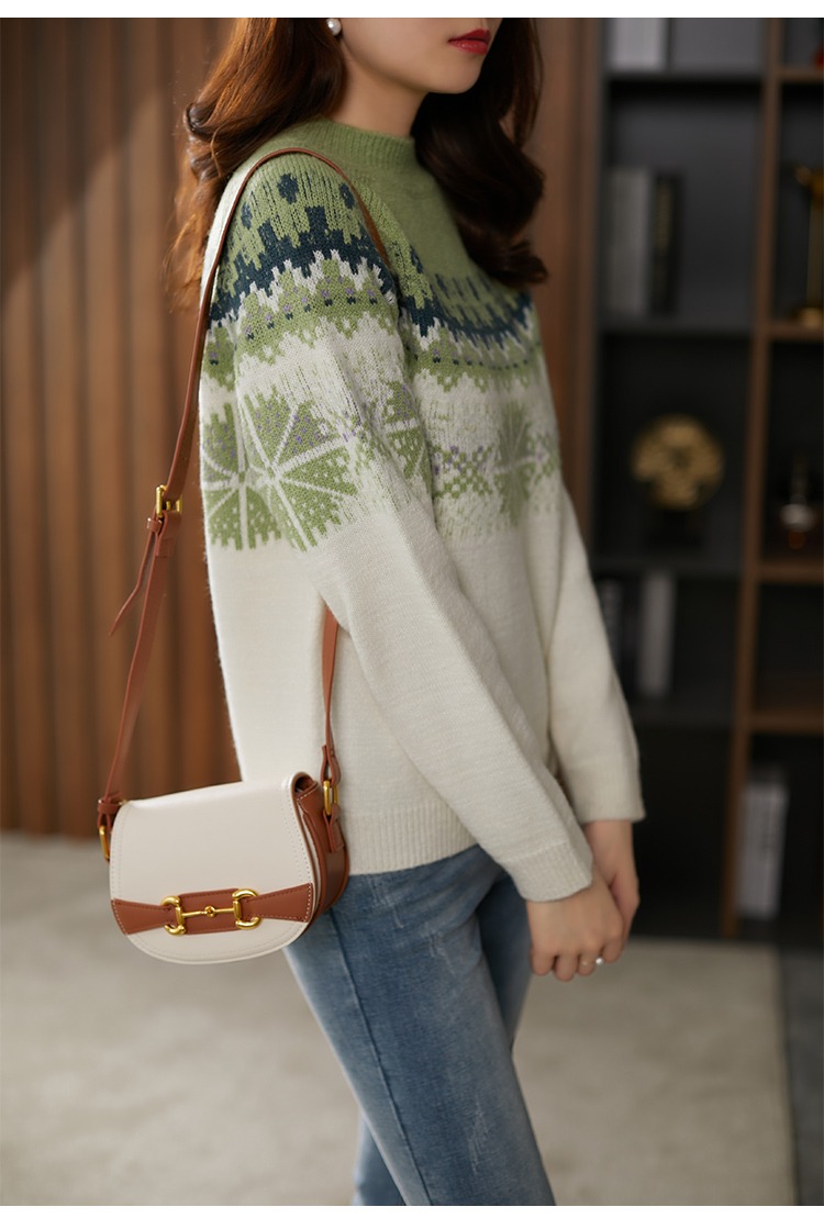 【现货7天】提花毛衣女2023春季新款宽松套头圆领时尚绿色雪花针织衫打底
