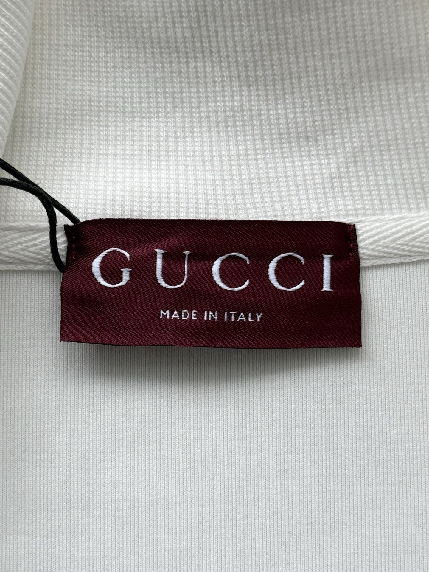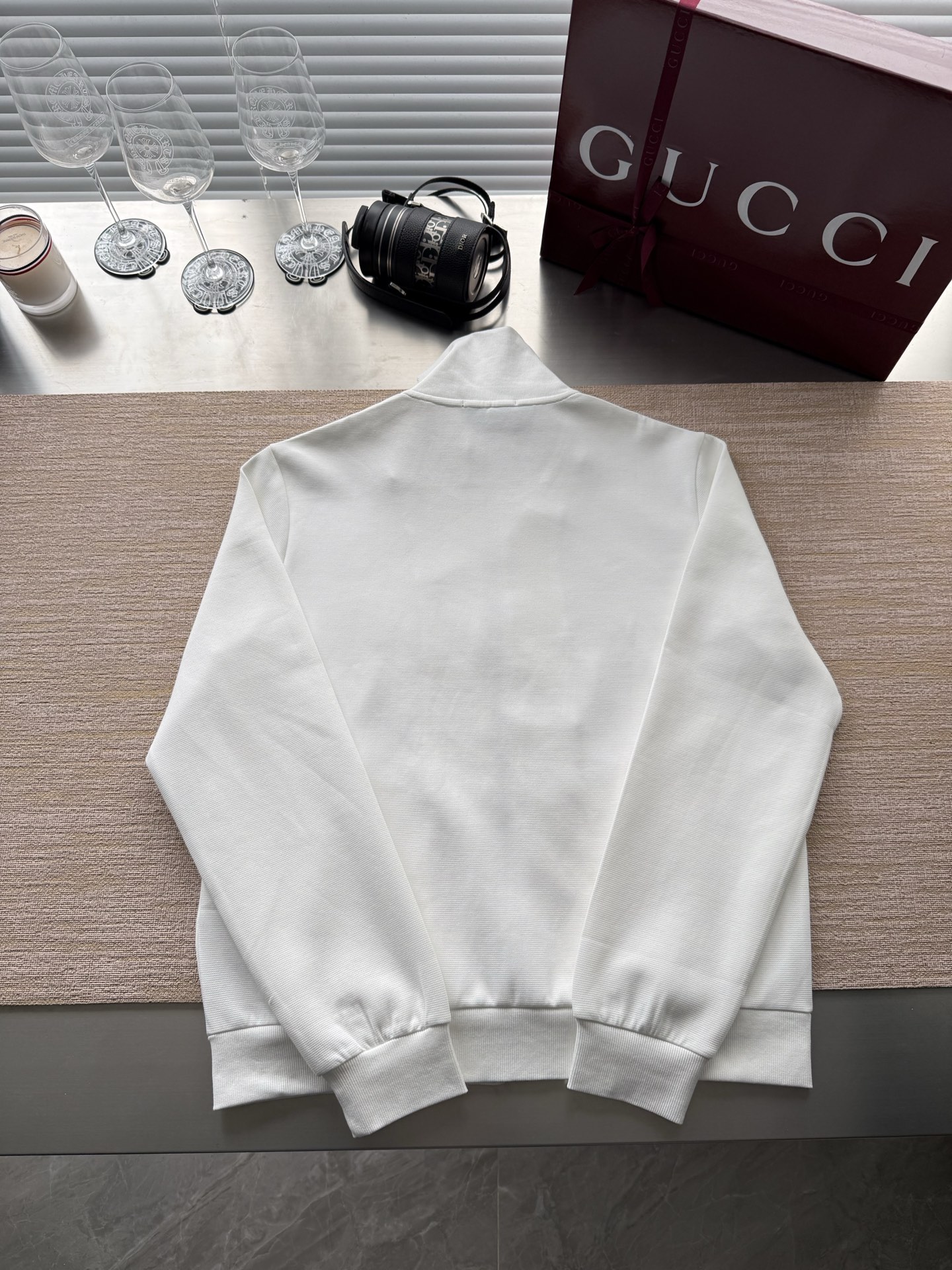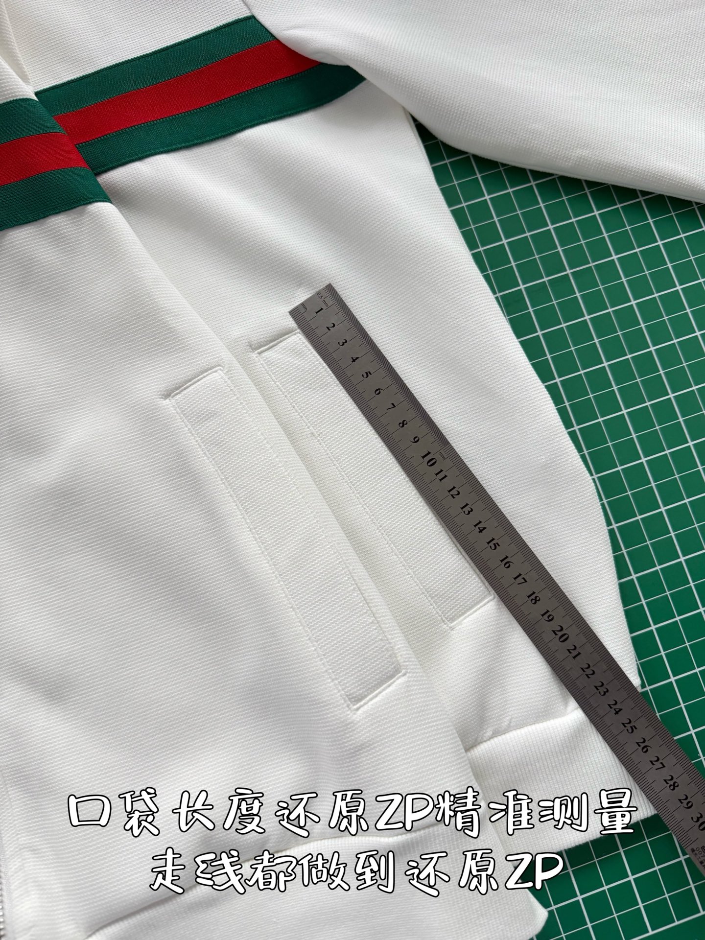 Gucci 2025 FW经典织带拉链外套‼️整件衣服21900购买Zp拆解打造,定制100%白色棉质面料,前幅饰以绿红绿经典织带设计,门襟开模定制GUCCI字母logo拉链,定织标志性罗纹领口 袖口 下摆,超紧密度局部编织,真正做到1:1copy 闭眼入 码数: S M L XL