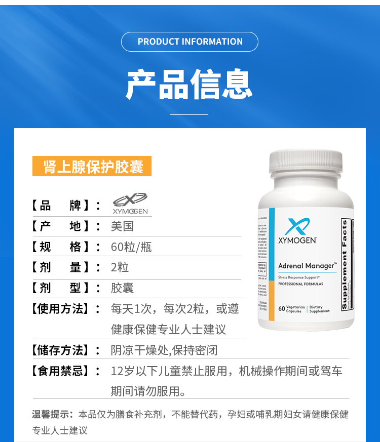 【效期至27年1月】肾上腺保护胶囊 XYMOGEN Adrenal Manager 60粒/瓶