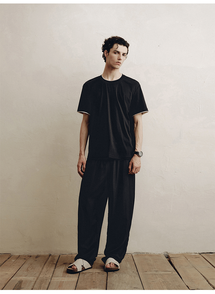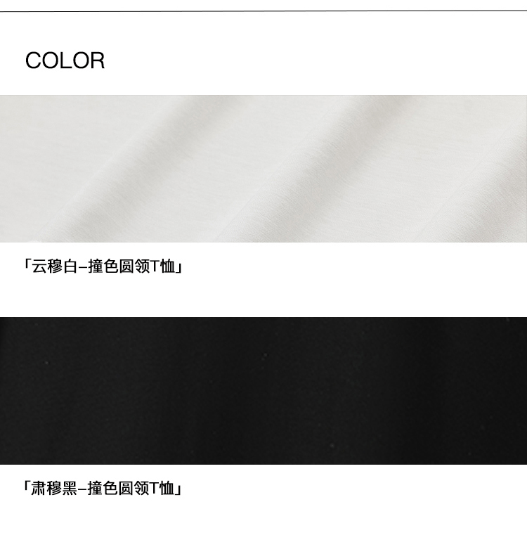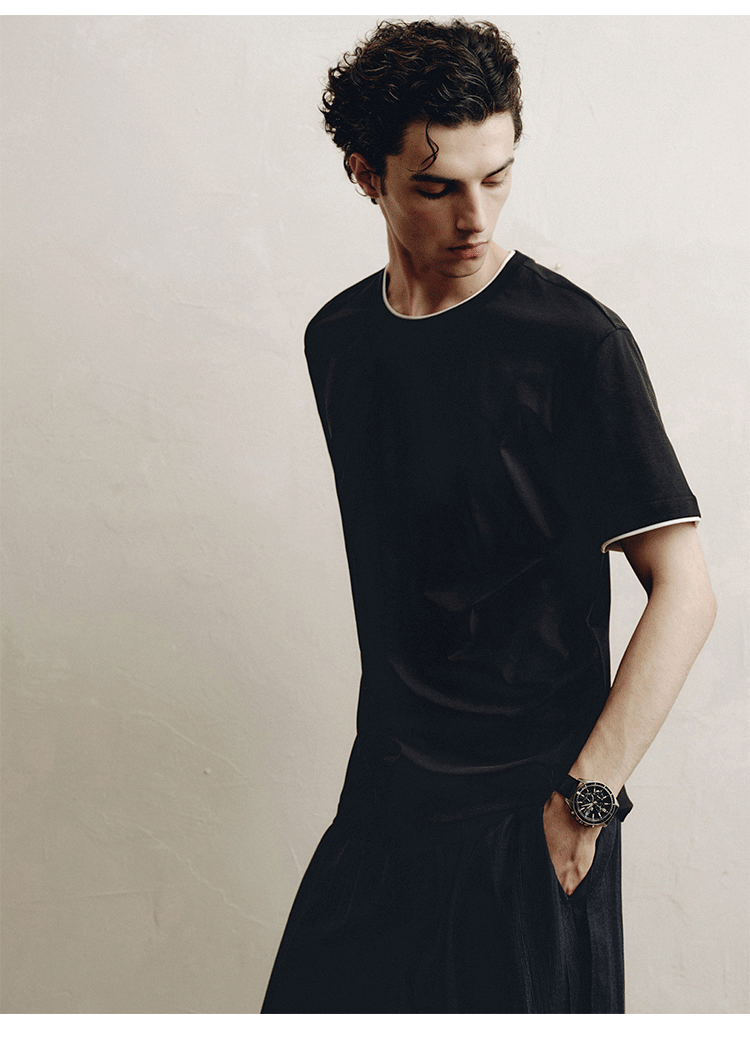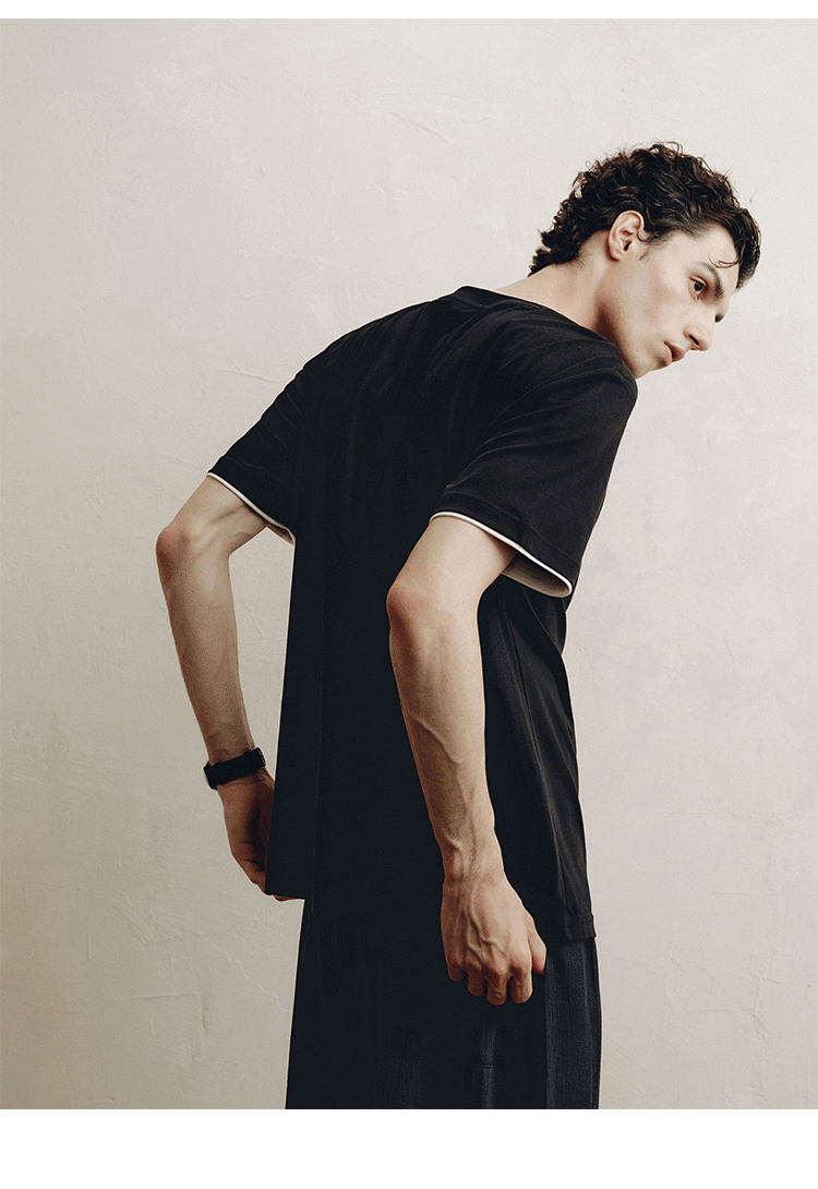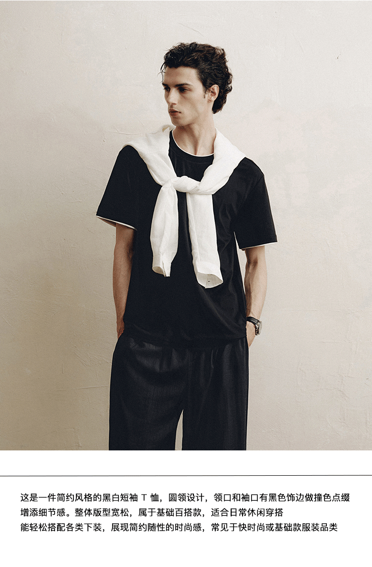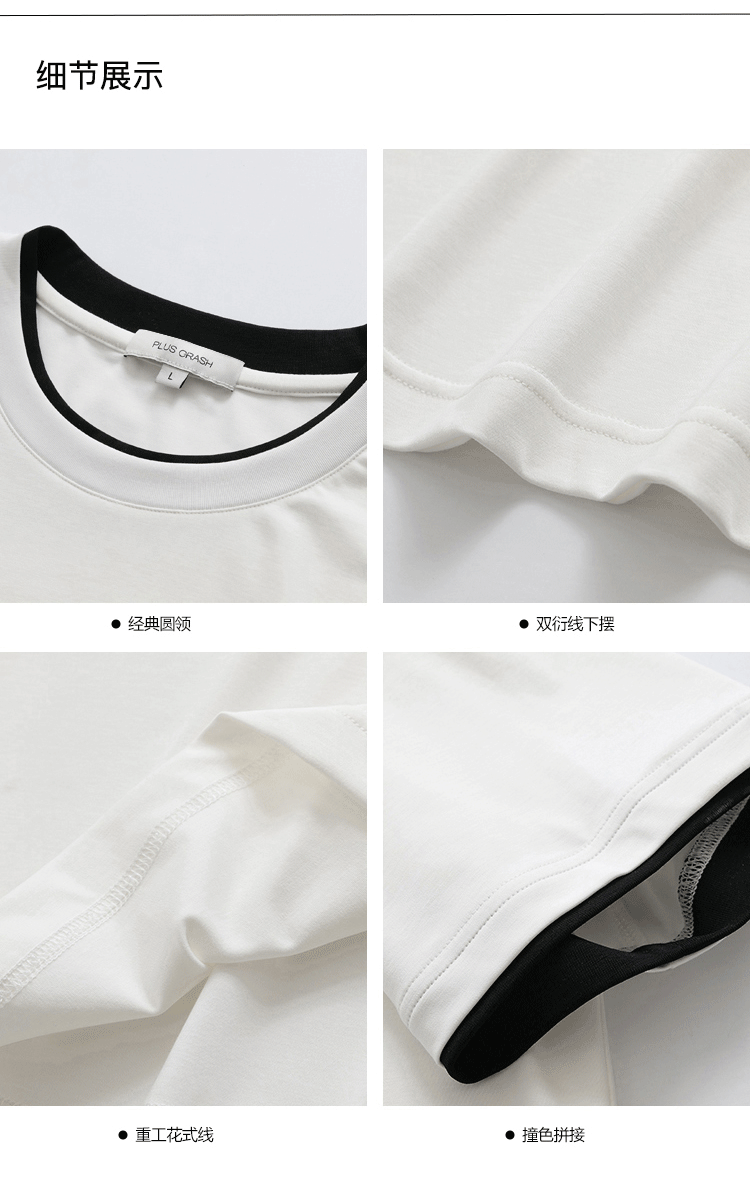 PLUS CRASH轻奢舒适领部双层撞色短T恤港风黑白纯色简约休闲T恤衫