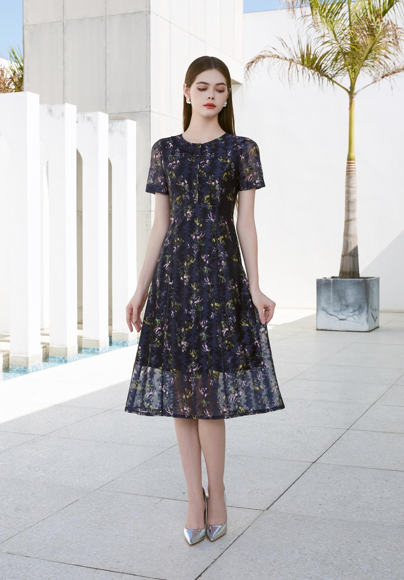 SZ2S65_帝释青_连衣裙_夏季_圆领木耳花边收腰短袖中长款网纱提花_高级女装_BERNIEELEN 伯妮斯茵