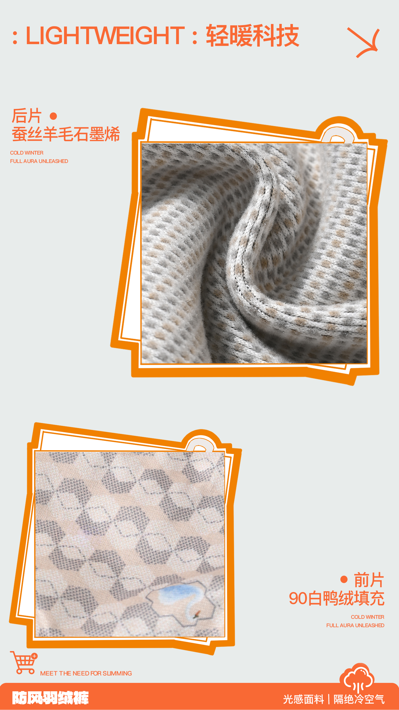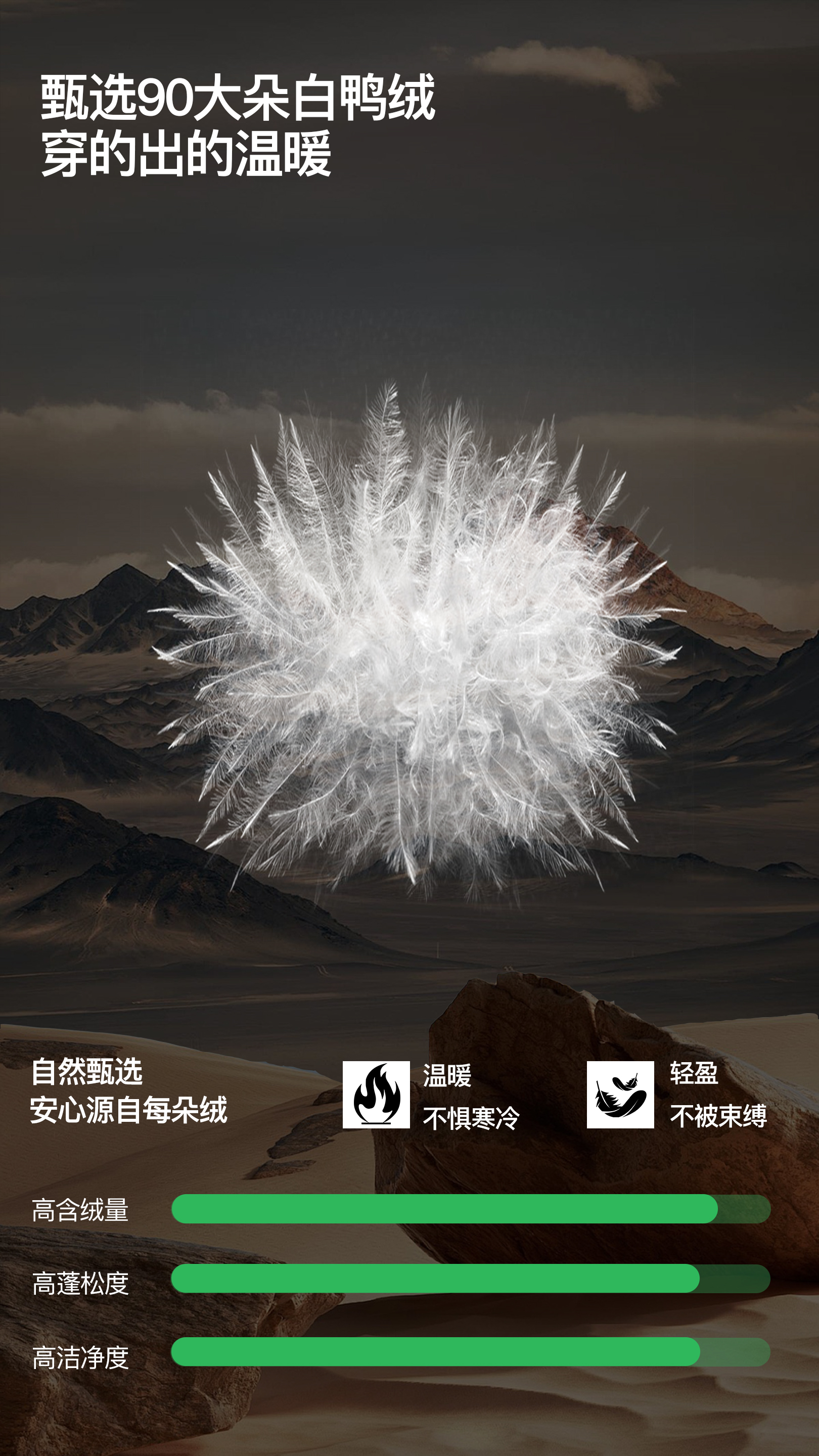 前片填充物:白鸭绒,绒子含量:90%