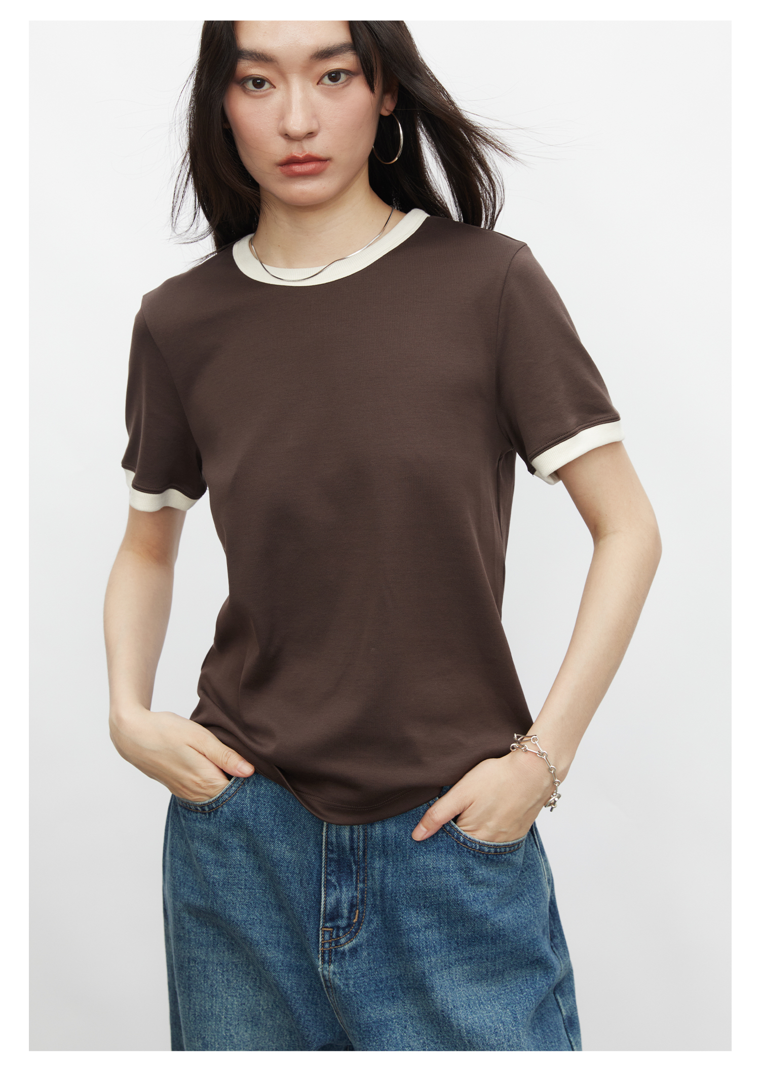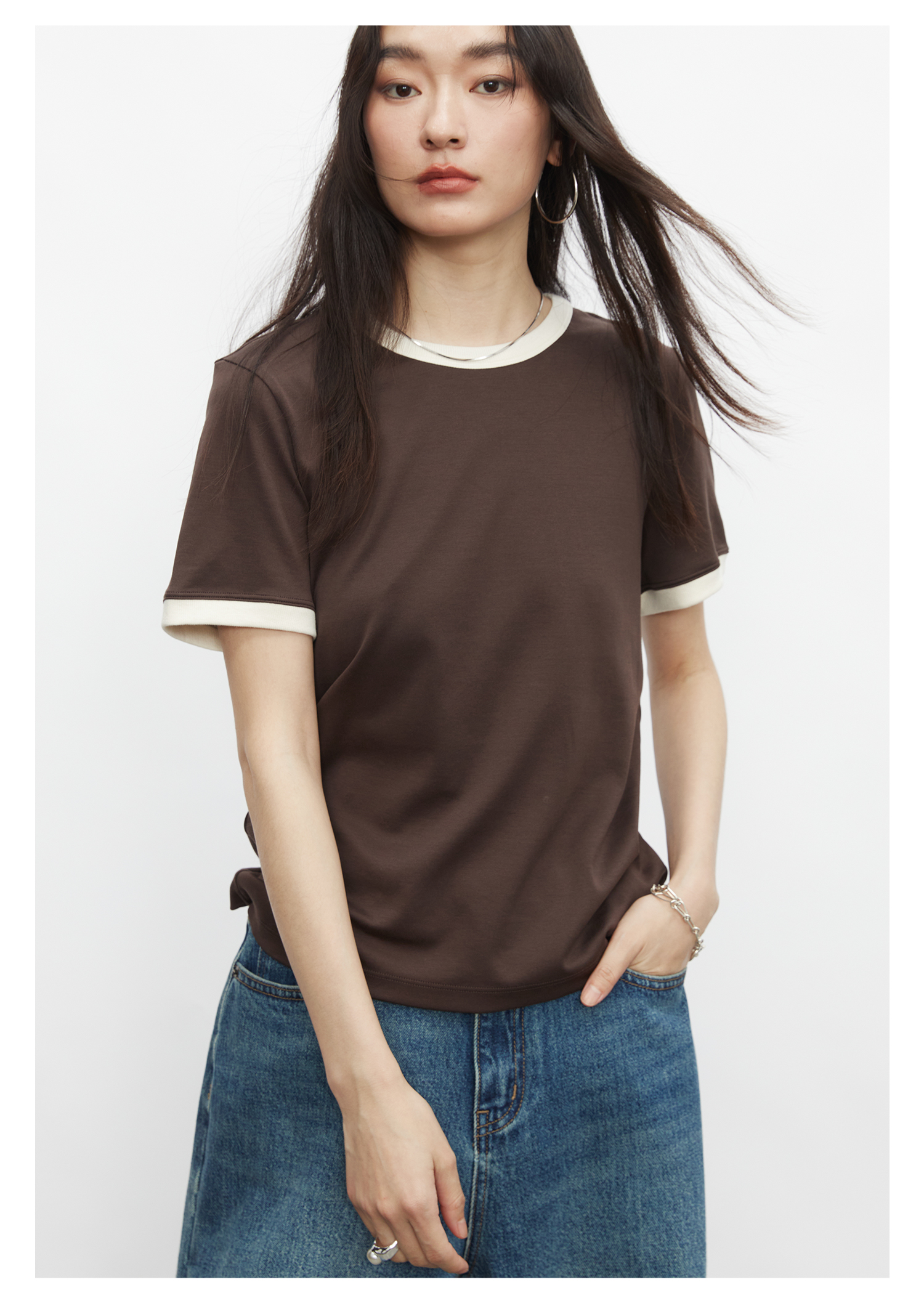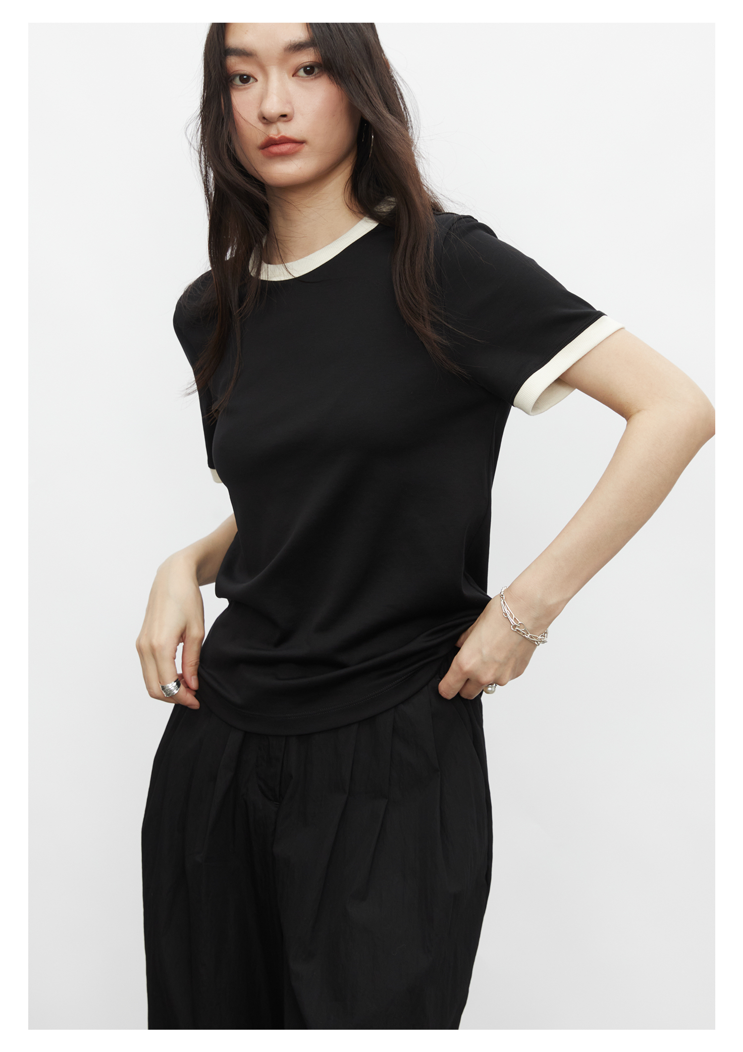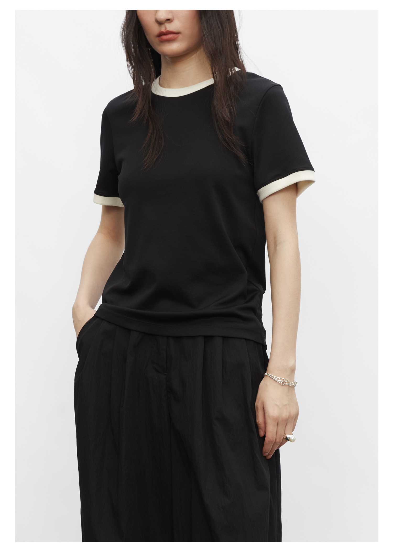 棉仓3431501010 24SS夏季新品多色镶边短袖T恤女真丝棉打底上衣