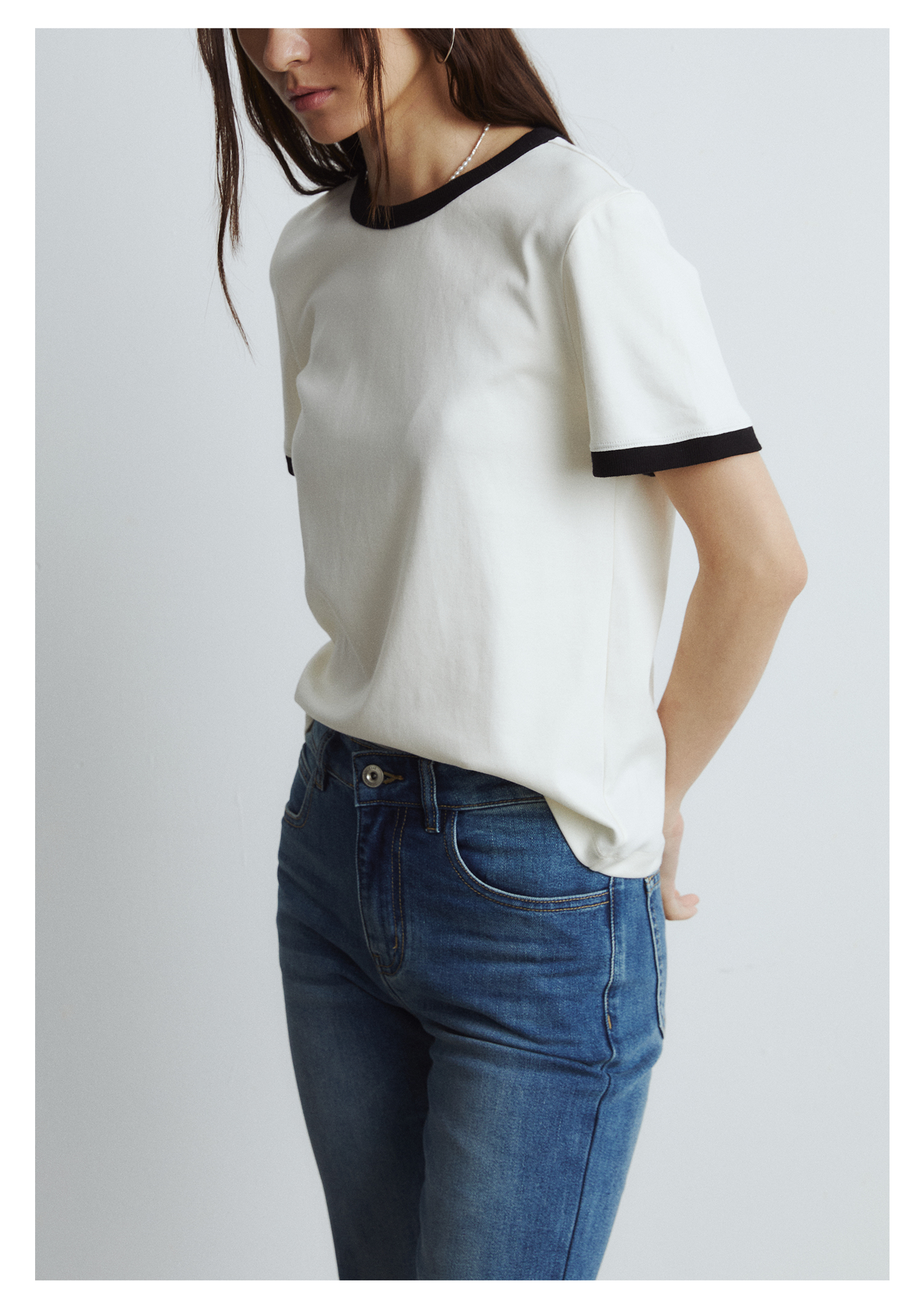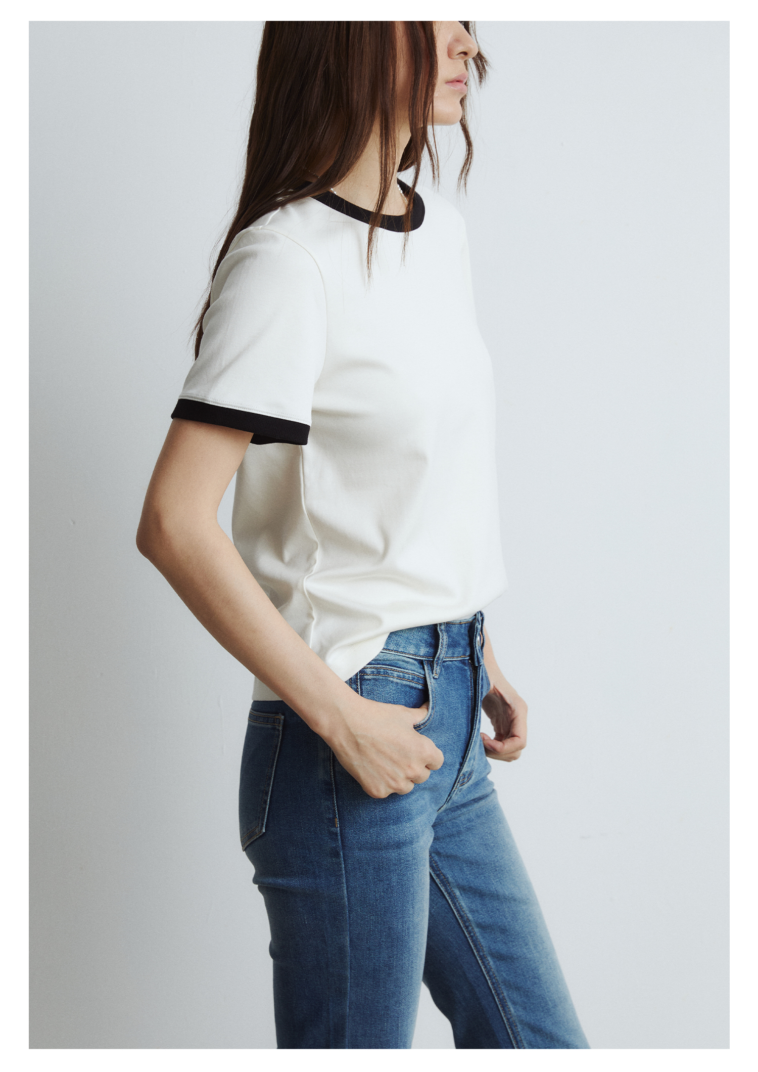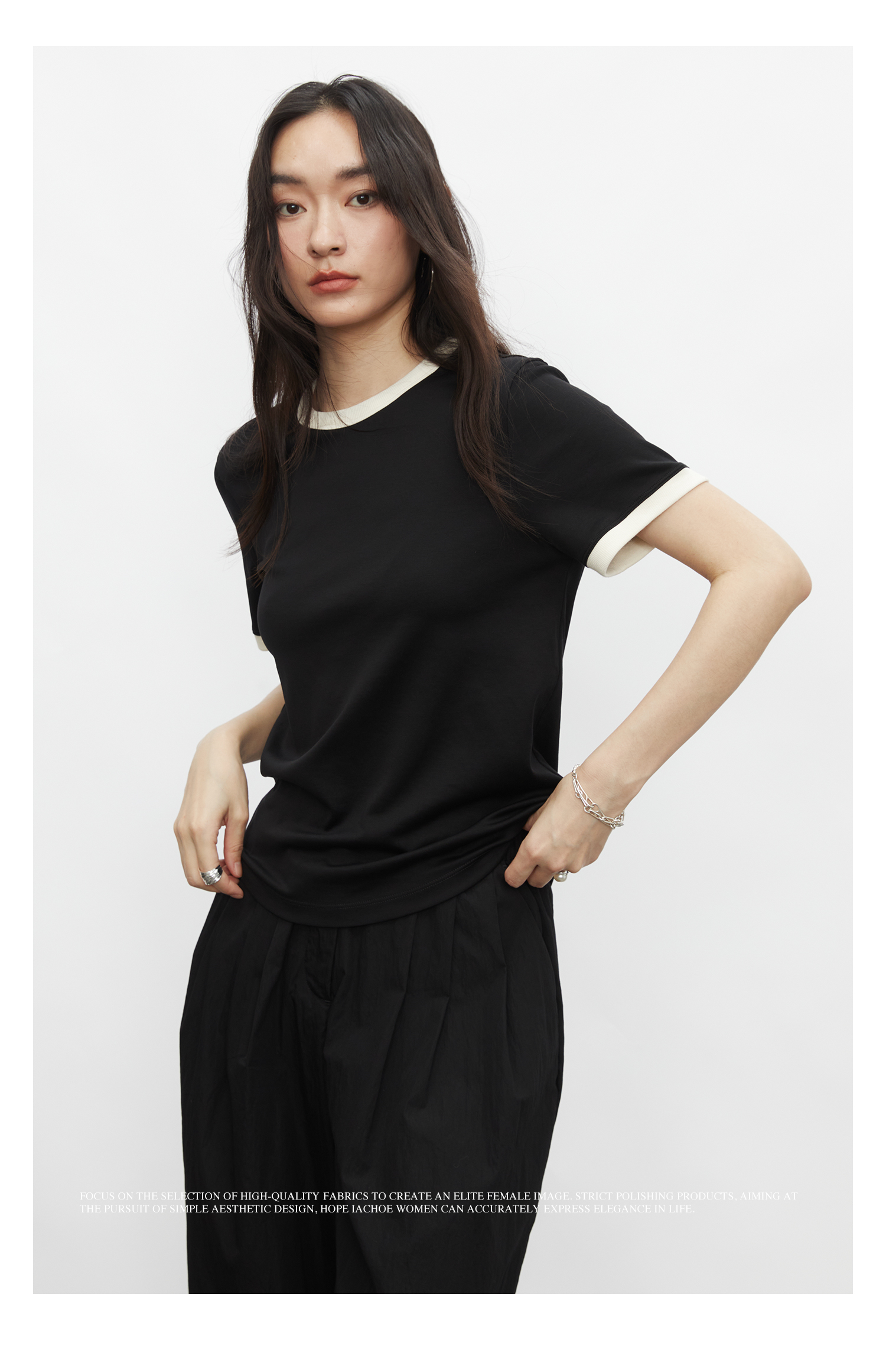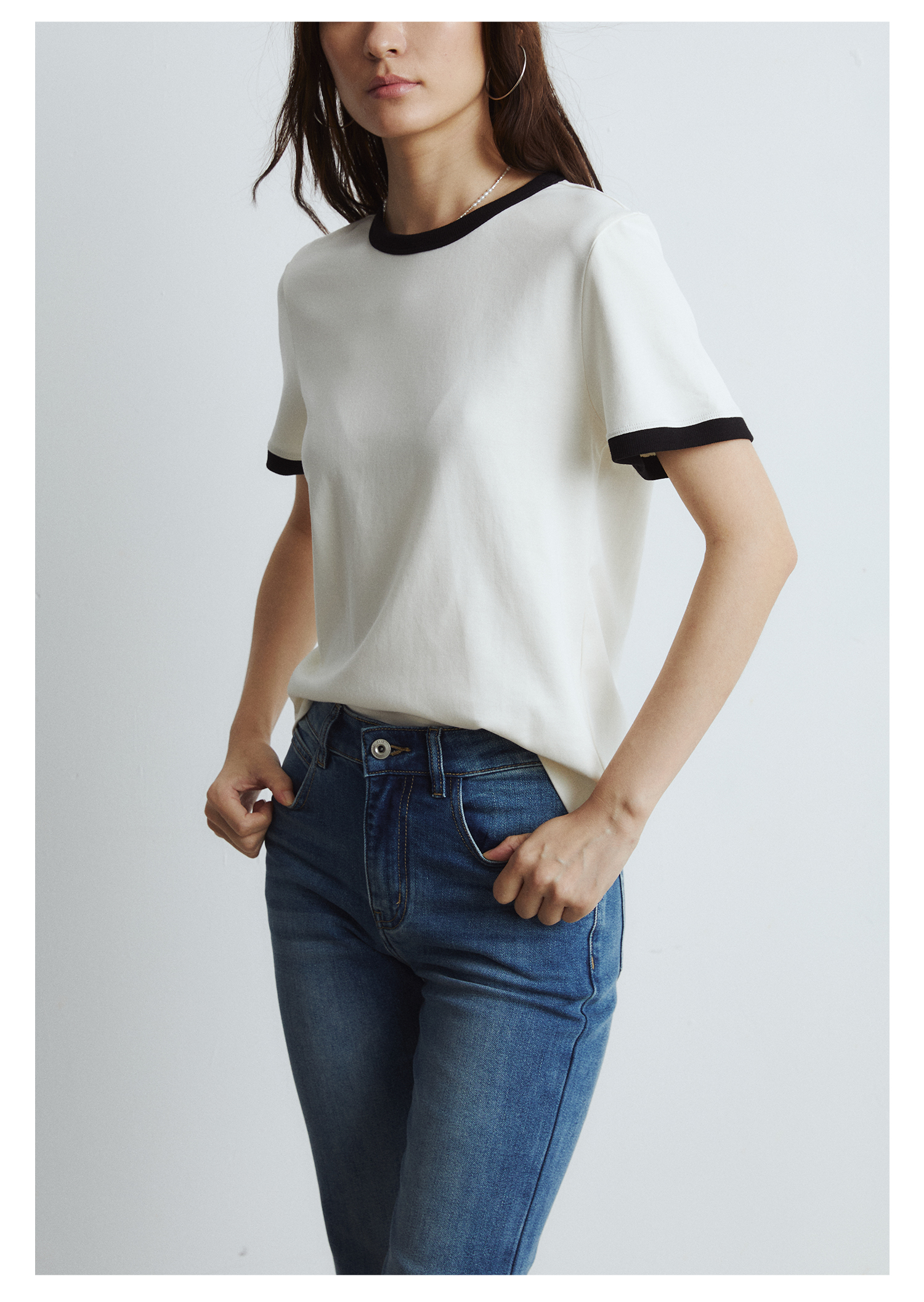 棉仓3431501010 24SS夏季新品多色镶边短袖T恤女真丝棉打底上衣