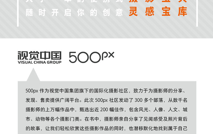 500px作为视觉中国集团旗下专业的国际化摄影社区,致力于为摄影师的分享、发现、售卖提供广阔平台。此次500px社区发动了300多个部落,从数千名摄影师的上万幅作品中,甄选出近200幅佳作,包含风光、人像、人文、城市、动物等各个摄影门类。在书中,摄影师亲自分享了见闻感受及照片背后的故事,让我们轻松欣赏优质摄影作品的同时,也潜移默化地找到属于自己的摄影方向和创作灵感。这本书也让我们了解世界各地发生过的或有趣或惊险的故事,体悟生活中转瞬即逝的美好瞬间,感受城市的建筑所承载的历史,探索自然世界里无穷无尽的奥秘……世间所有的美好都因此而触手可及。