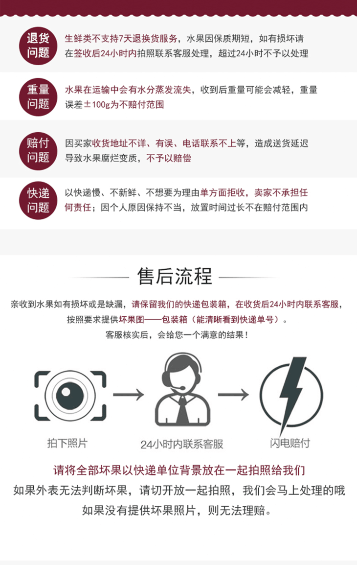 坏果包赔, 签收后24小时内,提供坏果+面单拍照联系在线客服赔付,
