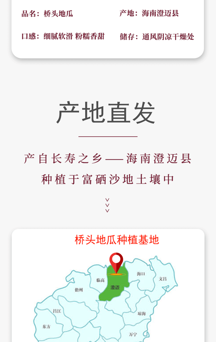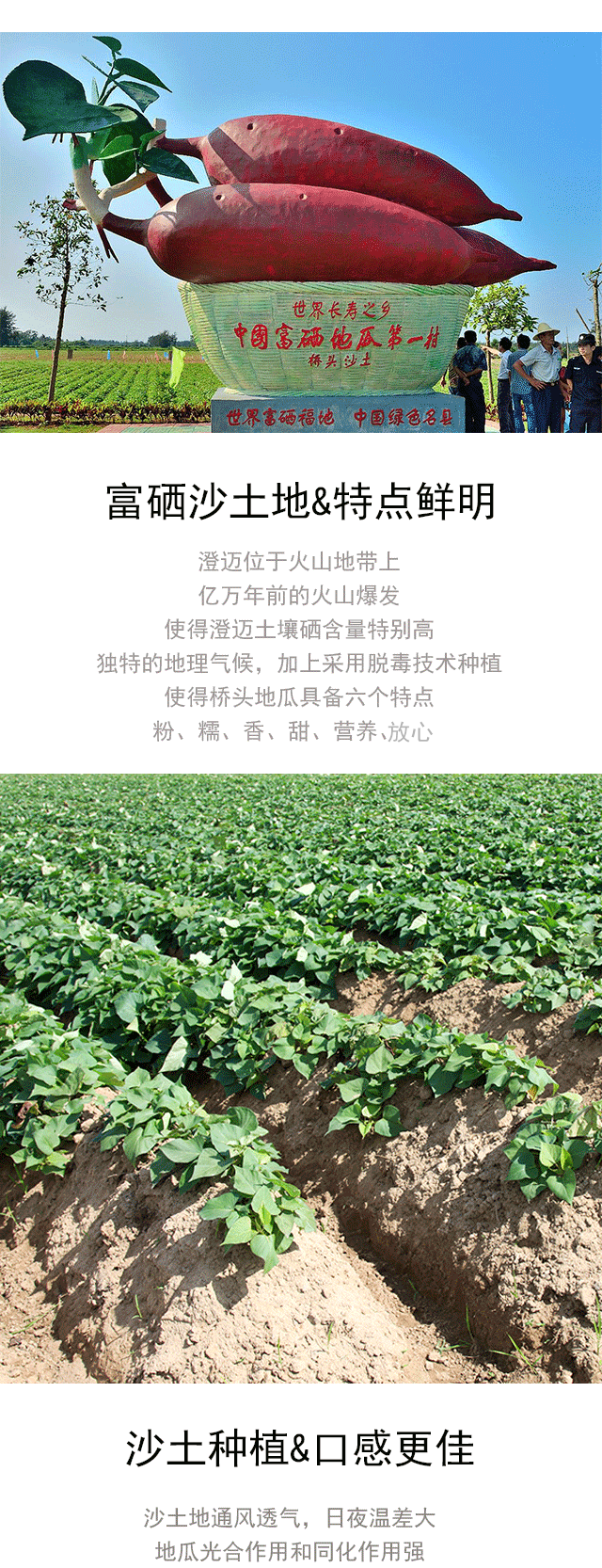 澄迈县位于海南岛西北部,自然环境优越,是有名的“富硒福地”,也是由联合国授予的“世界长寿之乡”,这里盛产桥头地瓜!