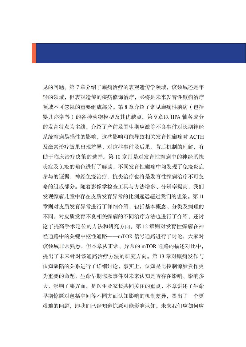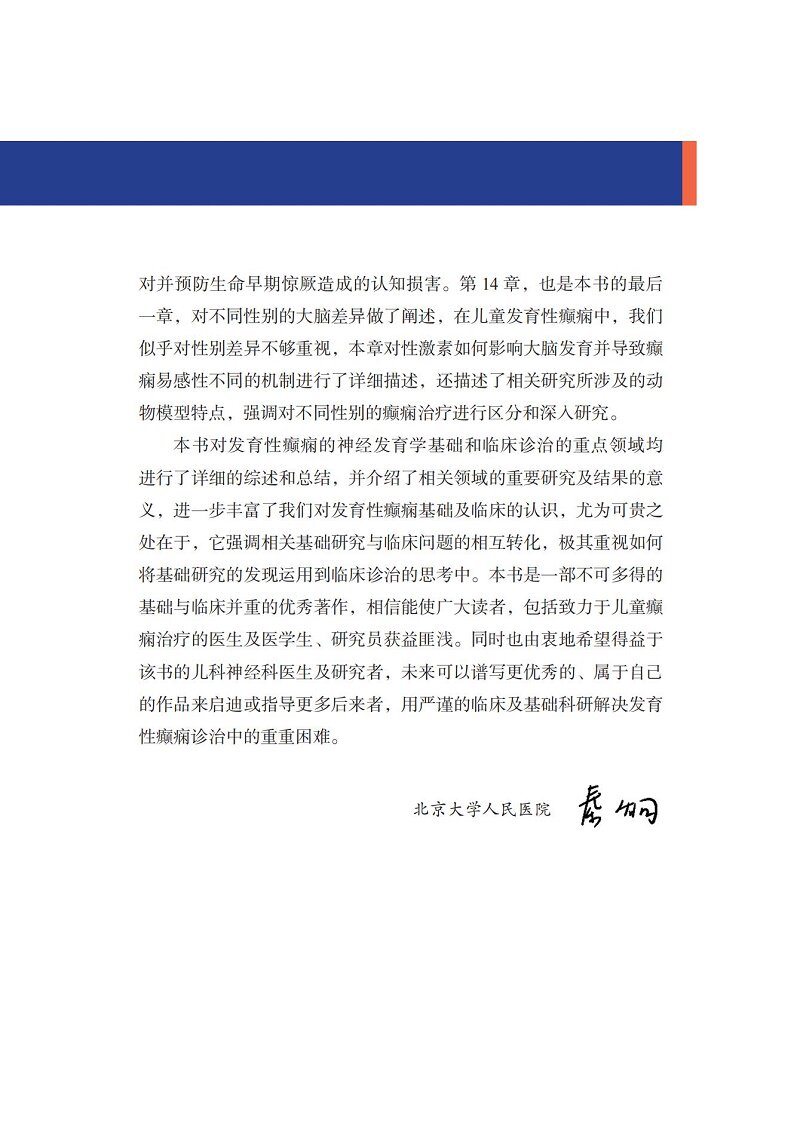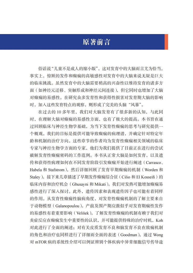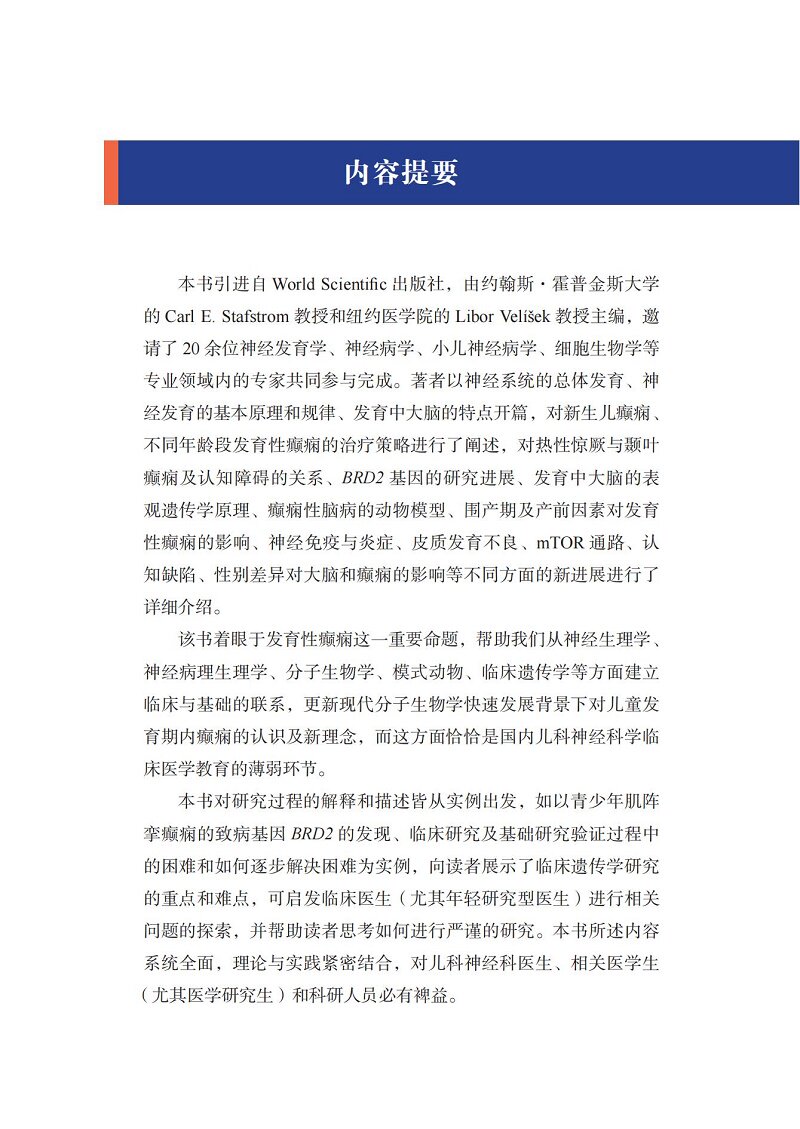 该书着眼于发育性癫痫 这一重要命题,帮助我们从 神经生理学、神经病理生理 学、分子生物学、模式动物 、临床遗传学等方面建立临 床与基础的联系, 新现代 分子生物学快速发展背景下 对儿童发育期内癫痫的认识 及新理念,而这方面恰恰是 儿科神经科学临床医学 教育的薄弱环节。