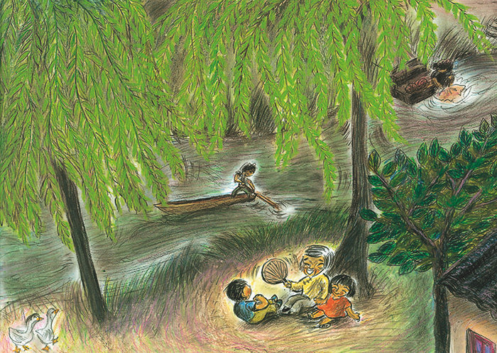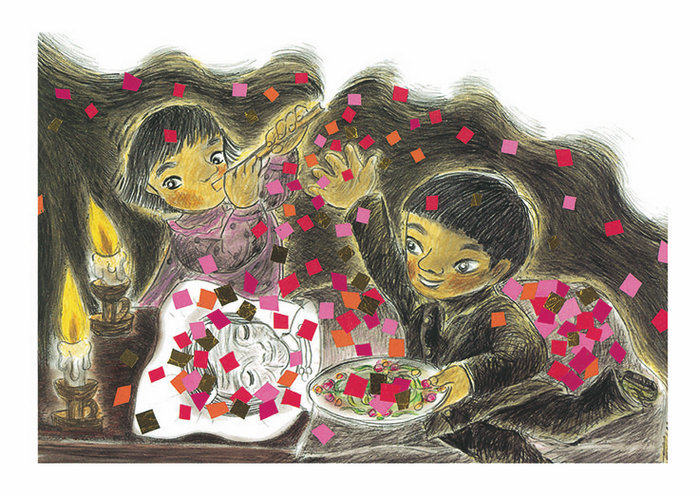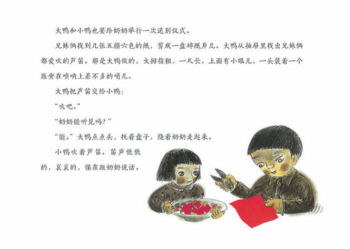 本书讲述的是12岁的哥哥大鸭和8岁的妹妹小鸭为奶奶守夜的故事。在两个孩子独自守夜的这个晚上,他们回忆起奶奶的歌谣、奶奶的操劳,还有奶奶的爱与守护……在回忆中,他们渐渐不再害怕,也不再悲伤。两个孩子以自己独特的方式为奶奶举办了一场告别仪式,在芦笛声和花纸片儿中送奶奶去到了一个好地方。