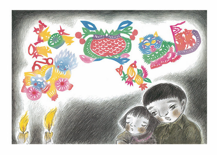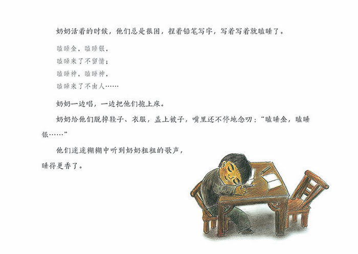 我们小心地翻看第3页、第4页,大鸭和小鸭相拥相依,悲哀地、惊恐地看着乡亲们处理亲人的后事,这是深重的悲凉;第5页、第6页,烛光摇曳,各种怜悯、伤感的眼神投向小兄妹,他们正走过来准备为奶奶守夜,小鸭还在抖,她小哇,他们能扛得住吗,能为老人守上这最后的一夜吗?烛火摇晃起来,唉,替人垂泪的蜡烛……好难受哇:翻过去吧,翻过去吧,无论怎样,这一页请大伙儿帮忙翻过去吧。