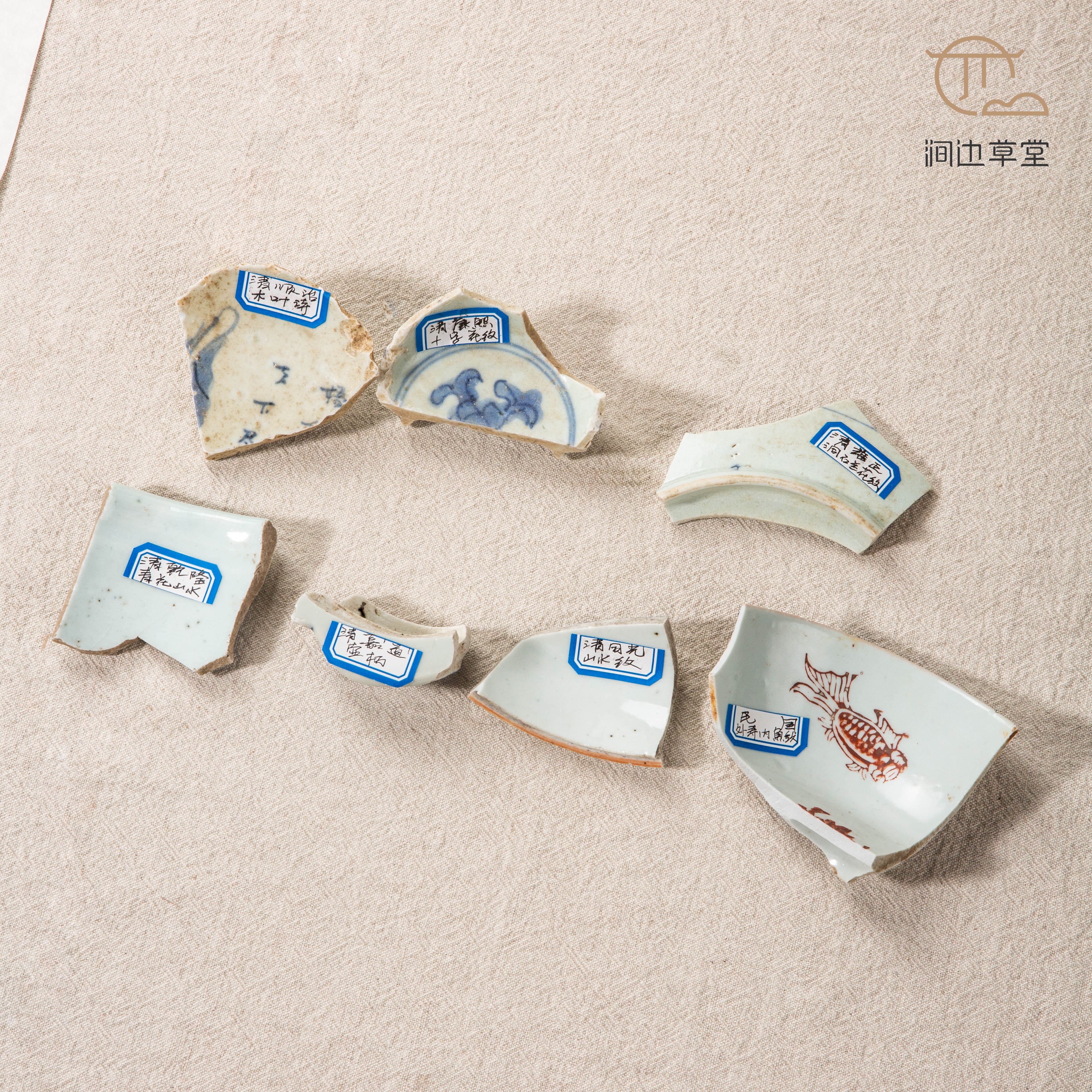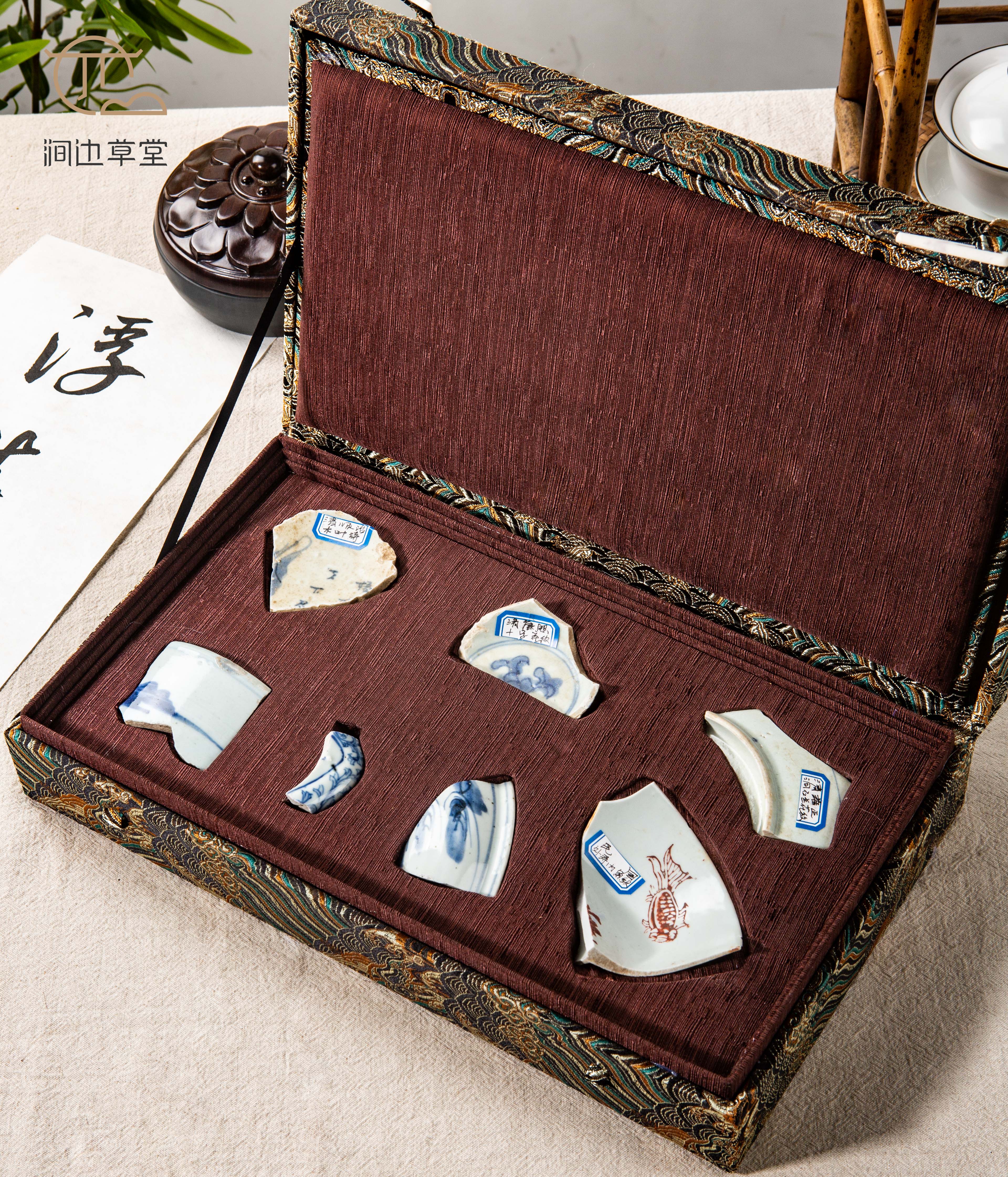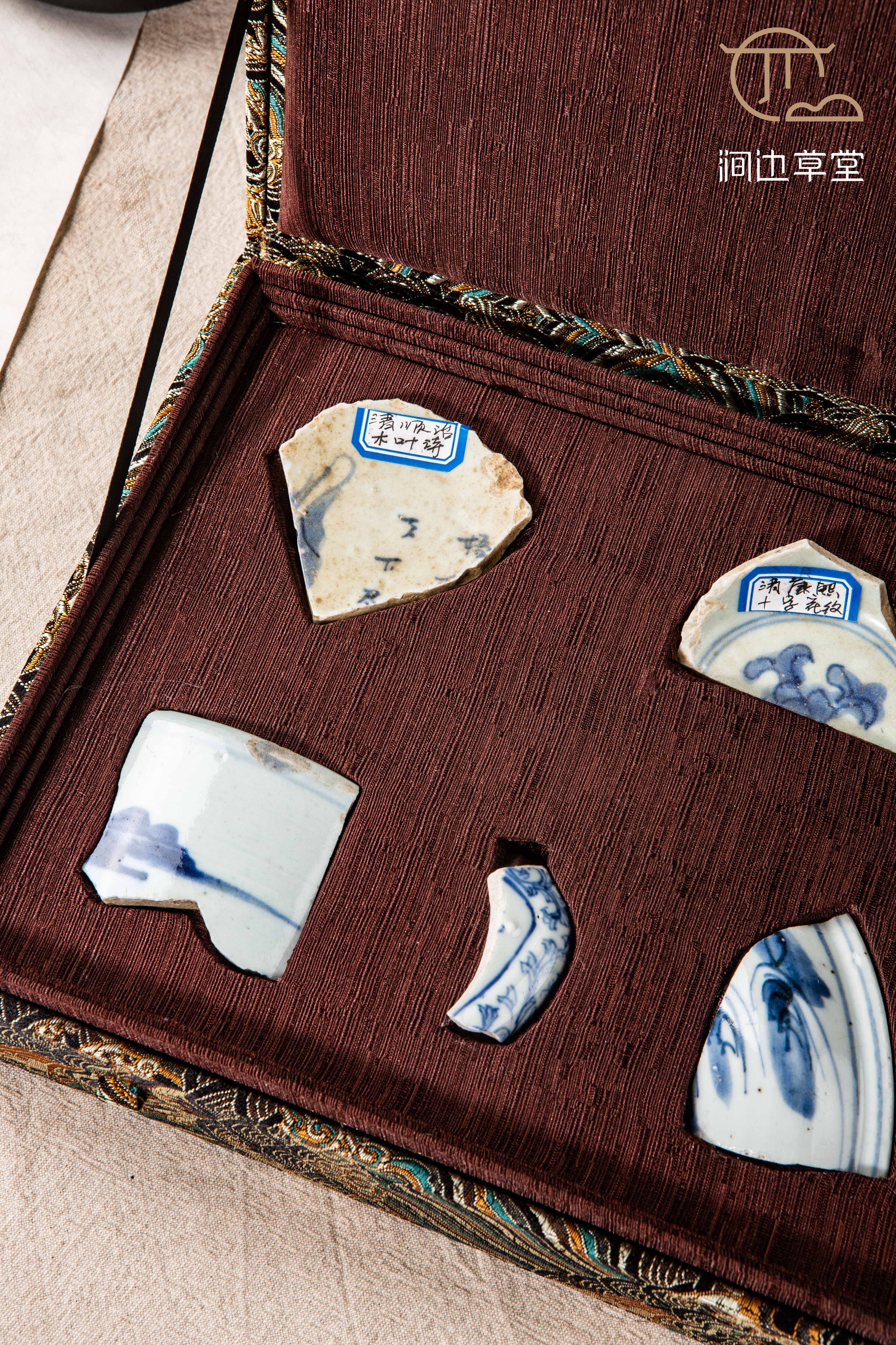 清代青花瓷标本全套,一套7片,分别是:清顺治时期木叶诗、清康熙时期十字花纹、清雍正时期洞石兰花纹、清乾隆时期青花山水、清嘉道时期壶柄、清同光时期山水纹、民国时期外寿内鱼纹,是学习清代瓷器的优良范本,配有高档锦盒,同时也是收藏佳品。
