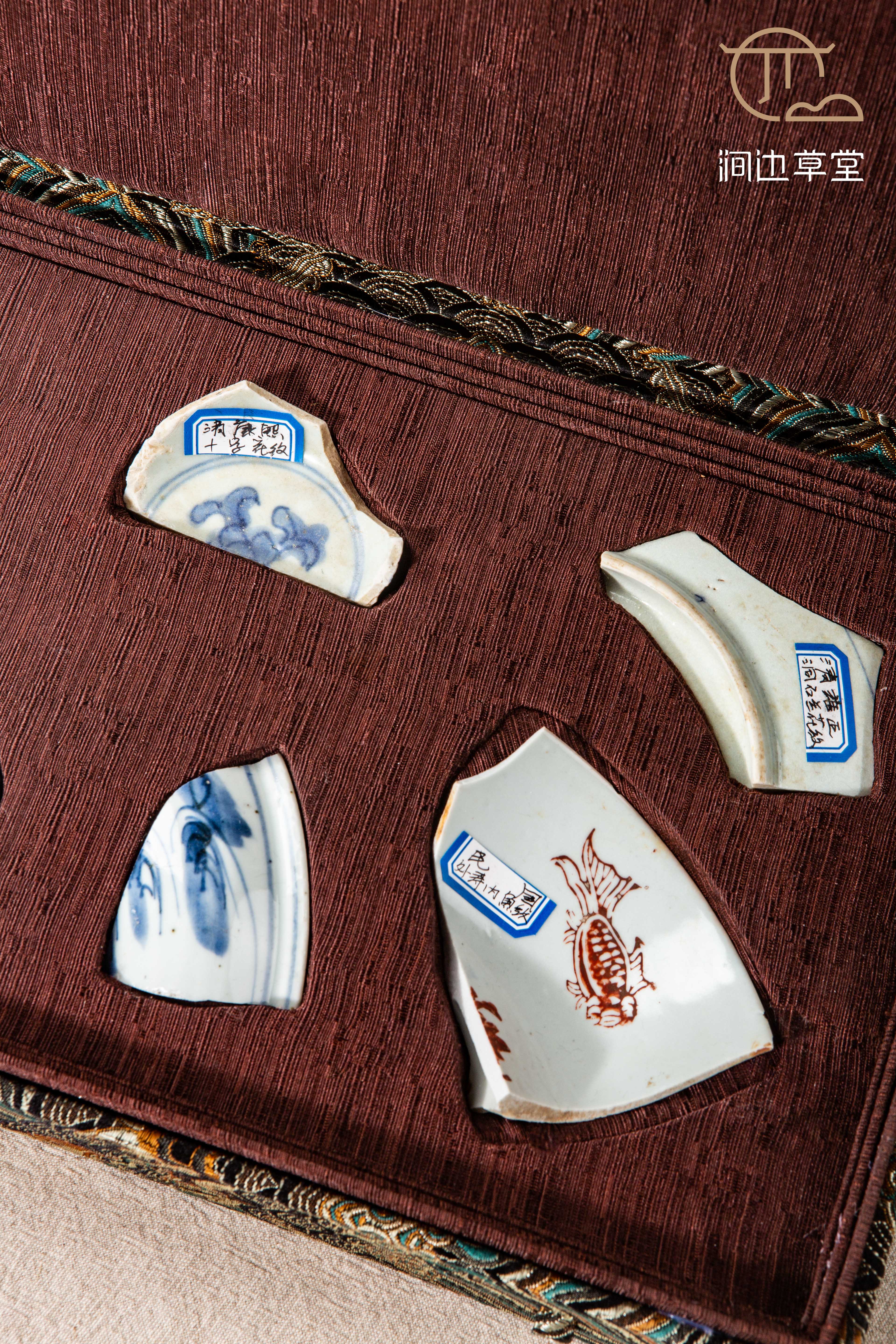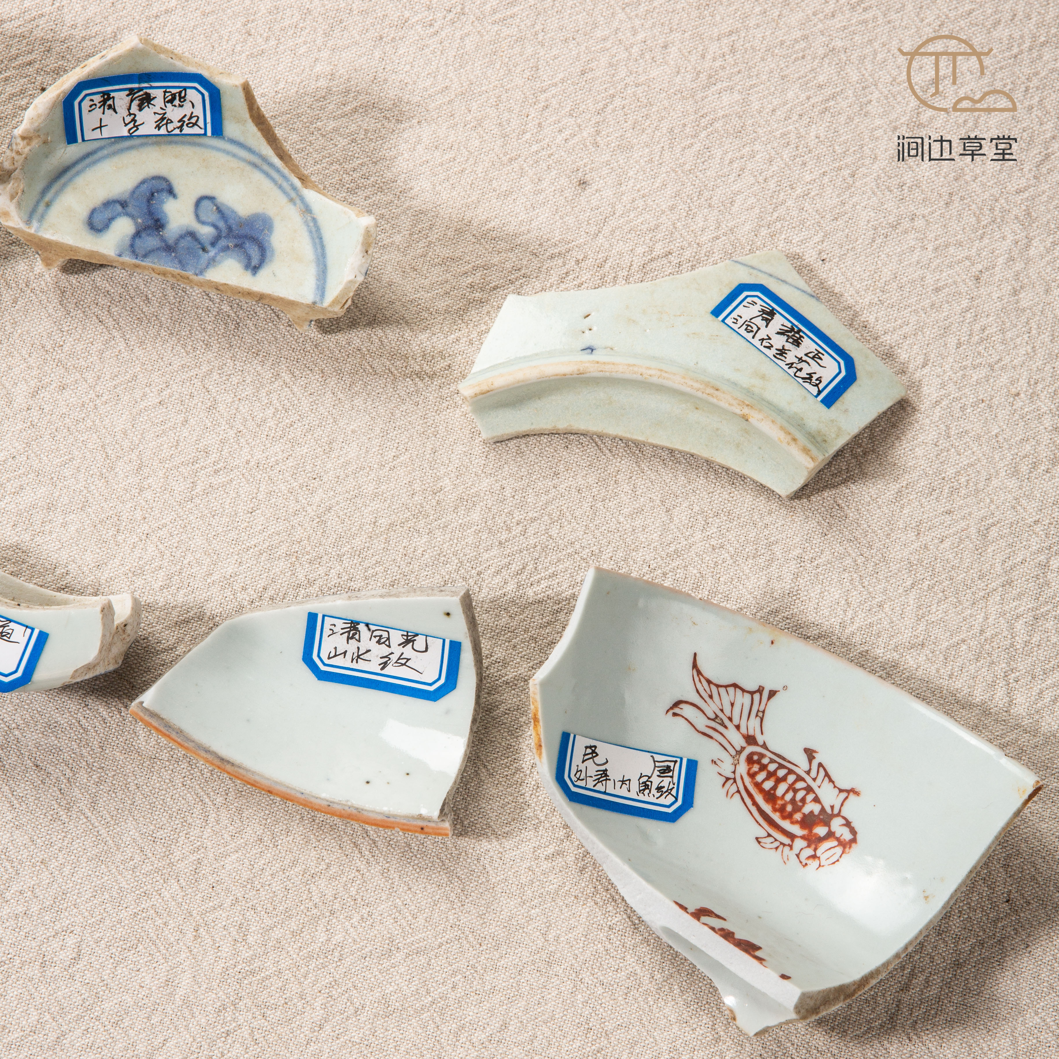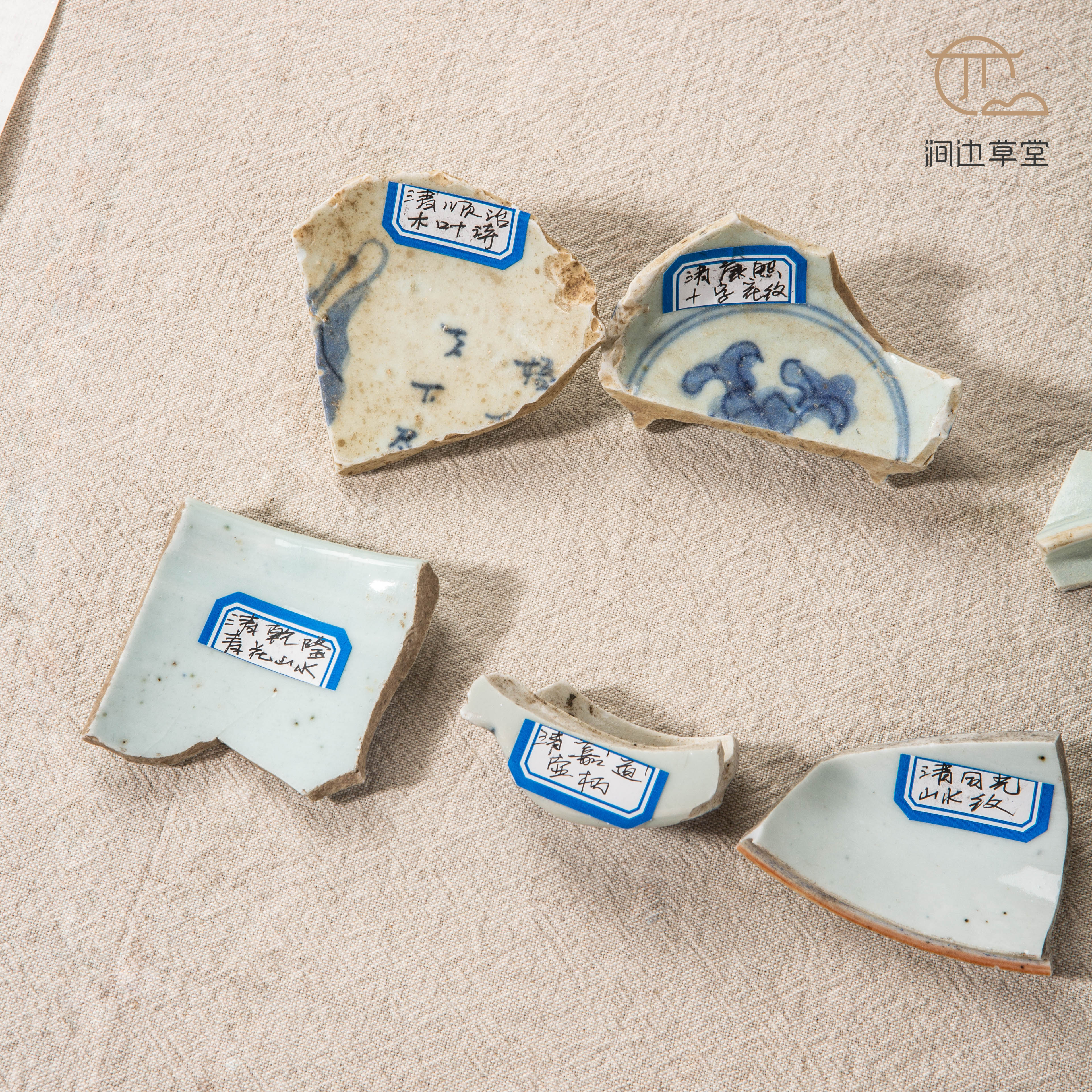 清代青花瓷标本全套,一套7片,分别是:清顺治时期木叶诗、清康熙时期十字花纹、清雍正时期洞石兰花纹、清乾隆时期青花山水、清嘉道时期壶柄、清同光时期山水纹、民国时期外寿内鱼纹,是学习清代瓷器的优良范本,配有高档锦盒,同时也是收藏佳品。