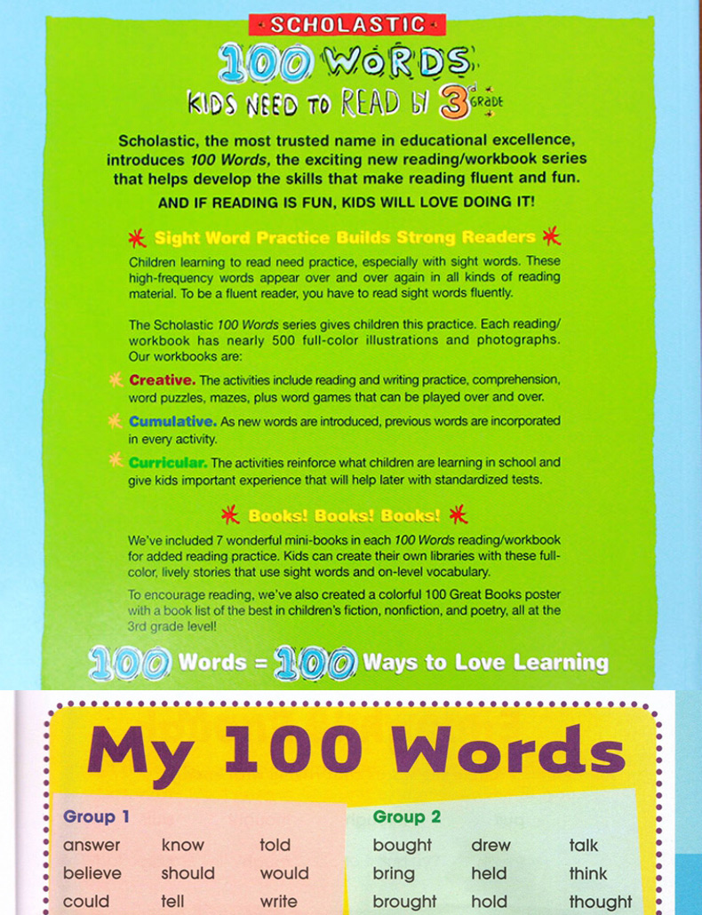The Scholastic100 Words series gives children thispractice. Each reading/workbook has nearly 500 full-color illustrations and photographs. Our workbooks are: