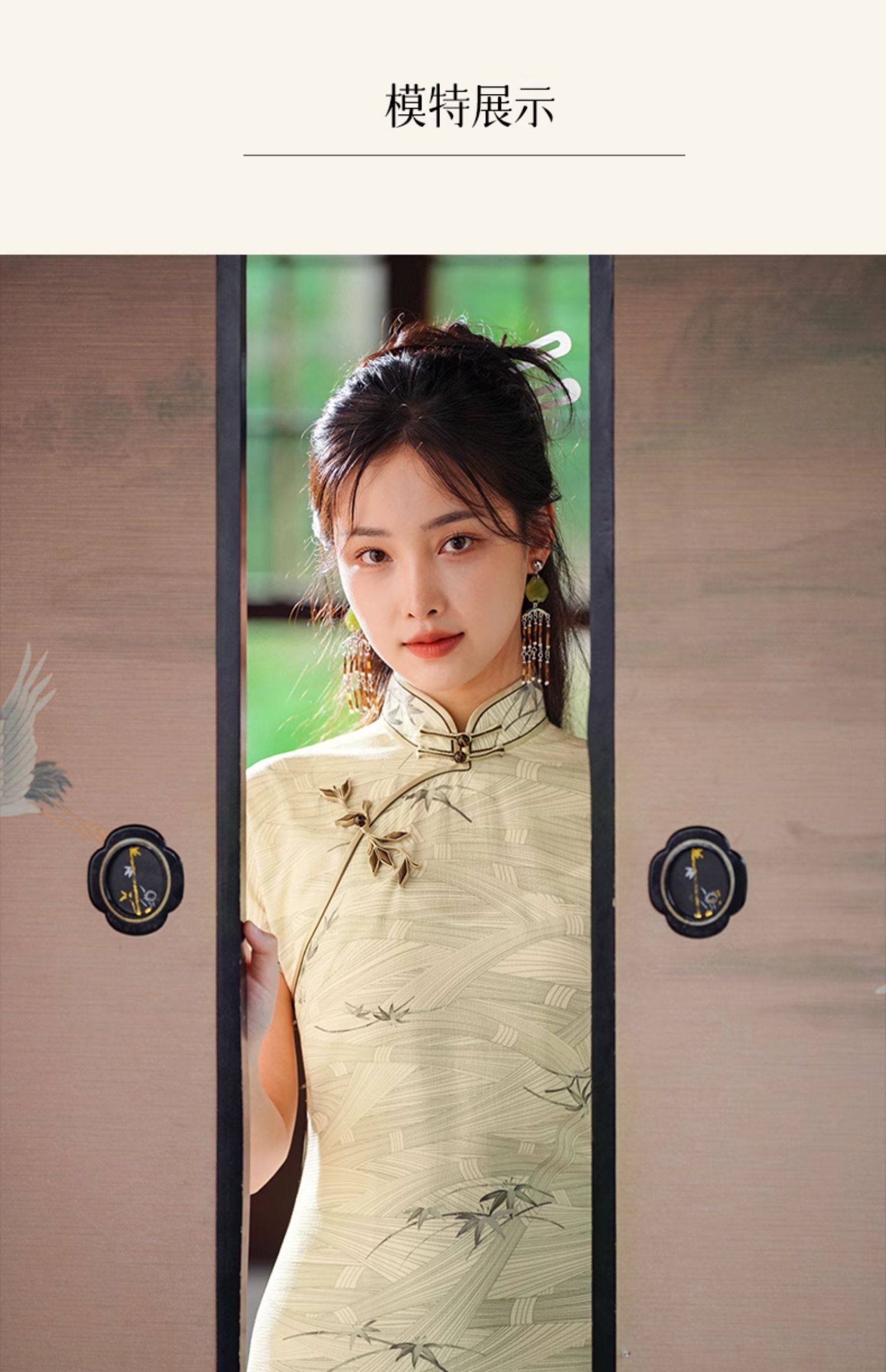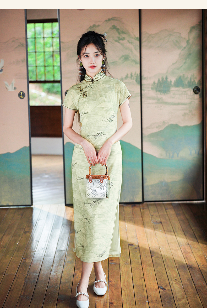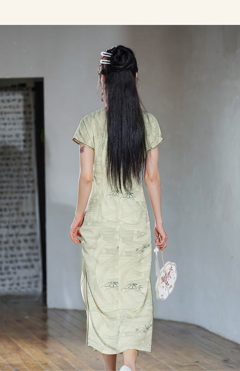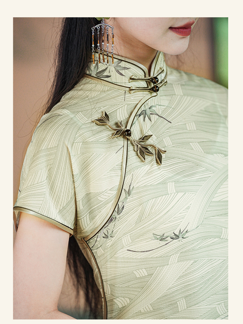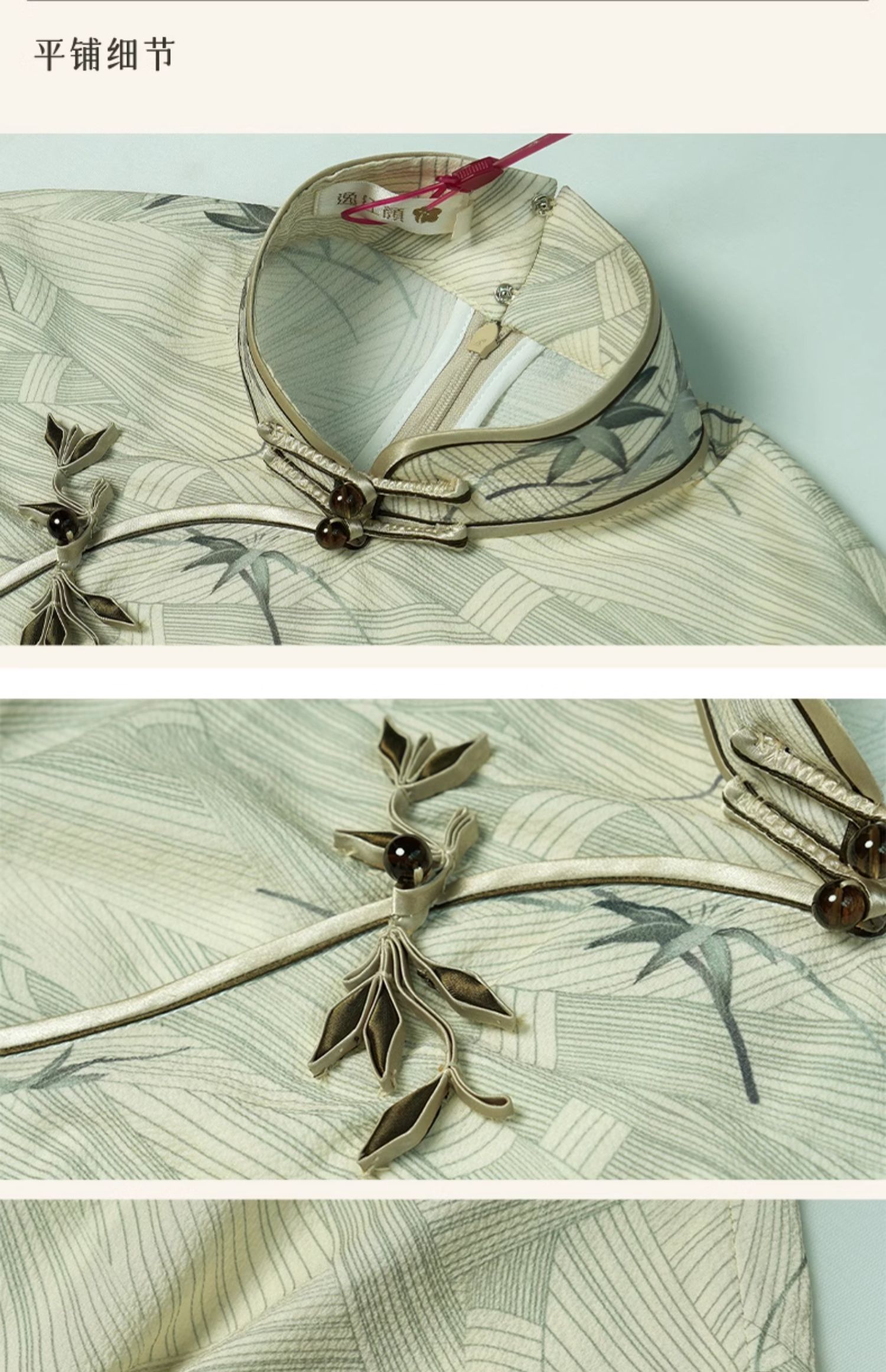 上海逸红颜书瑾2025年夏季新款竹叶印花包边手工盘扣新中式旗袍女