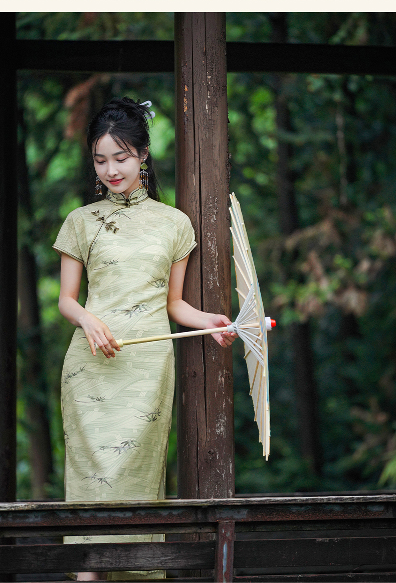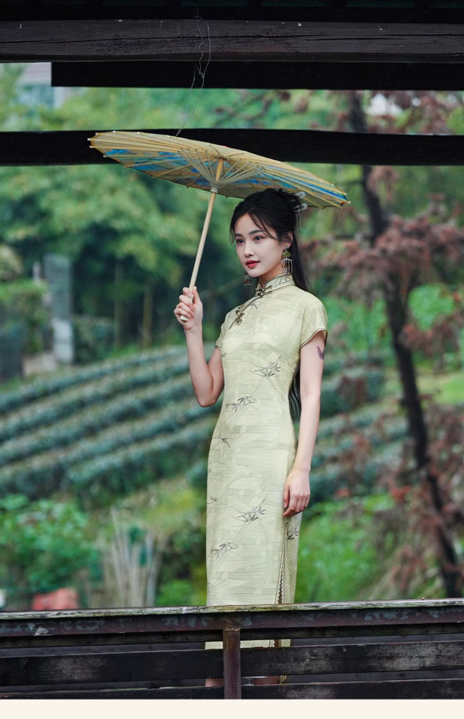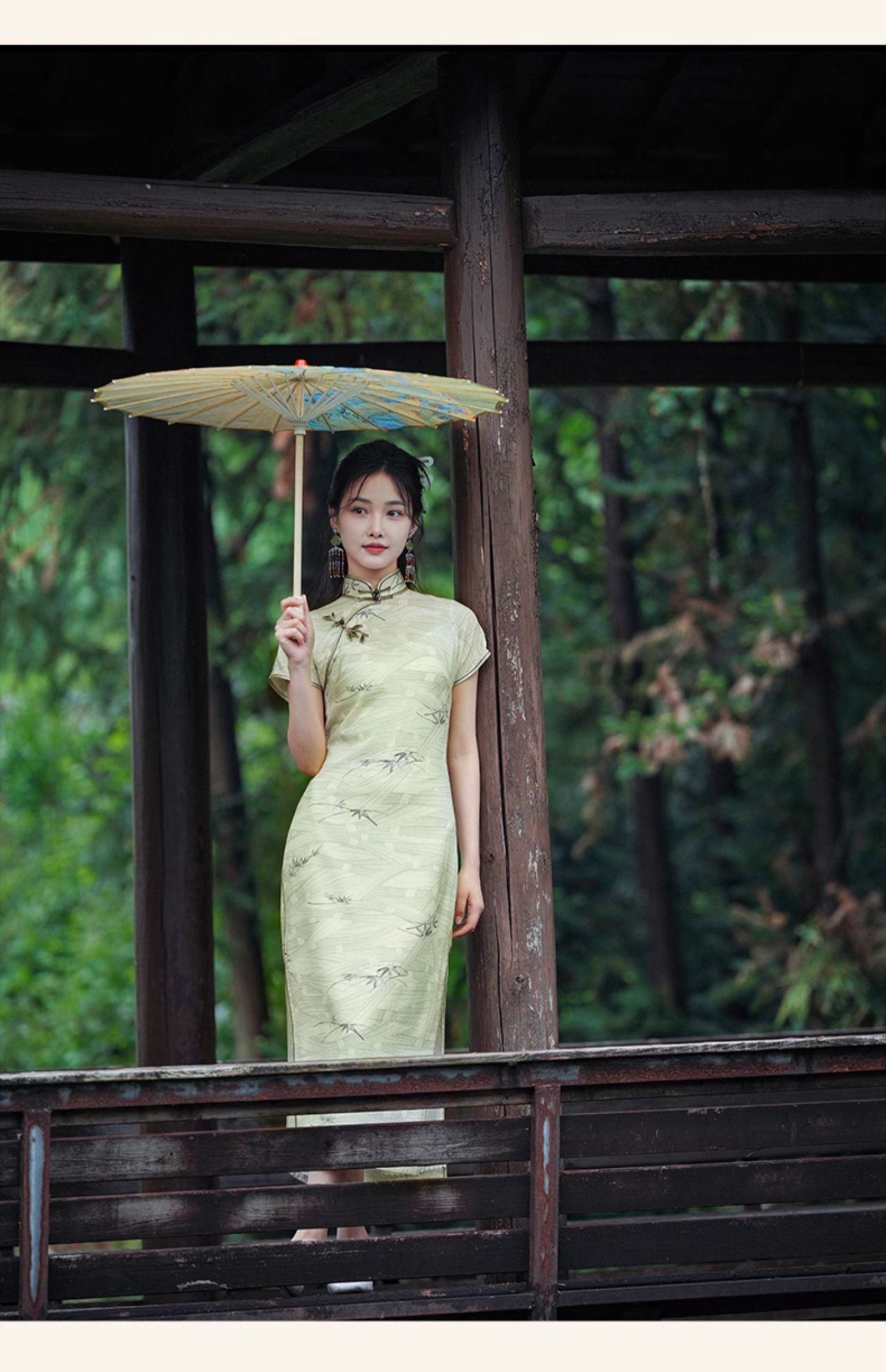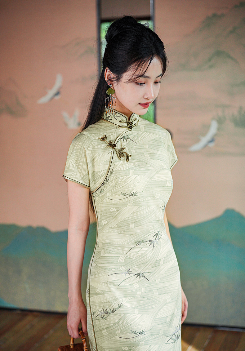 上海逸红颜书瑾2025年夏季新款竹叶印花包边手工盘扣新中式旗袍女