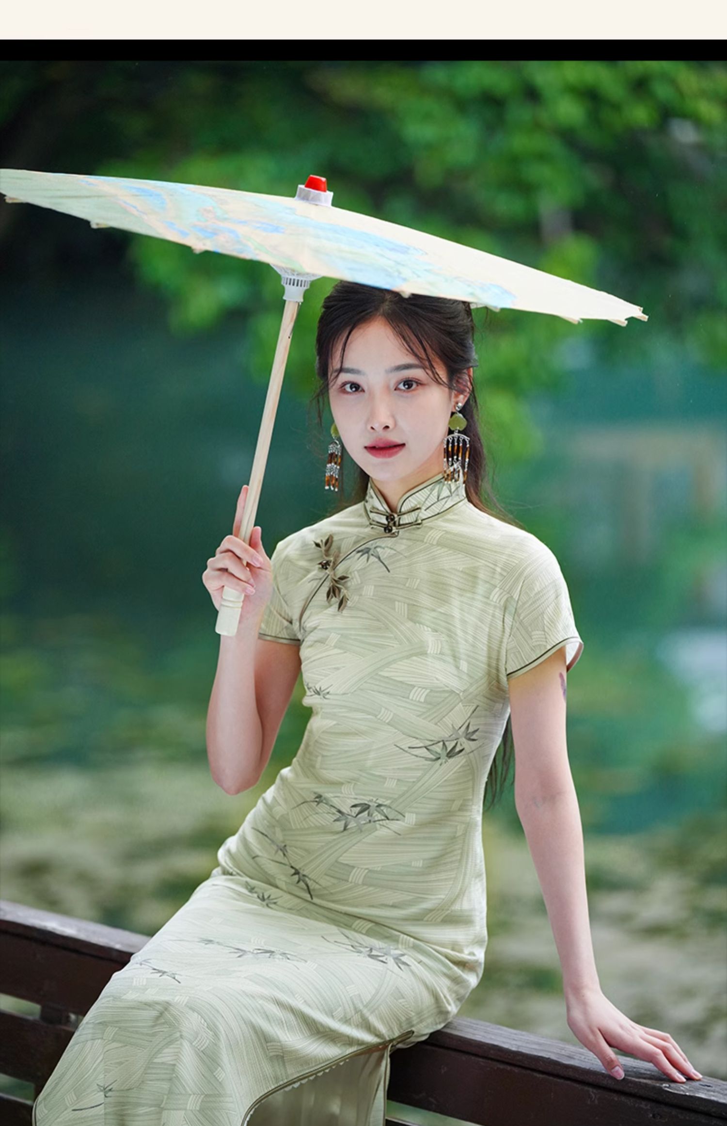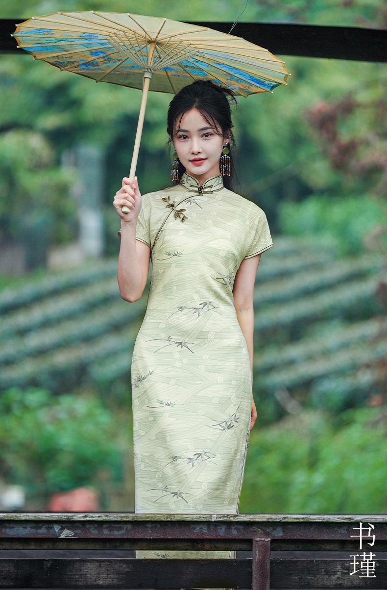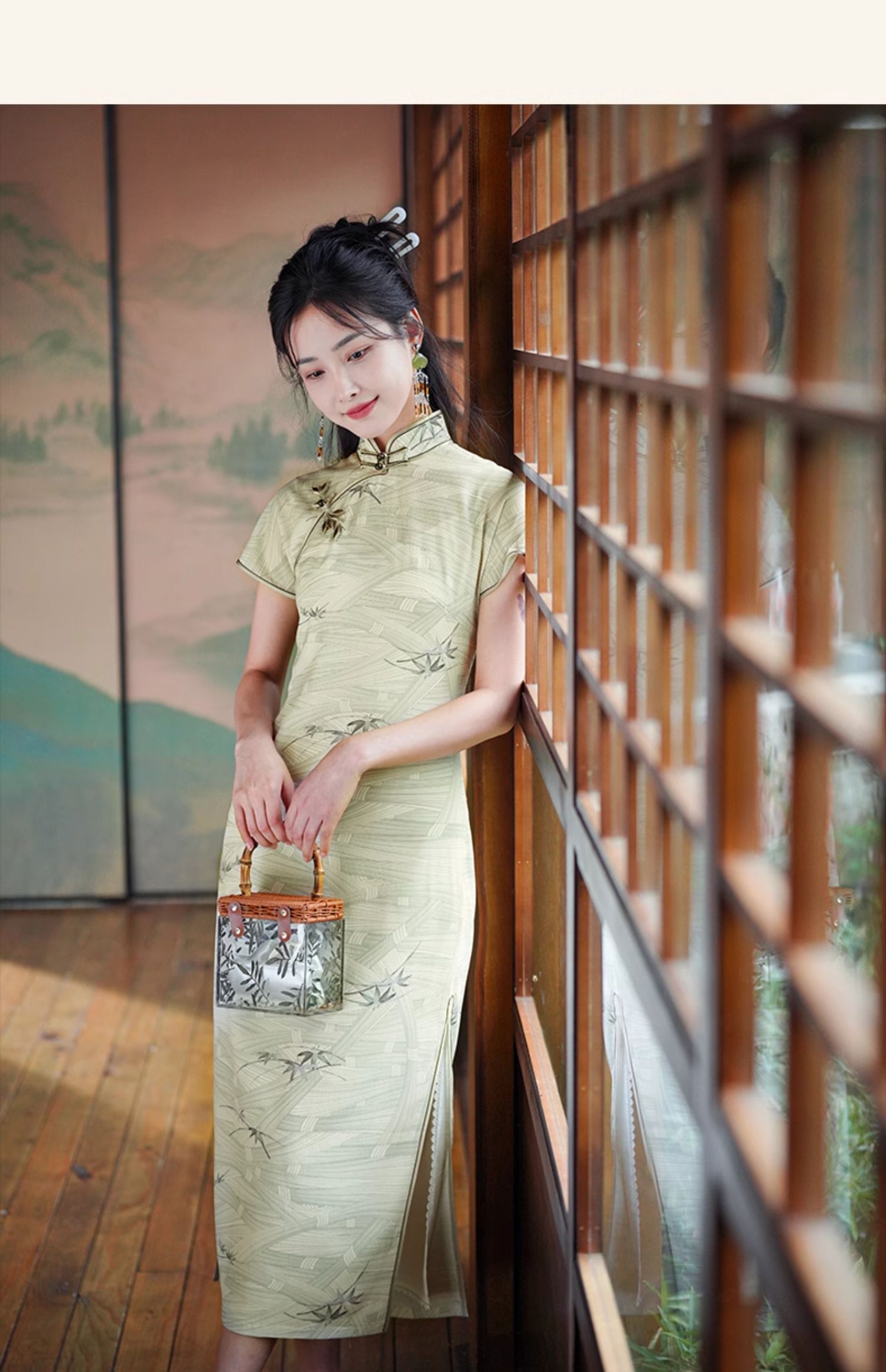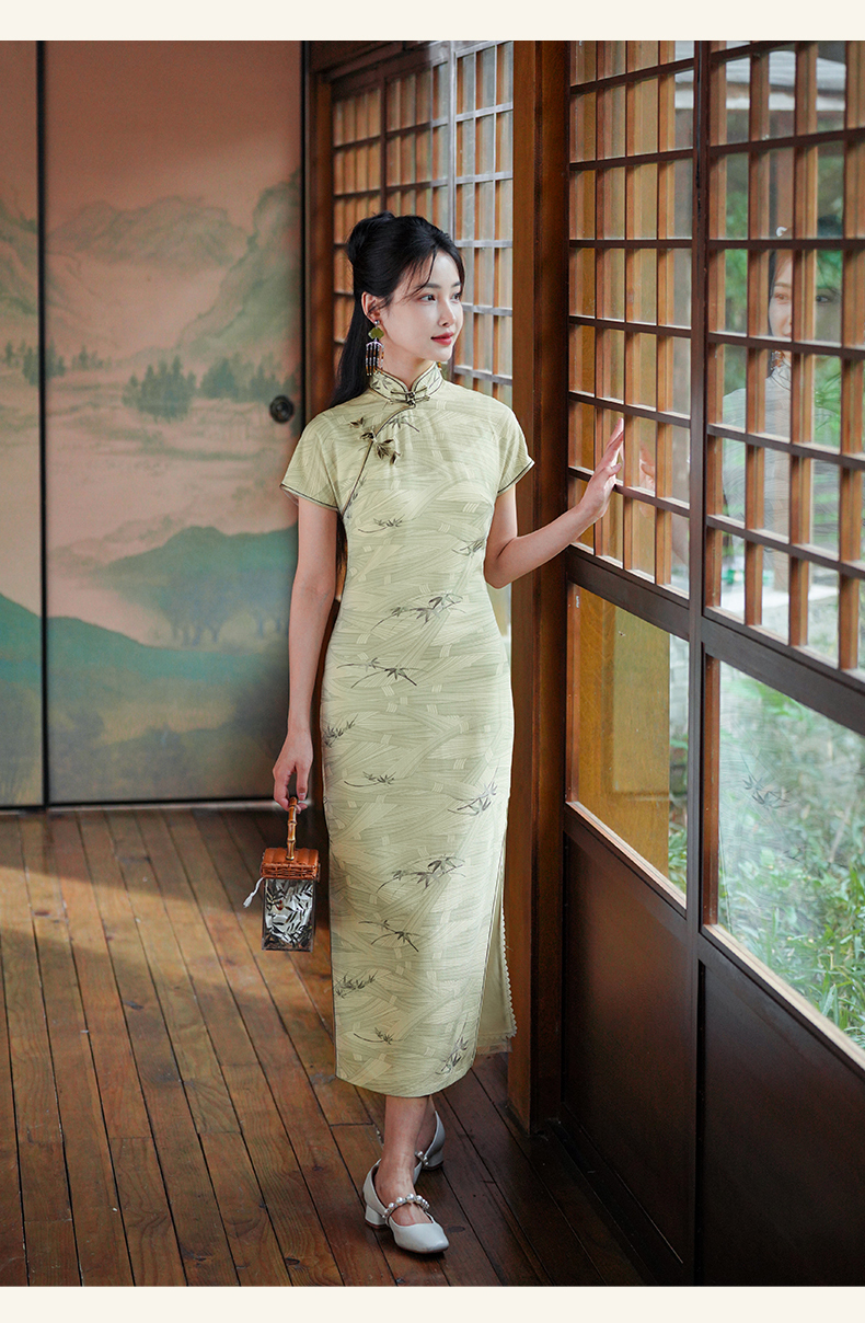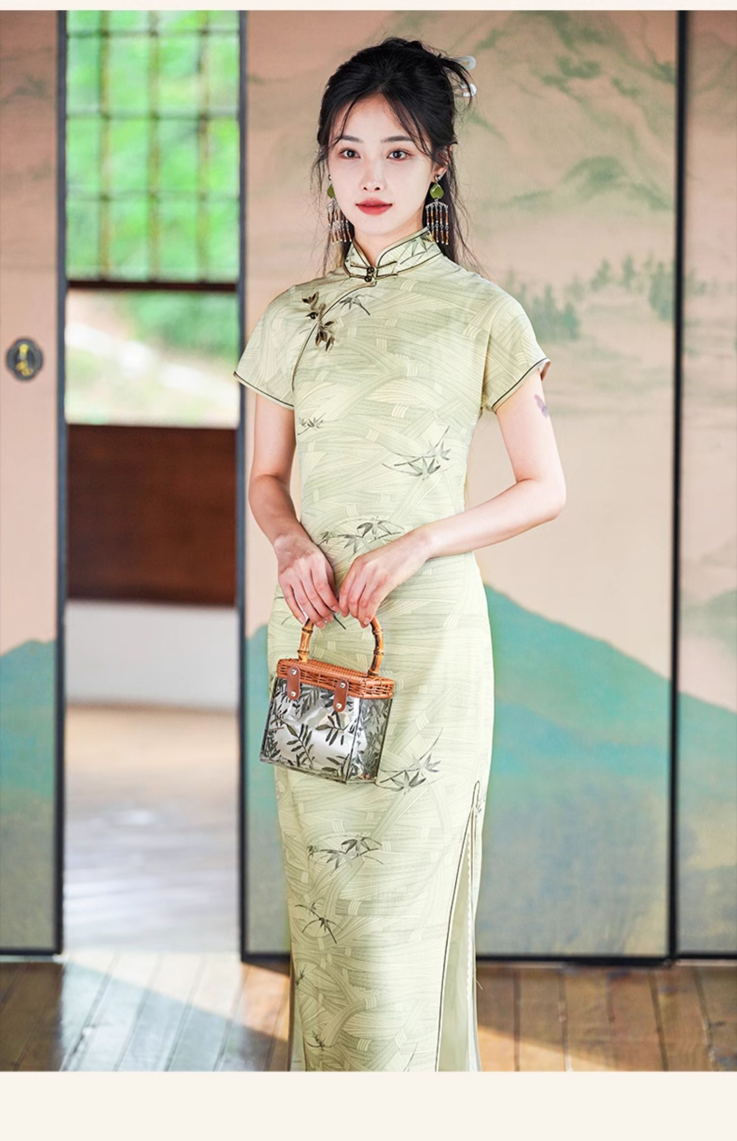 上海逸红颜书瑾2025年夏季新款竹叶印花包边手工盘扣新中式旗袍女