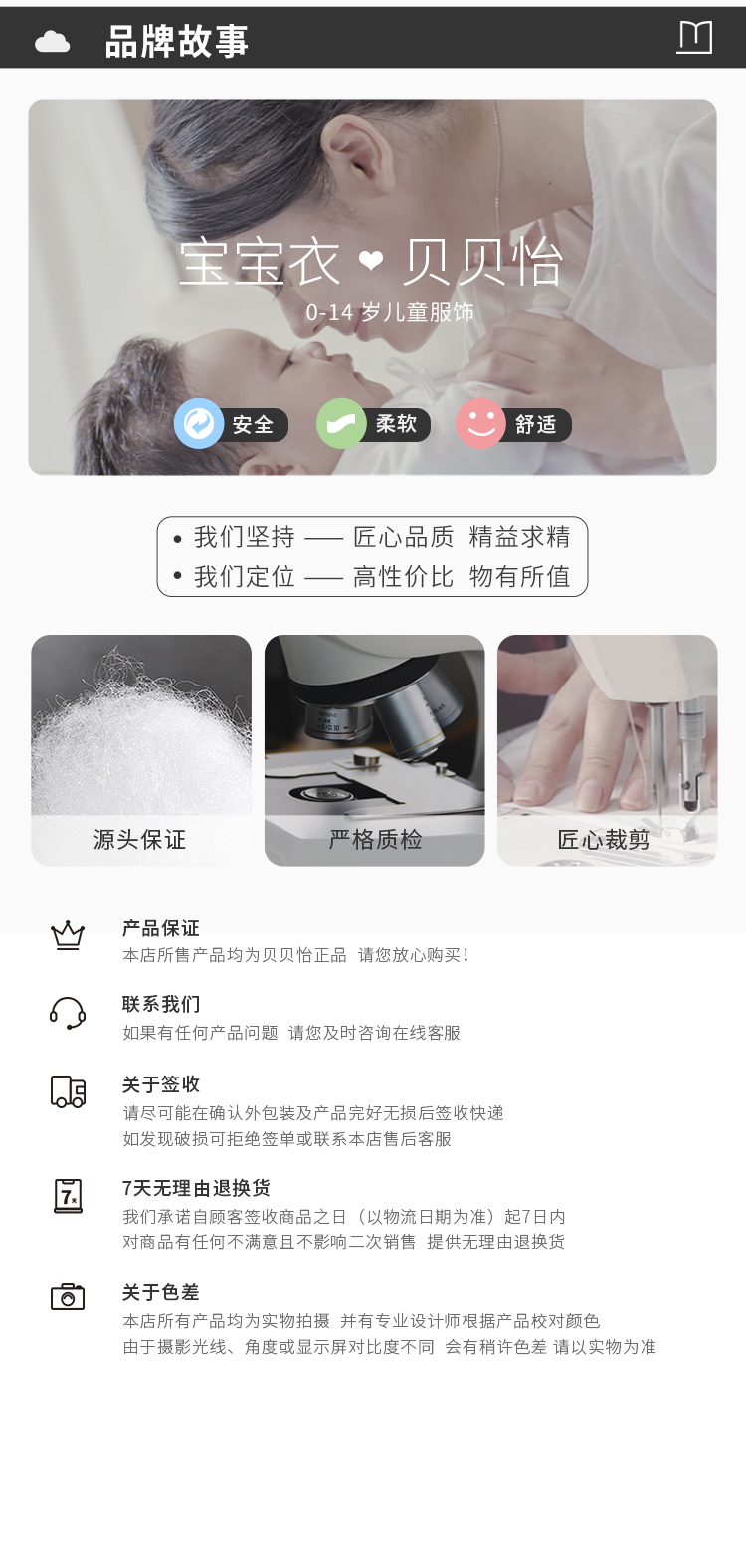 - 贝贝怡专注0-6岁婴幼儿服饰,坚持安全、柔软、舒适的产品理念,为千万中国家庭提供超高品质、安全可靠的婴幼儿服饰产品,妈妈放心,宝宝开心!