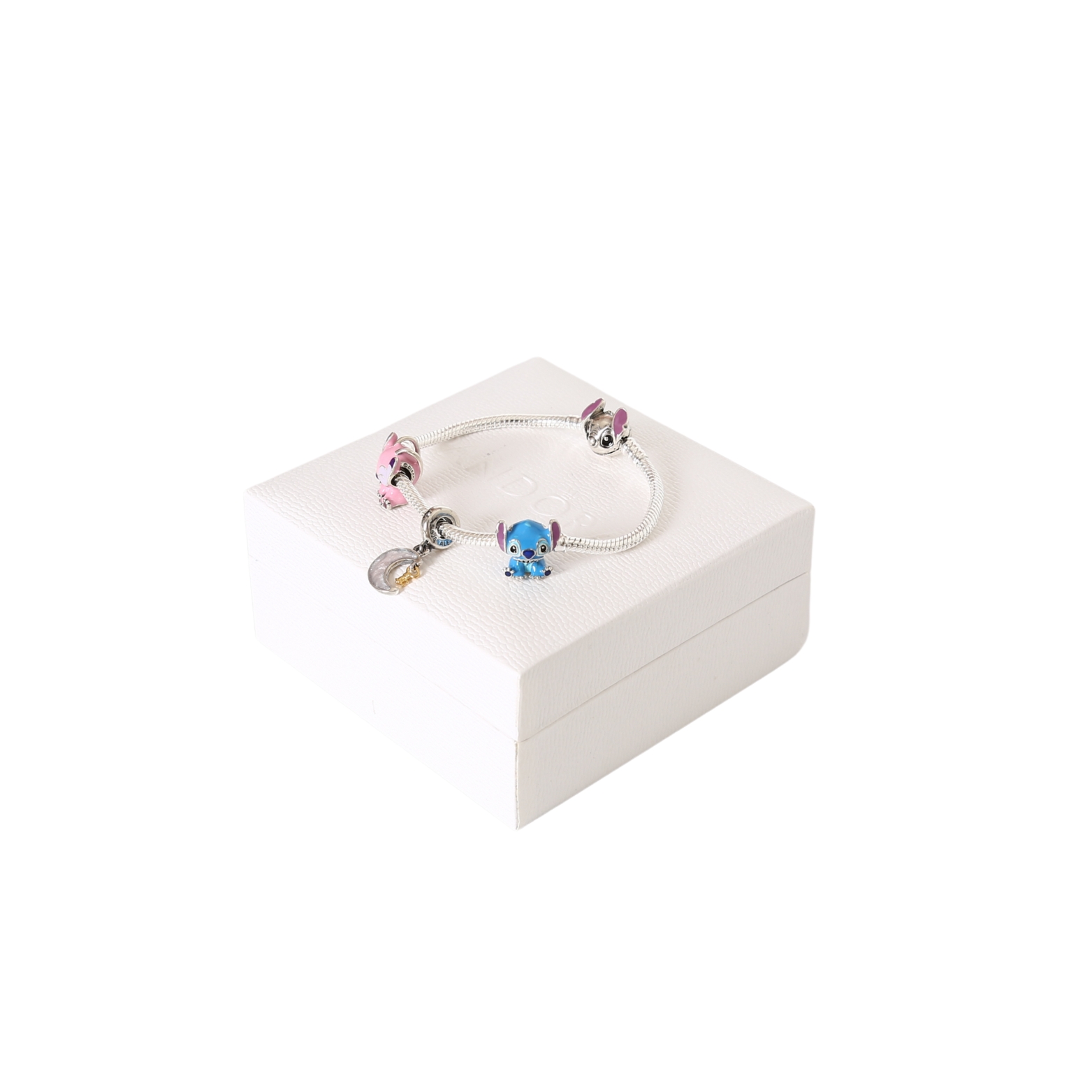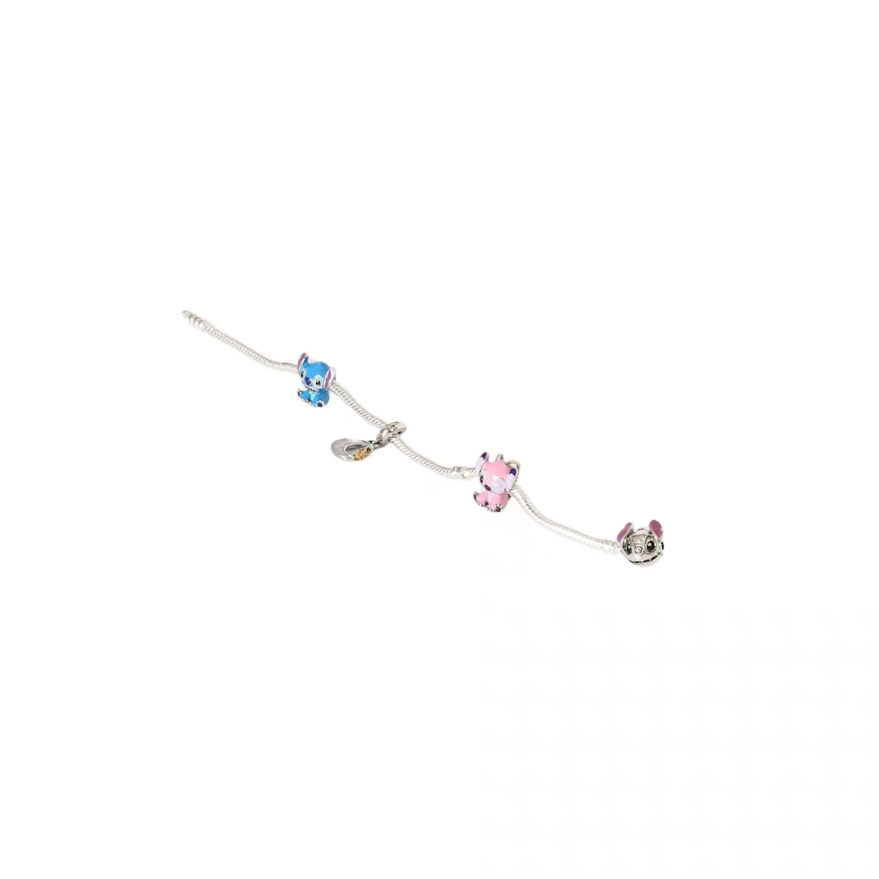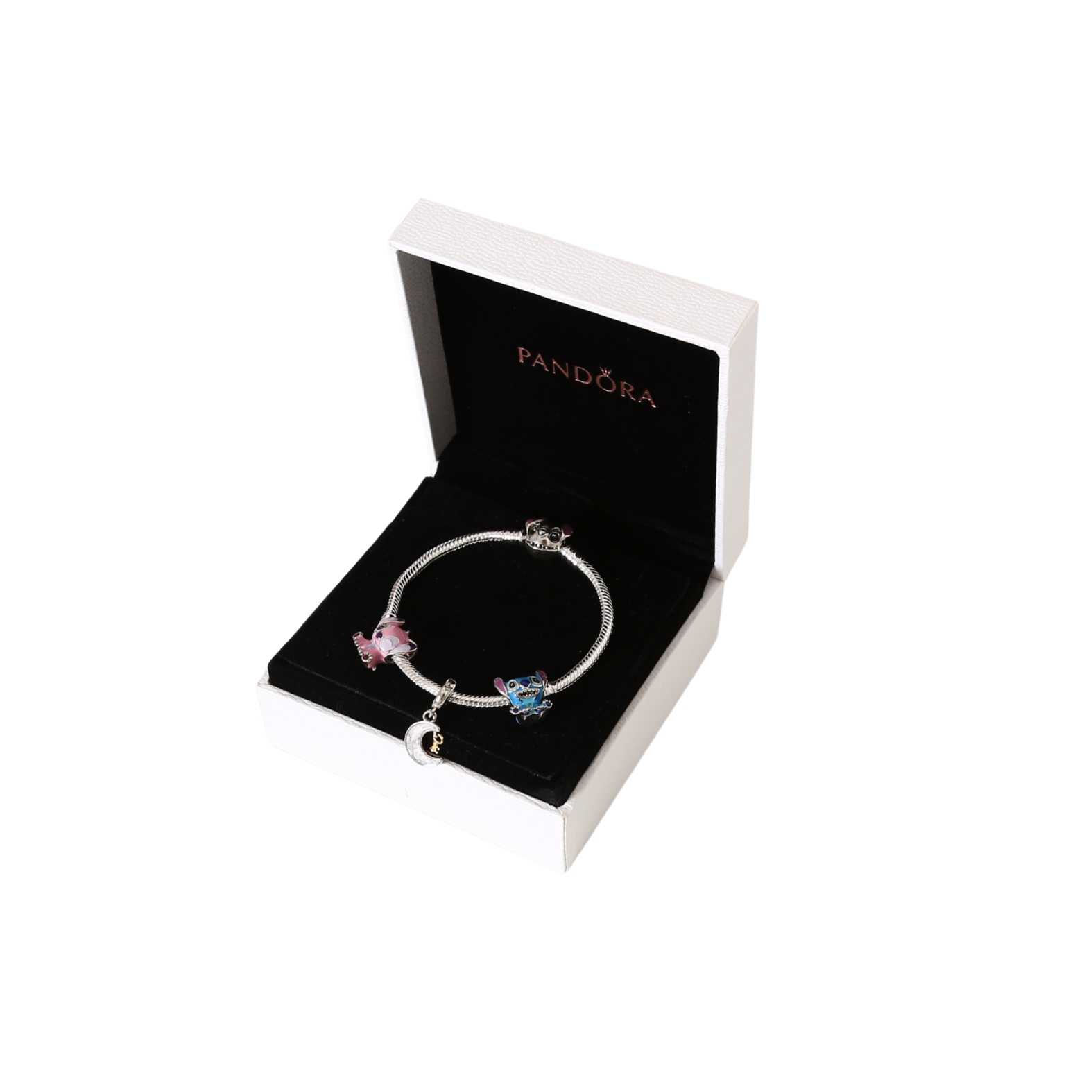 这串潘多拉 ×《星际宝贝》联名手链,是把 “童年的甜” 系在腕间的魔法。银白蛇骨链衬得肤白,蓝身大耳的史迪奇、粉糯软萌的安琪,用立体珐琅捏出动画里的鲜活神态 —— 连史迪奇圆溜溜的黑眼睛、安琪轻晃的耳朵都带着 “搞怪又温柔” 的灵气,坠着的星月吊饰更像藏了夏威夷晚风的浪漫。打磨的质感,让每颗串珠都带着细腻的光泽,既不会过分甜腻,又能在抬手间露出 “懂你的小默契”。不管是送给同爱《星际宝贝》的闺蜜,还是犒劳自己一份 “永葆天真” 的礼物,它都是 “把喜欢戴在身上” 的温柔载体 —— 毕竟 “ohana 就是家人”,而这串手链,是把偏爱和陪伴都串在了一起。