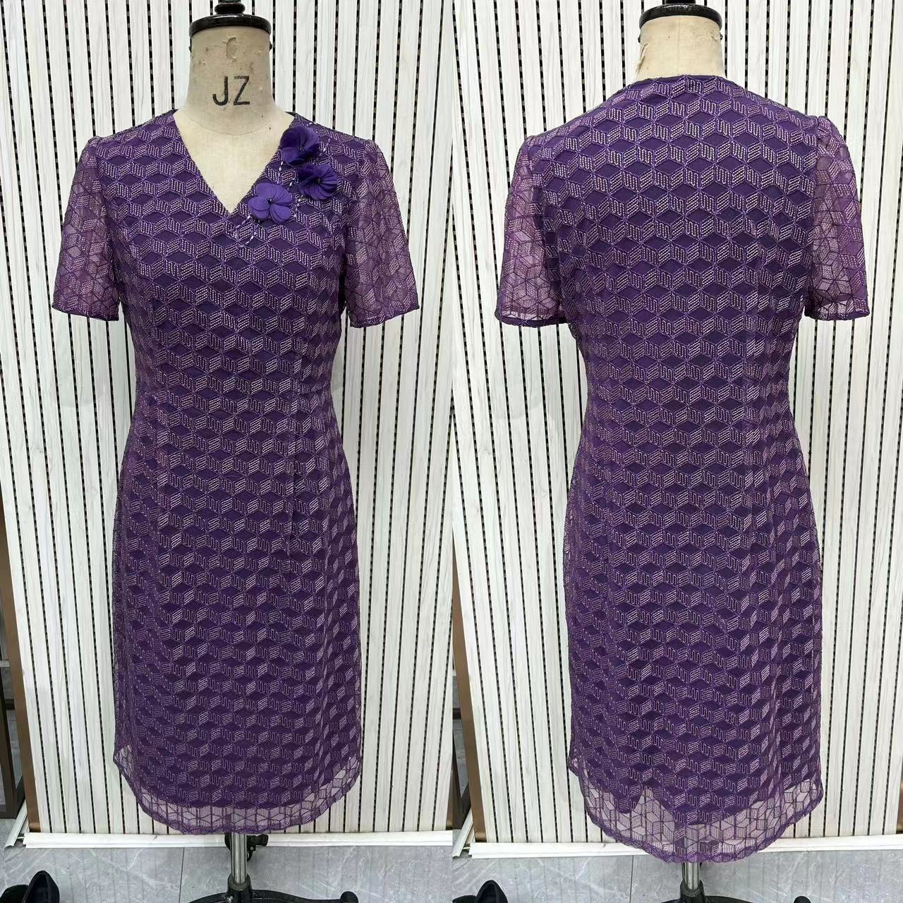 HJ1S86_齐紫色_连衣裙_春夏_复古V领立体花朵几何提花短袖收腰显瘦中长裙_高级女装_BERNIEELEN 伯妮斯茵