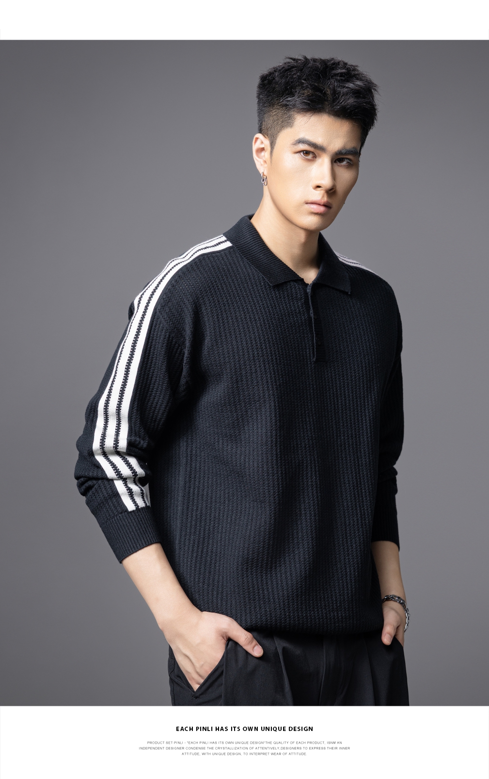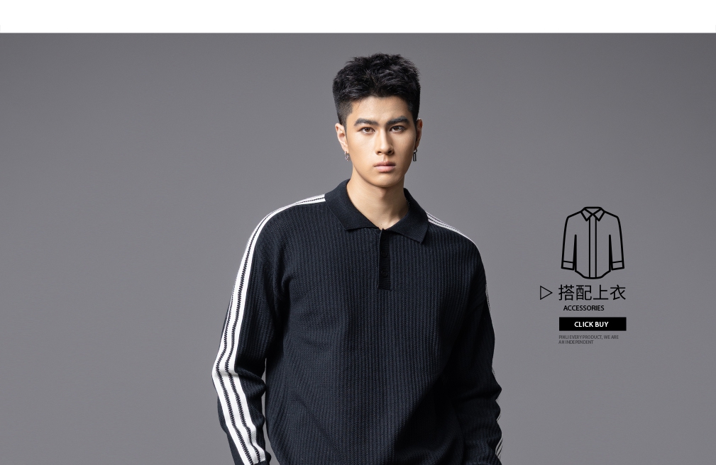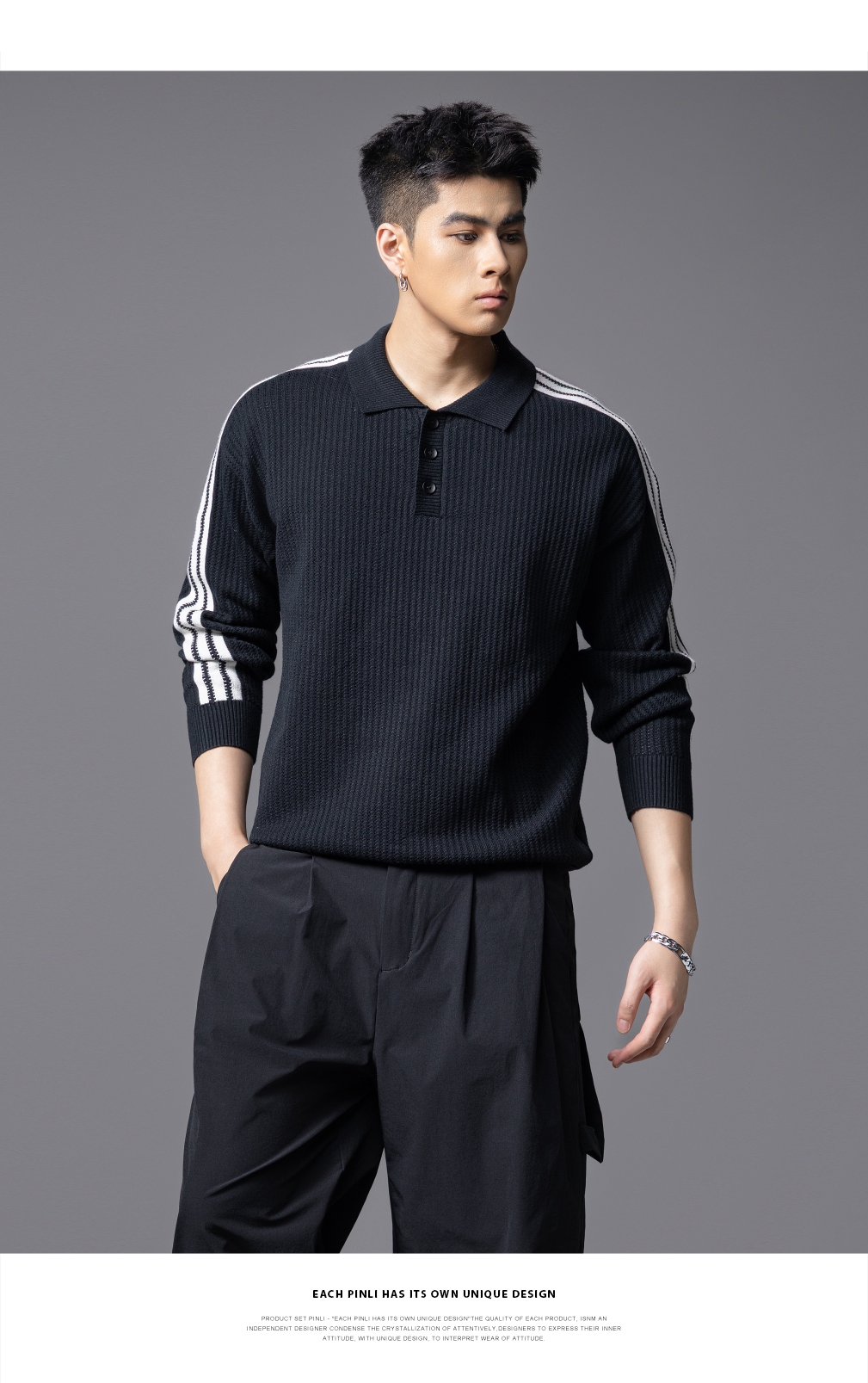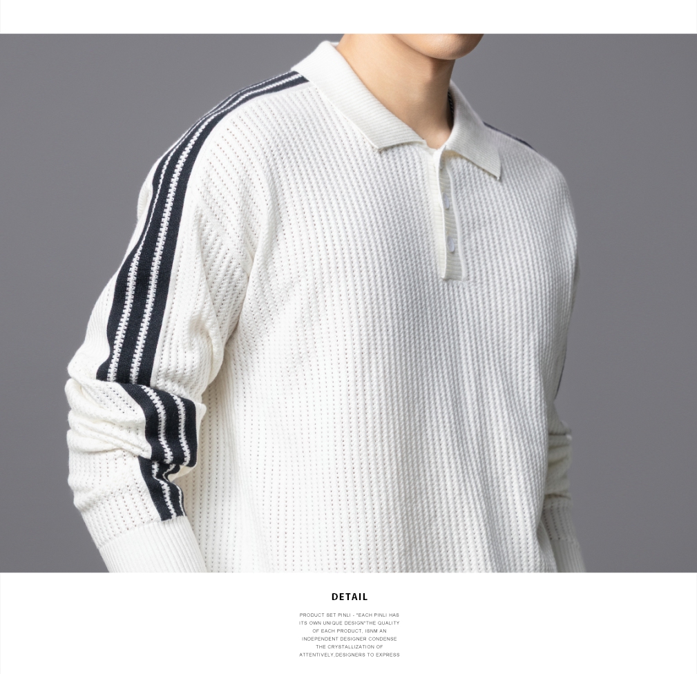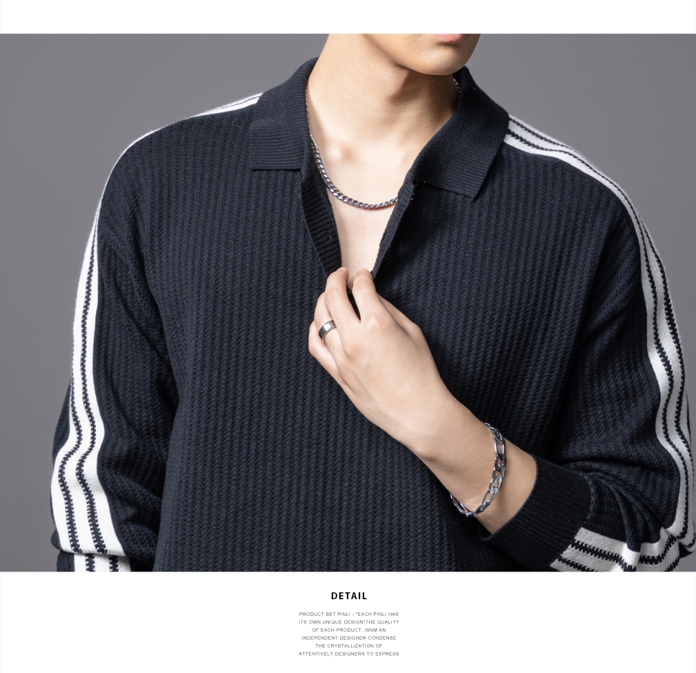 PINLI品立2025秋季新款POLO领宽松毛衣男潮牌休闲翻领条纹针织衫GD253110133