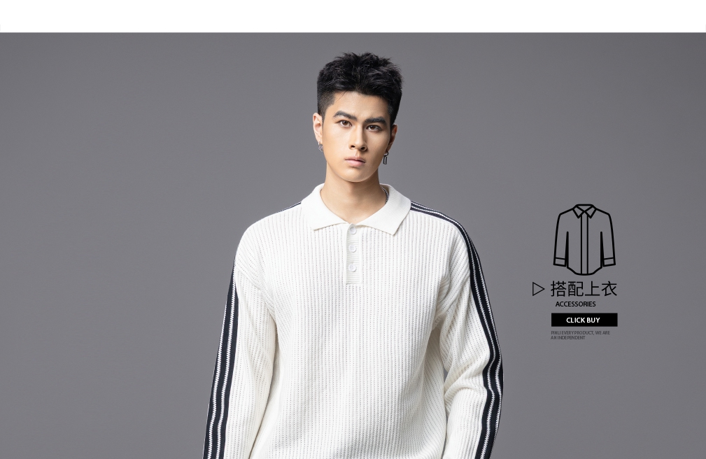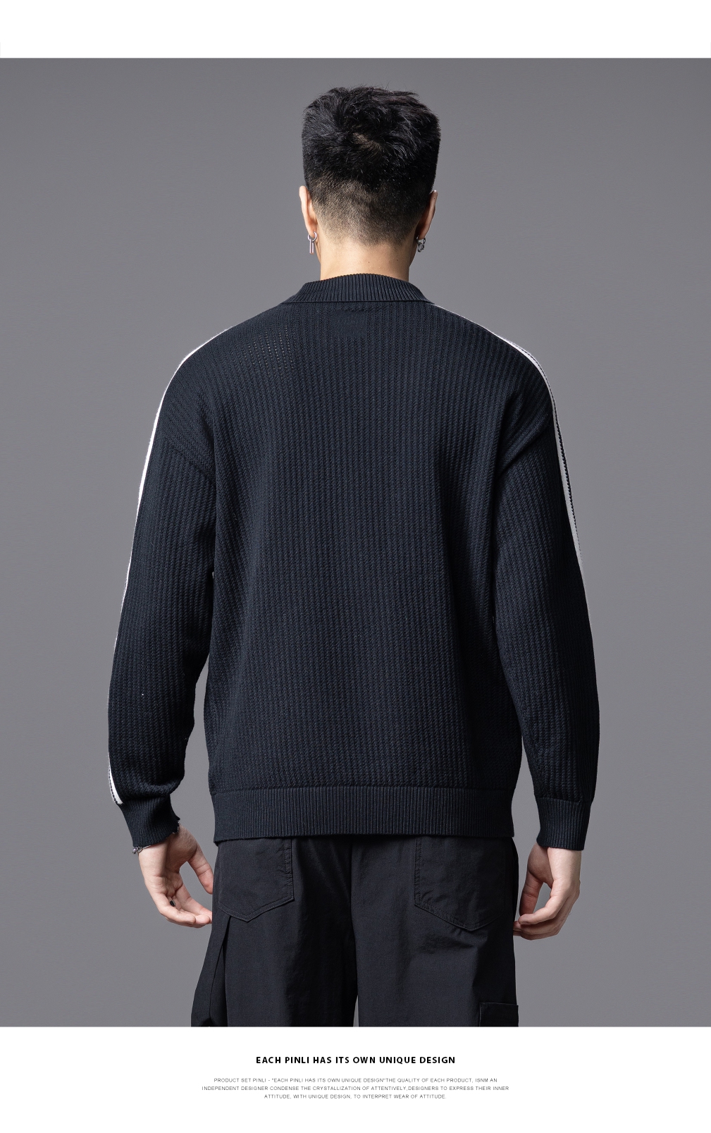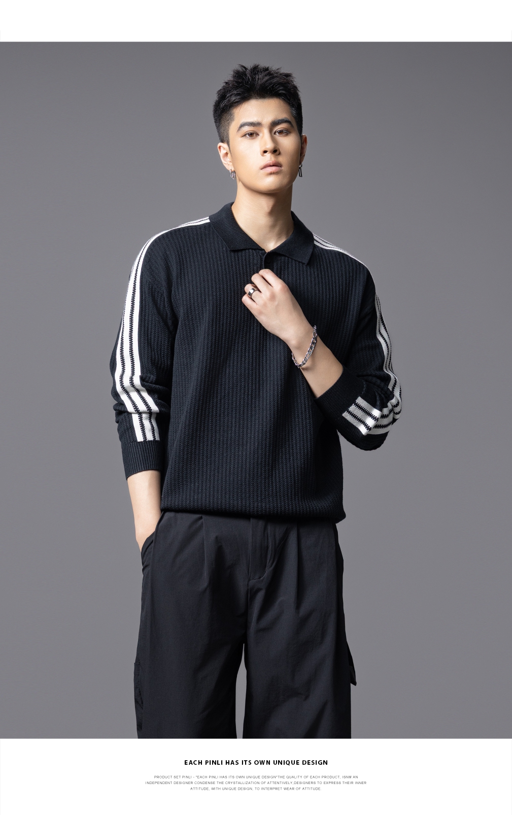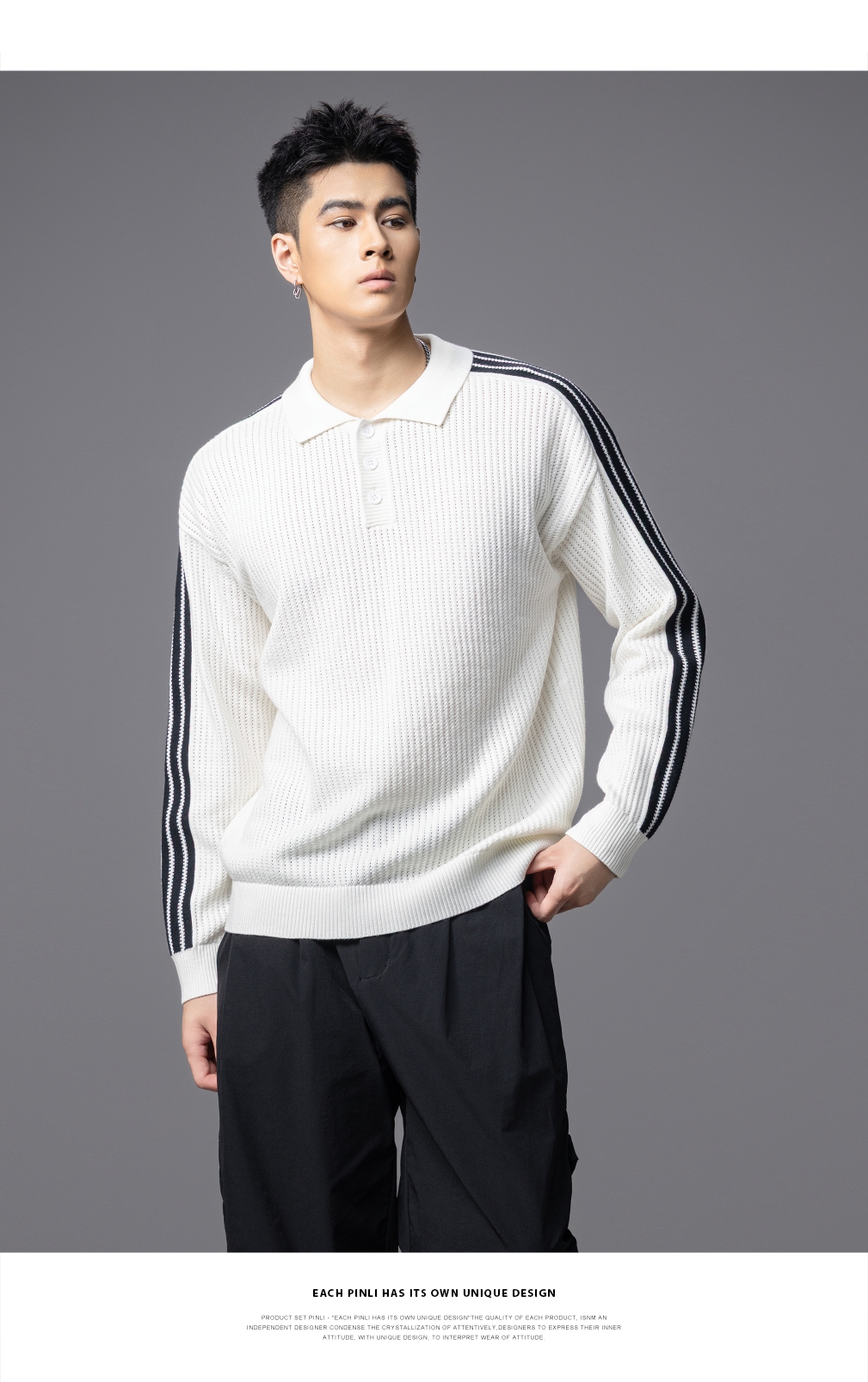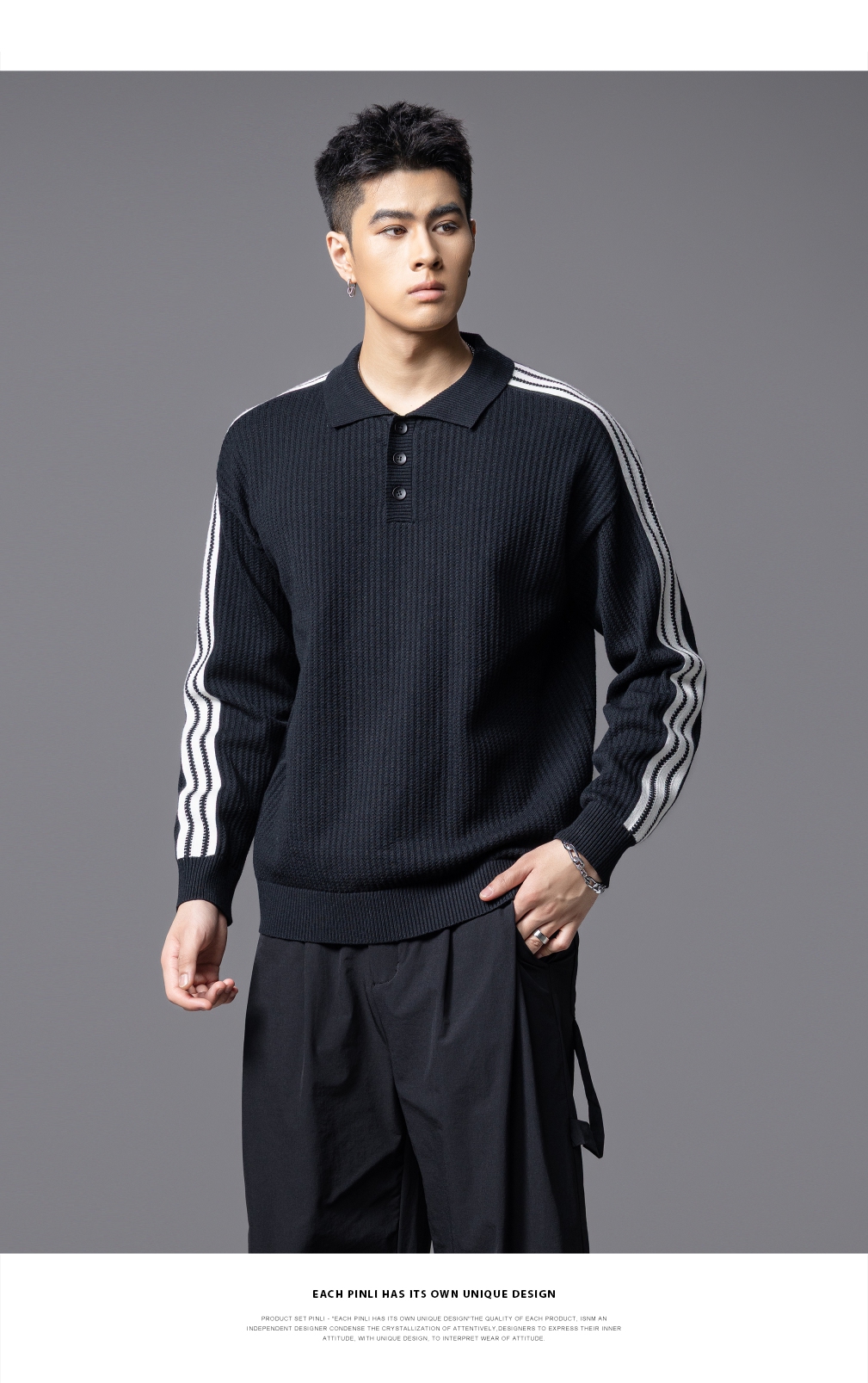 PINLI品立2025秋季新款POLO领宽松毛衣男潮牌休闲翻领条纹针织衫GD253110133