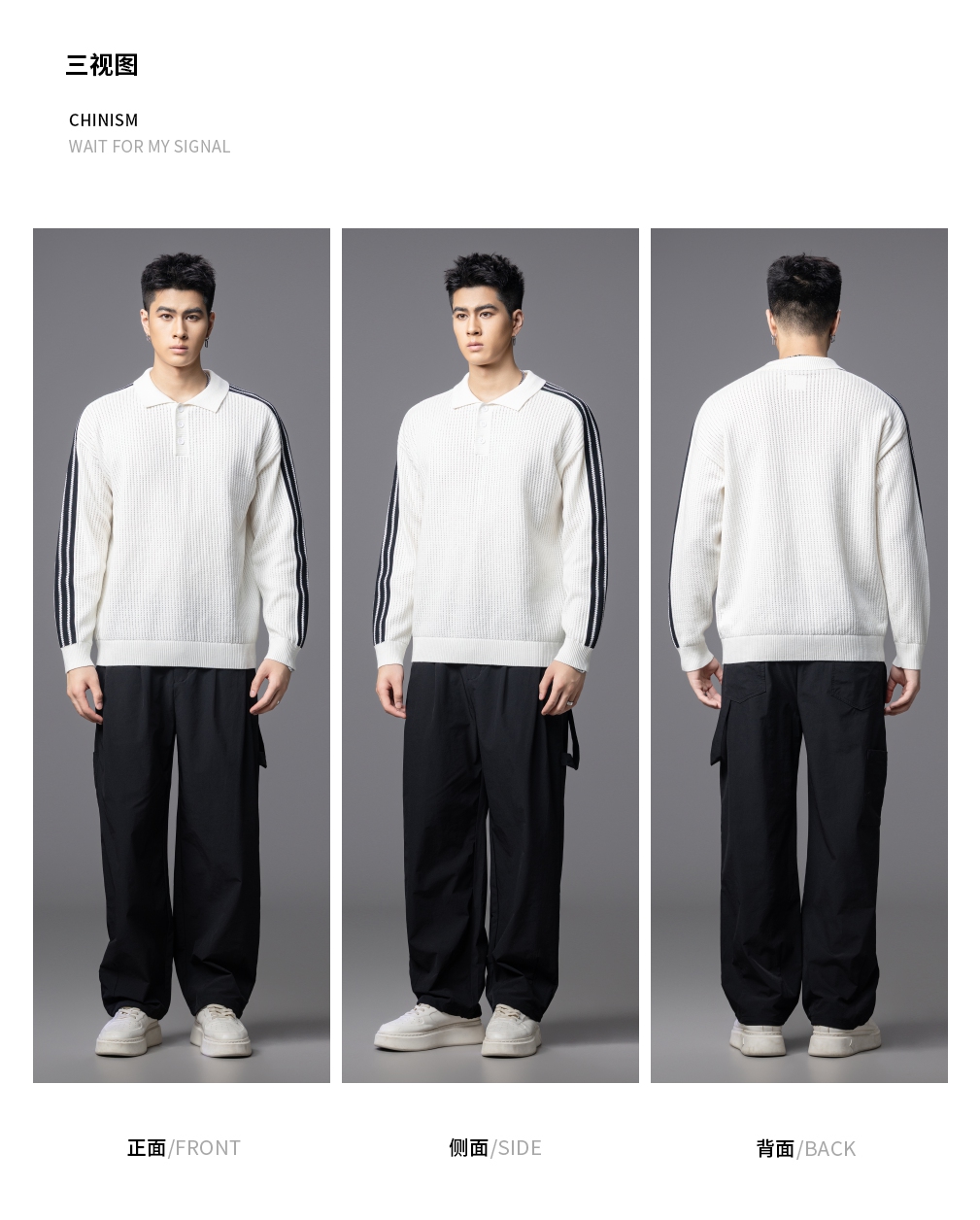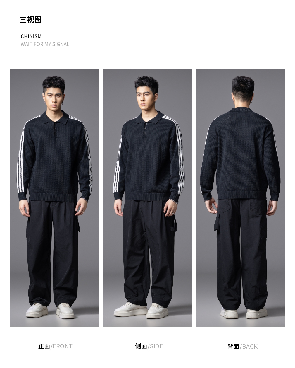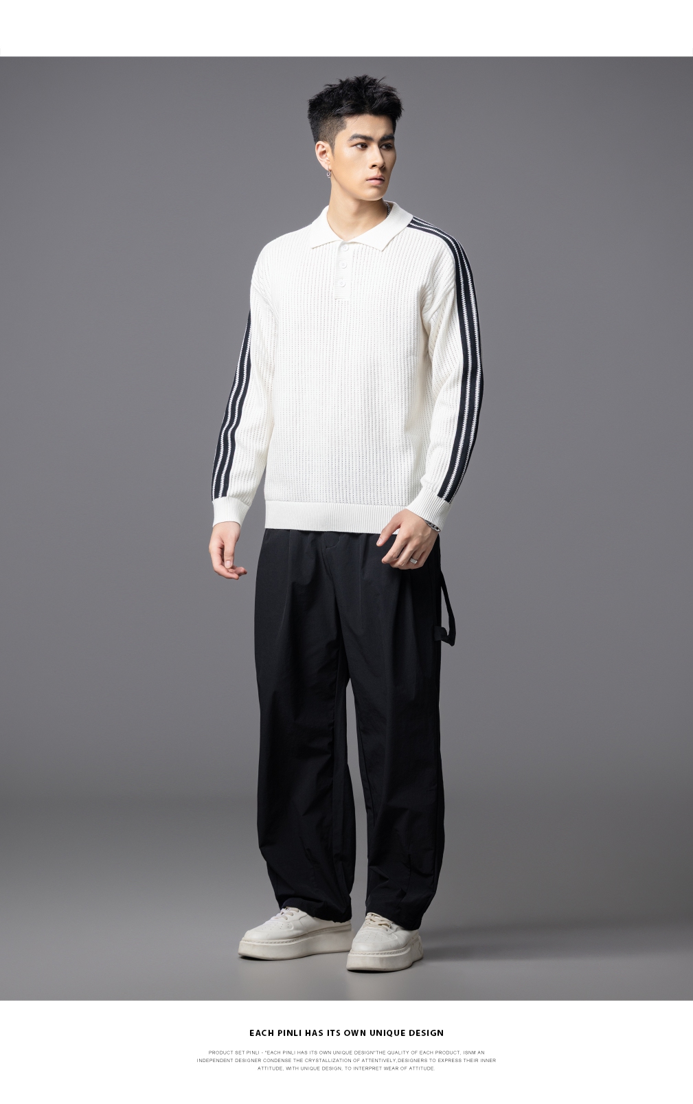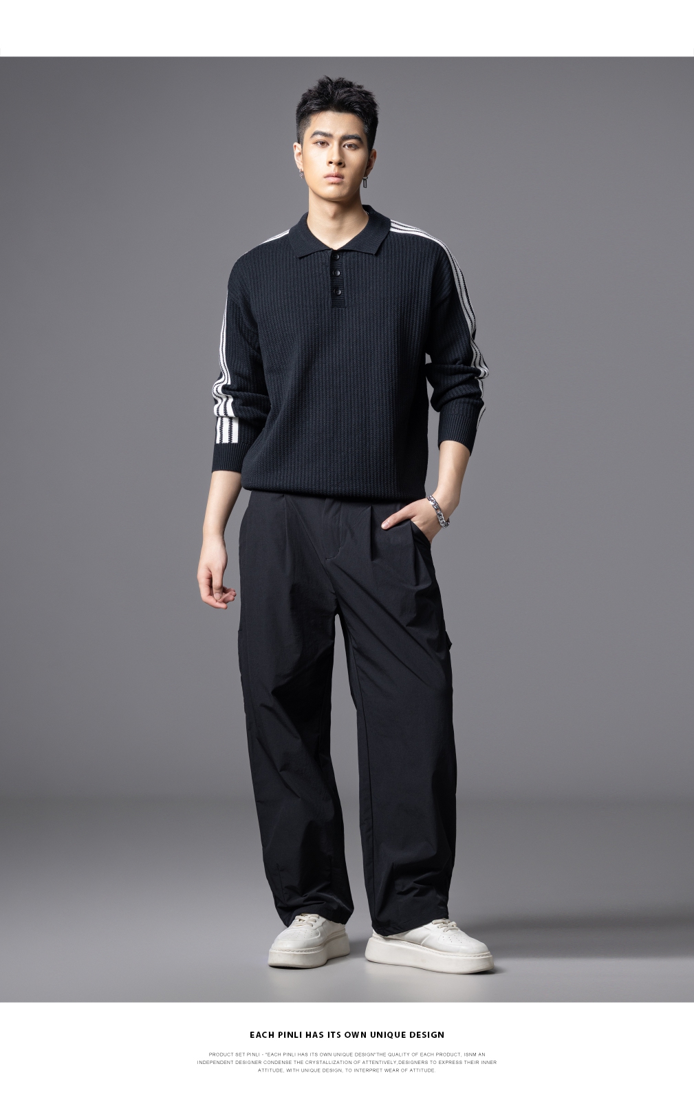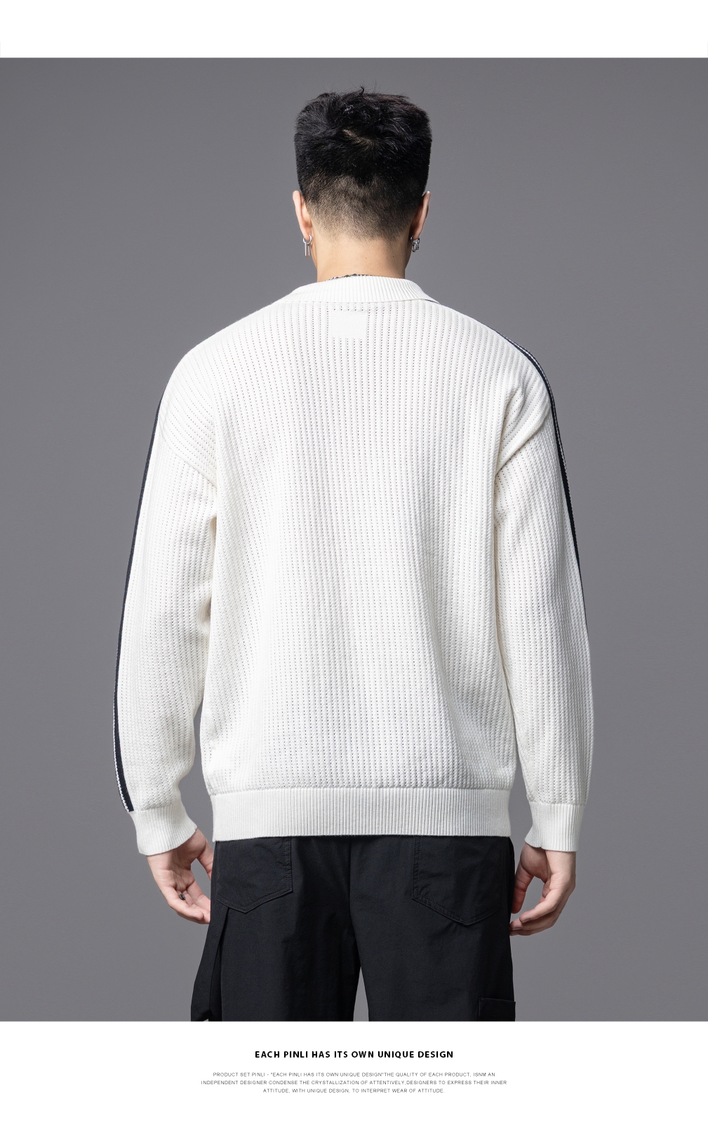 PINLI品立2025秋季新款POLO领宽松毛衣男潮牌休闲翻领条纹针织衫GD253110133