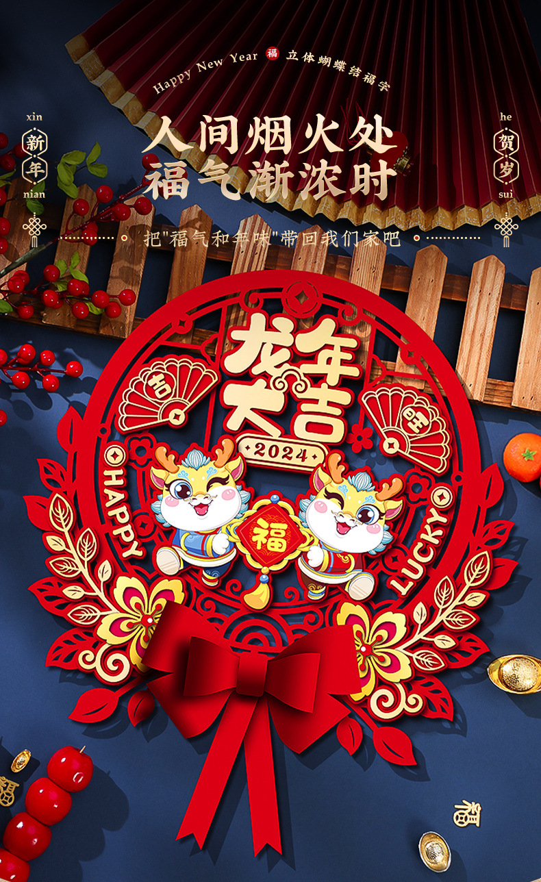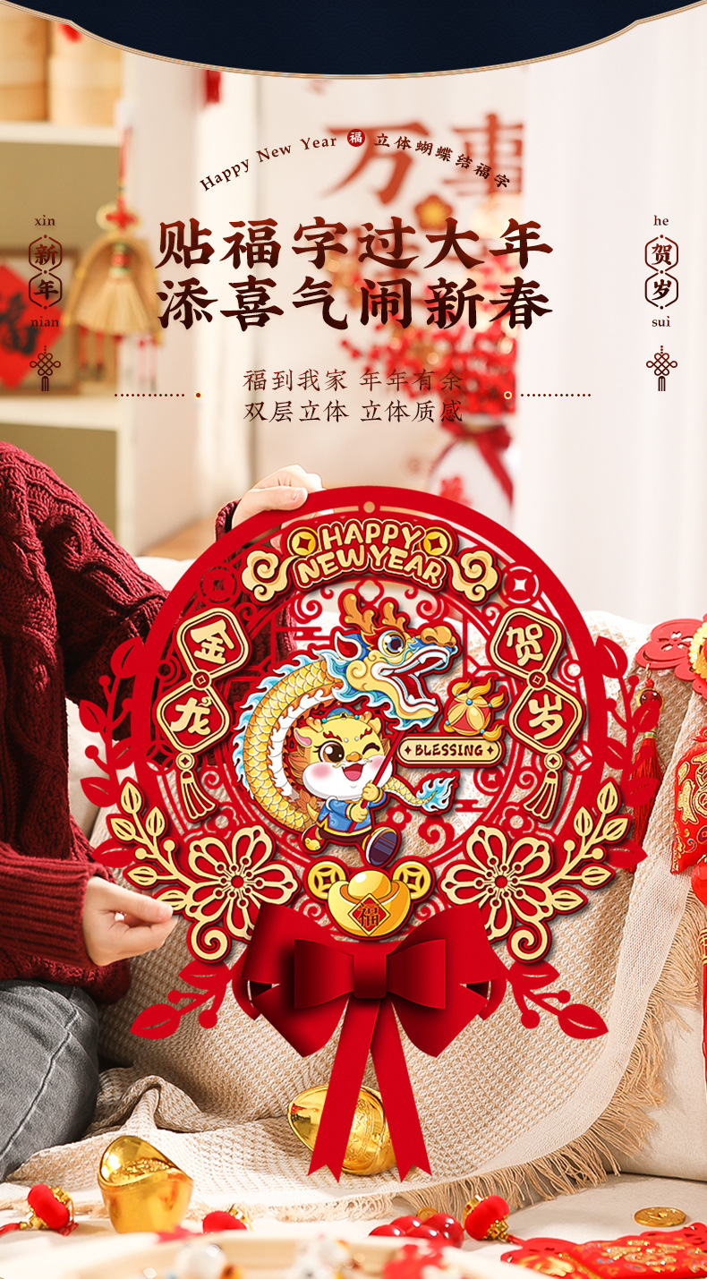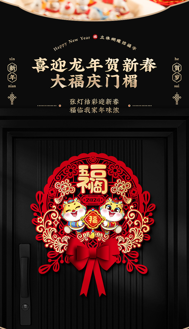 【新年蝴蝶结立体挂饰】2024龙年福字门贴新款新年贴纸春节布置入户门挂过年装饰用品挂件