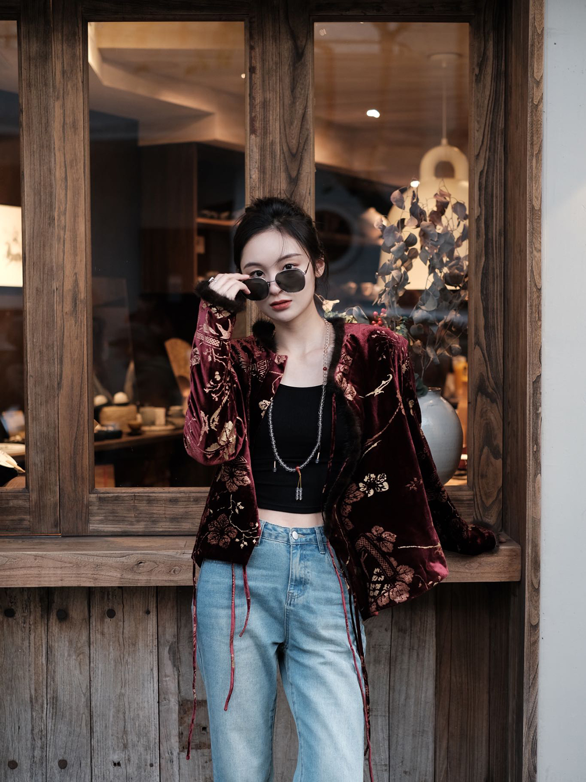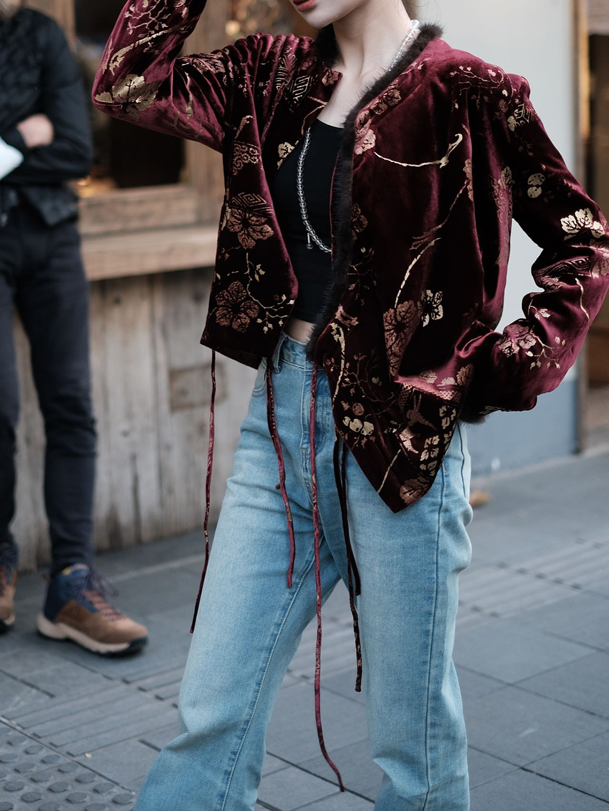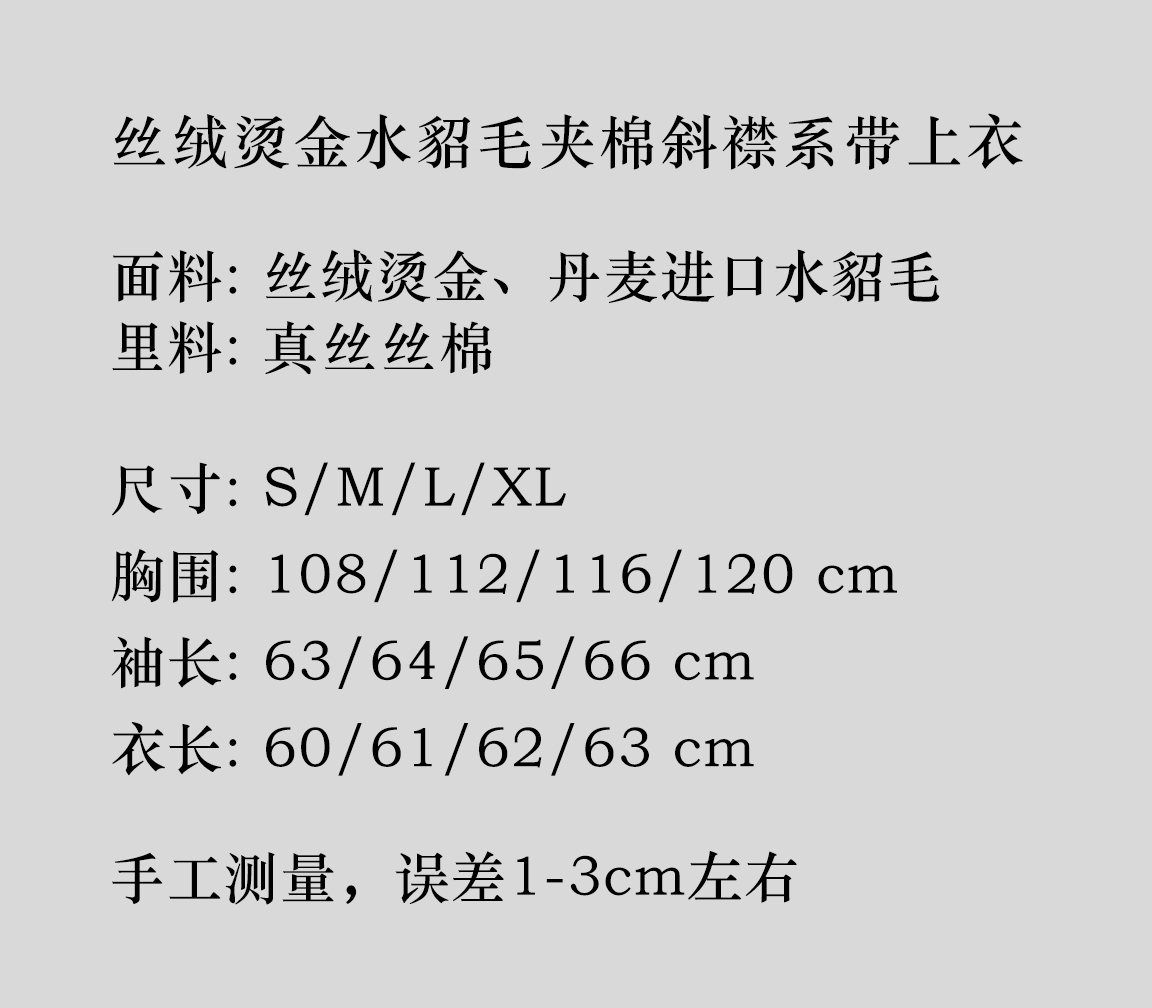 盛唐牡丹|丝绒烫金水貂毛夹棉斜襟系带上衣