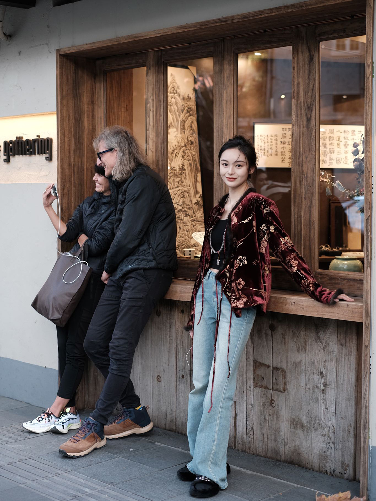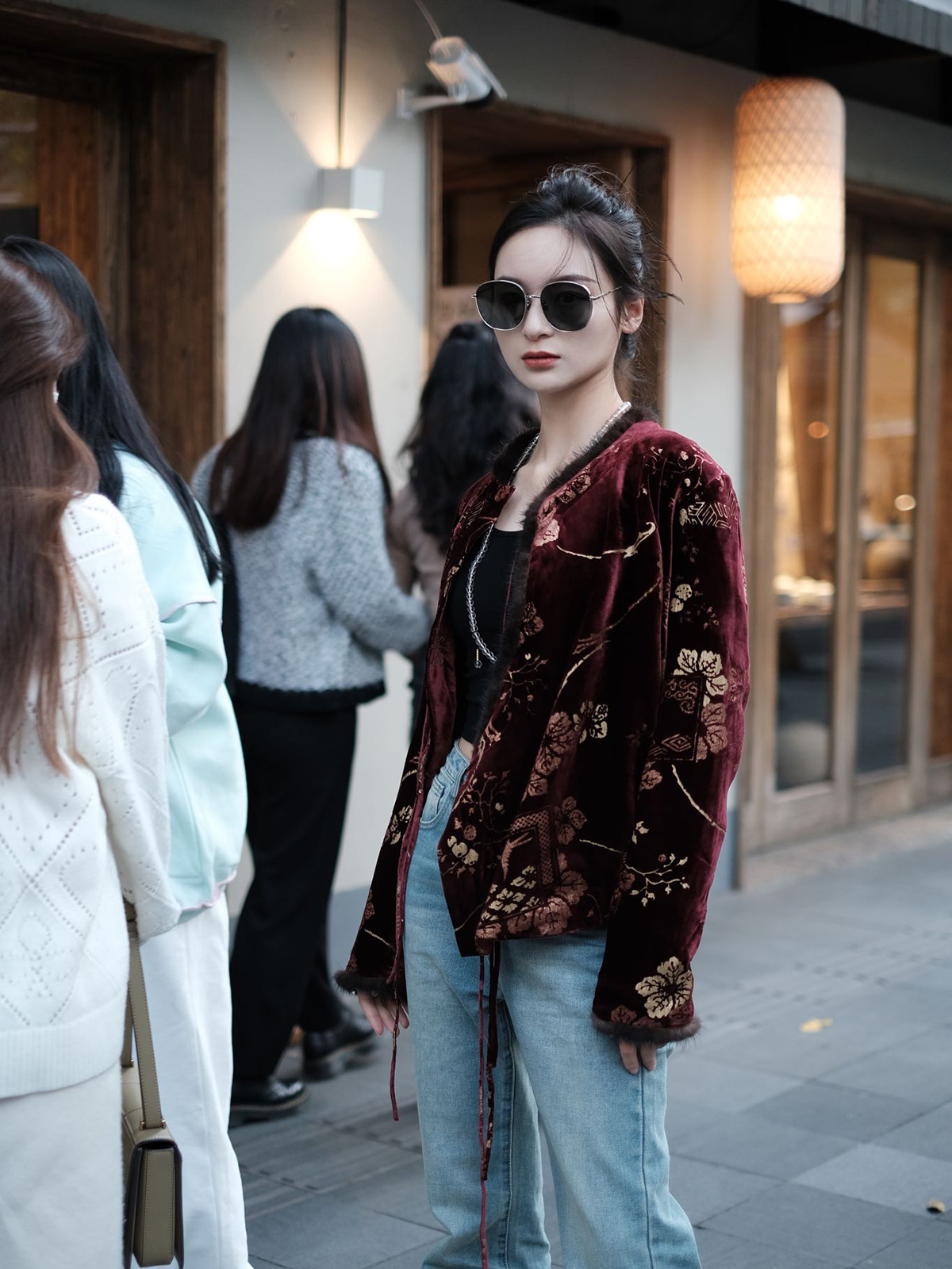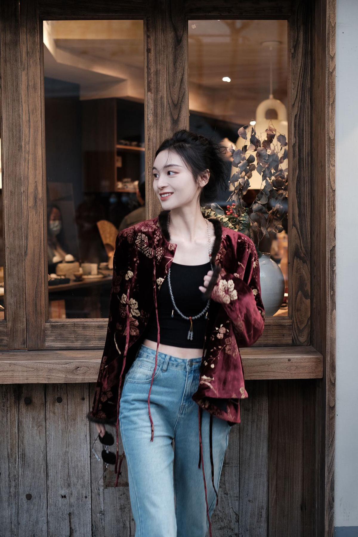 盛唐牡丹|丝绒烫金水貂毛夹棉斜襟系带上衣