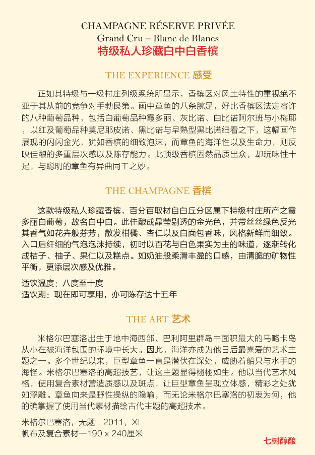 画中渗出的闪闪金光,犹如拥有复杂敏锐触感与味觉的巨型章鱼沉浸在香槟的气泡中贪婪呼吸,急欲执着的感受每一丝香气。通体猩红色的章鱼所展现出的海洋气息及生命力,也印证了佳酿的复杂层次以及陈存能力。