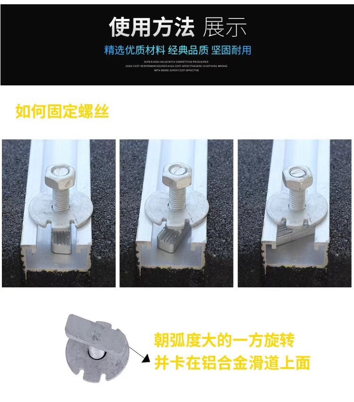 采用铝槽滑动设计,防锈,方便调整规定孔位,高级橡胶材质,使用年限长达15年,可抗5-7级台风