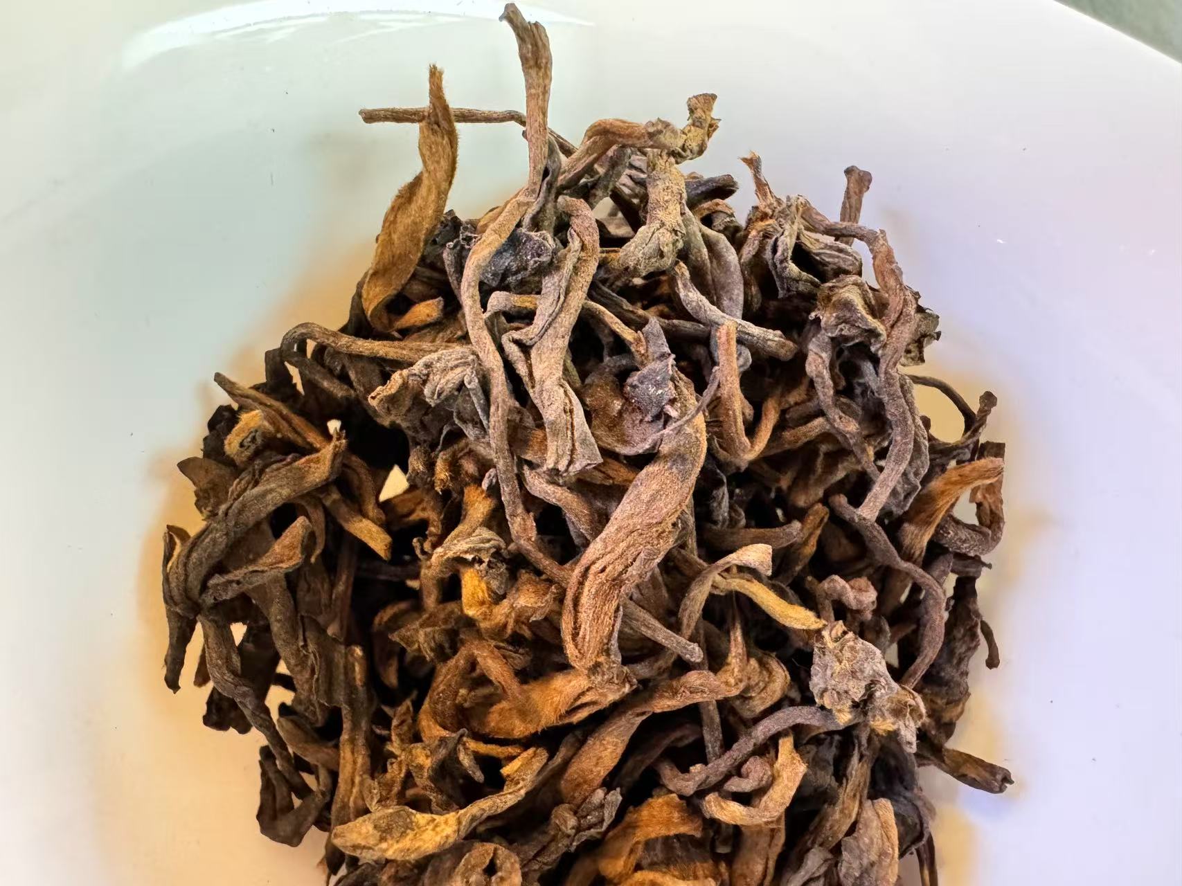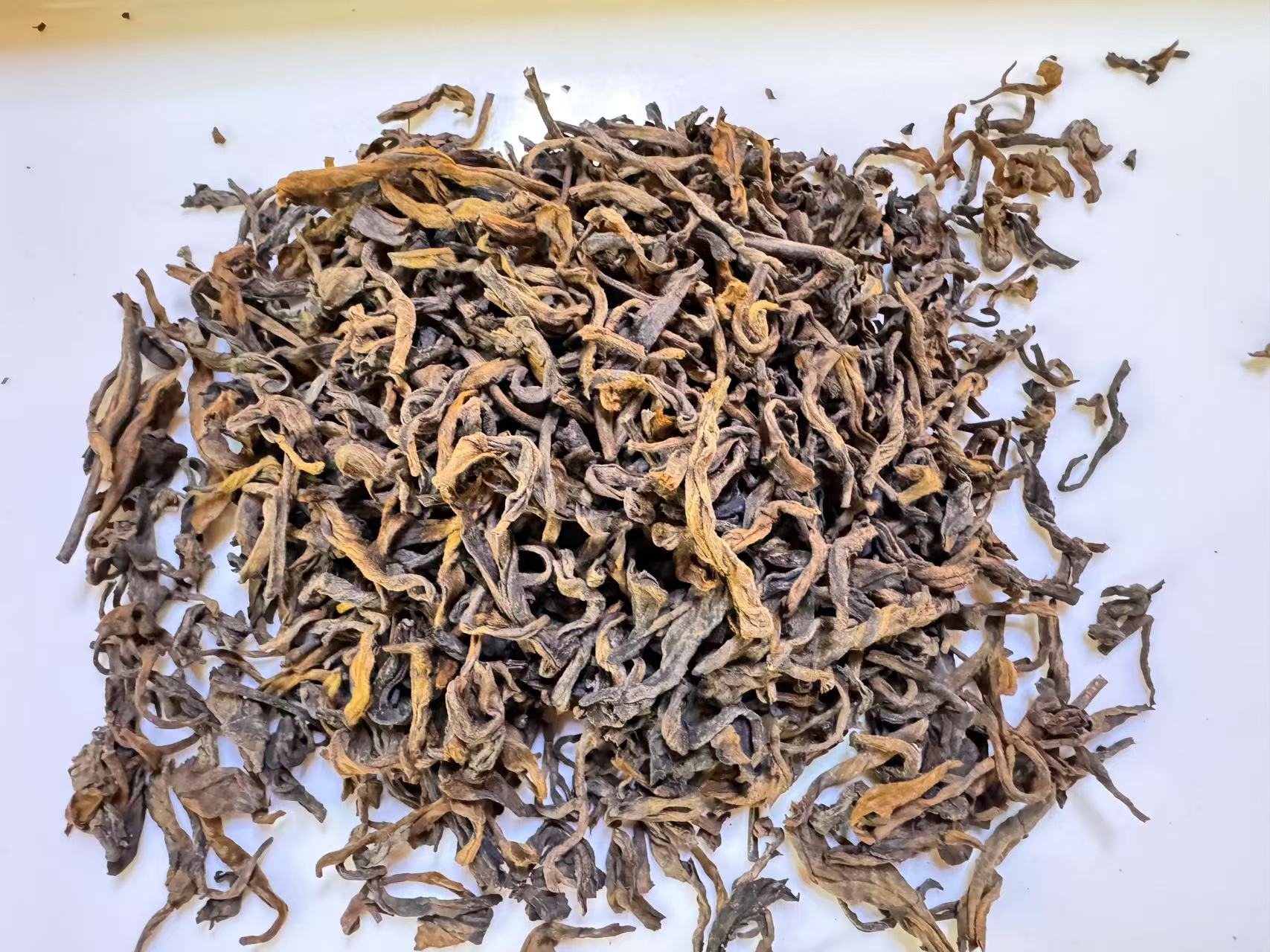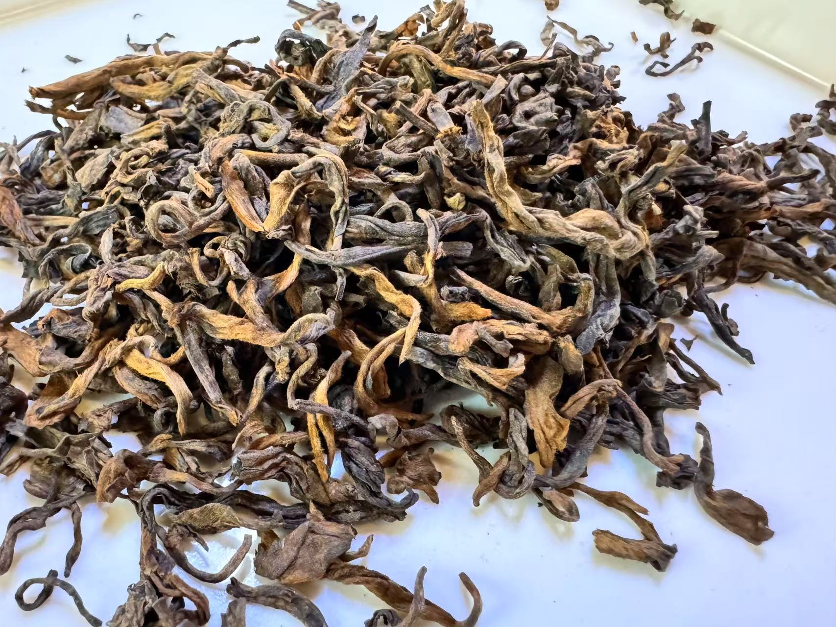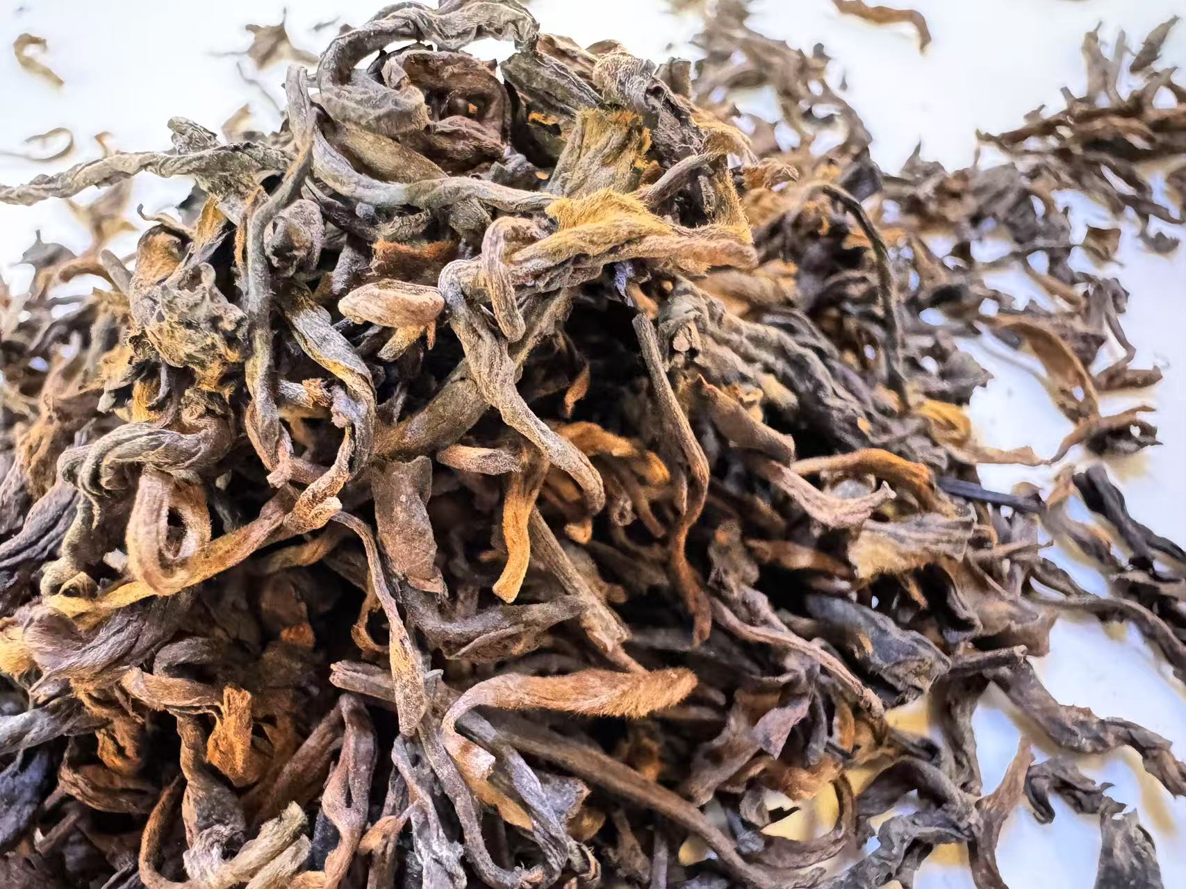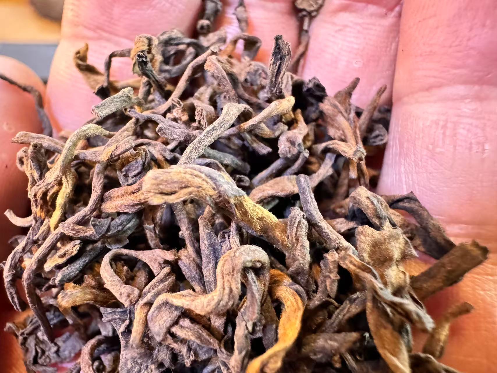 大茶树采摘鲜叶是一芽2-3叶,且因为树龄大所以芽头不会特别肥,有个人的嫩梢芽头很小,所以“金芽”中带有部分第二叶,这和那些小树发酵的“宫廷”有完全不一样的地方。如果是古树发酵的话,那芽头占比还会更少一些。