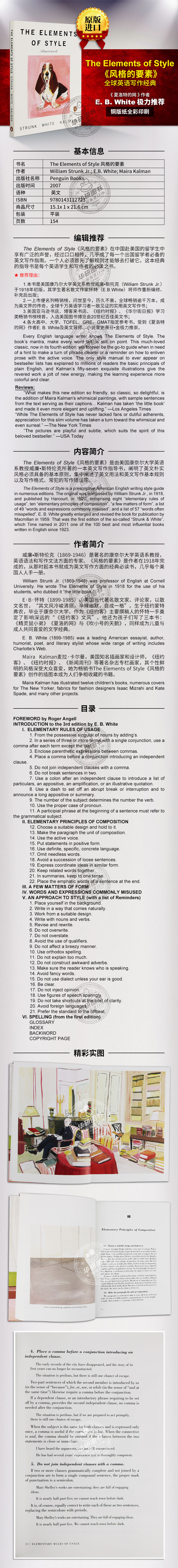 1.本书是美国康乃尔大学英文系教授威廉·斯托克(William Strunk Jr.)于1918年初版,其学生著名散文作家怀特(E.B.White)将师作重新编修、补充后出版;