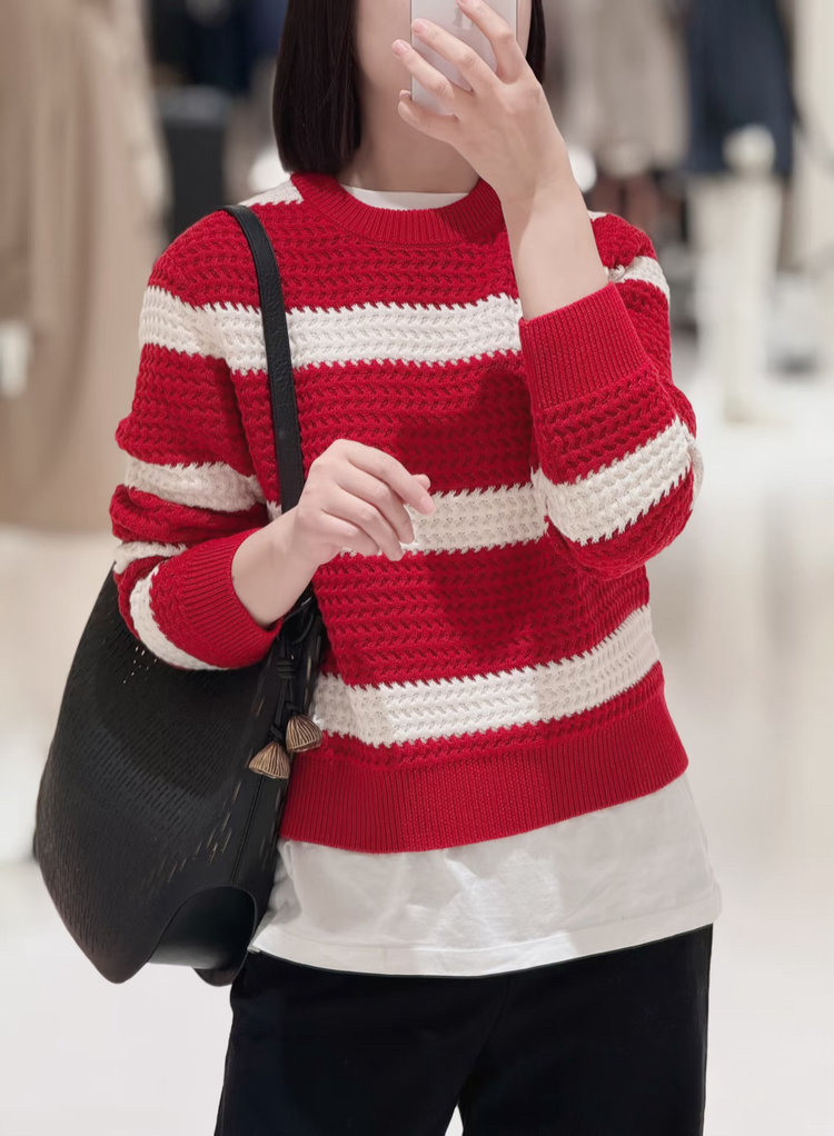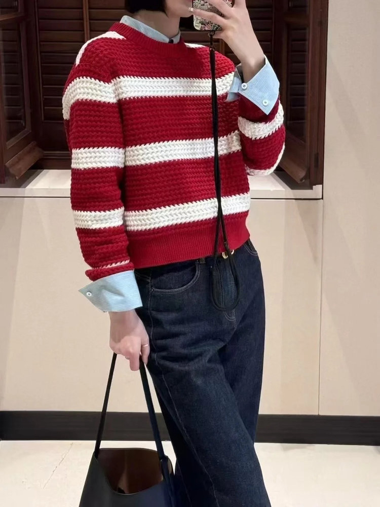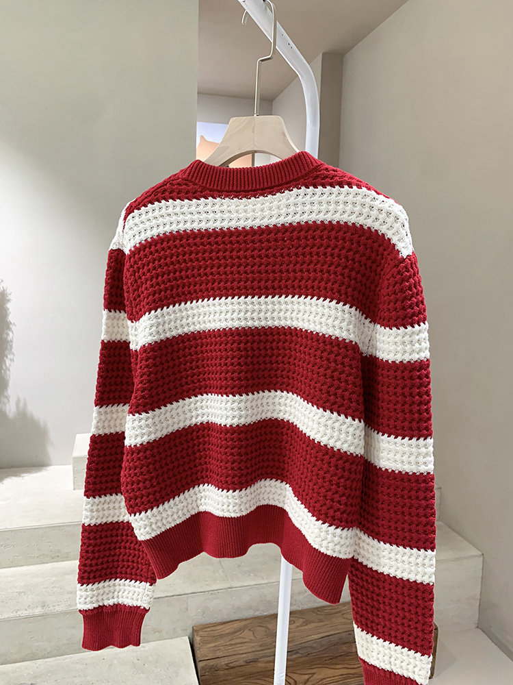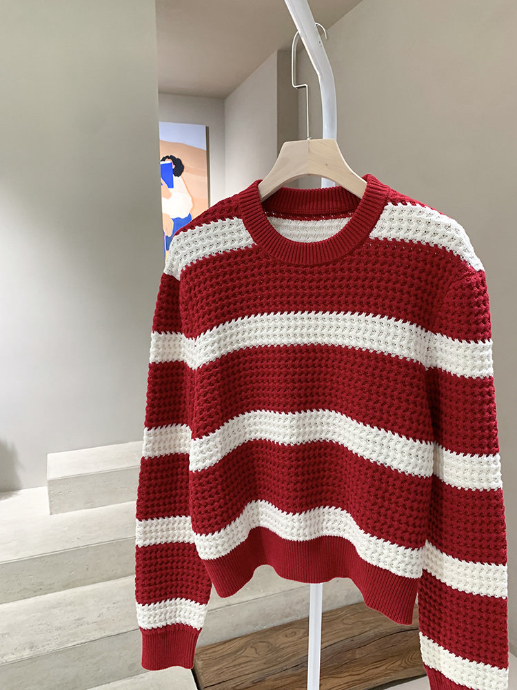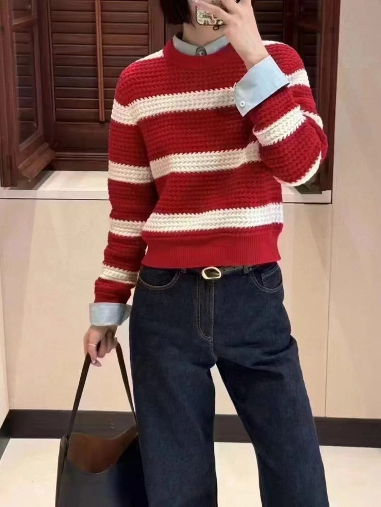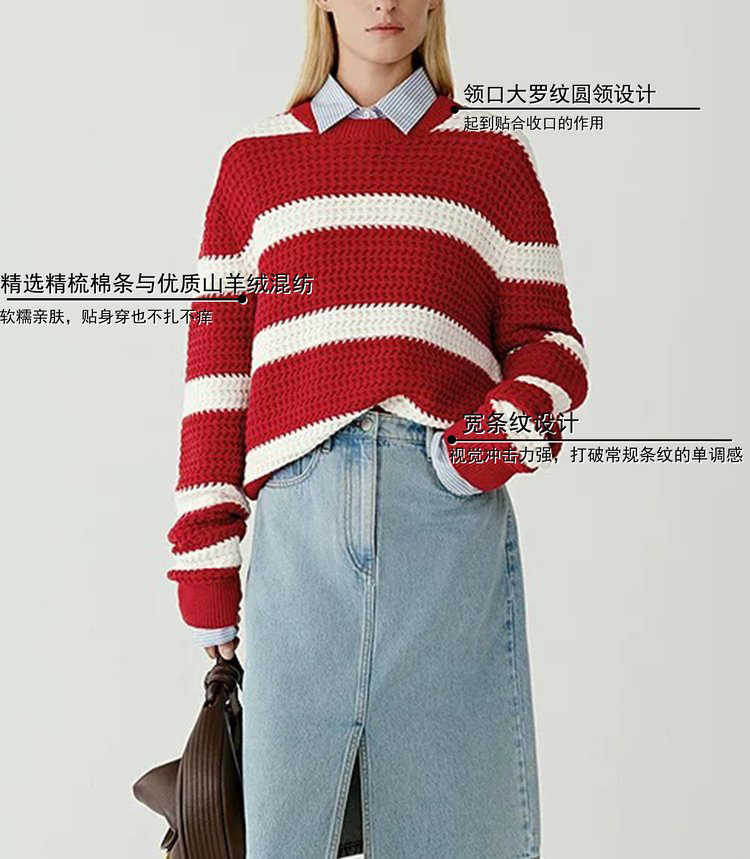 棉羊绒条纹套头毛衣 氛围感针织衫 精选精梳棉条与优质山羊绒混纺 经典红白宽条纹设计 复古法式风情