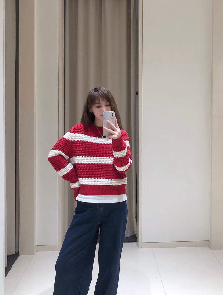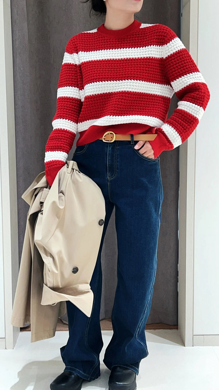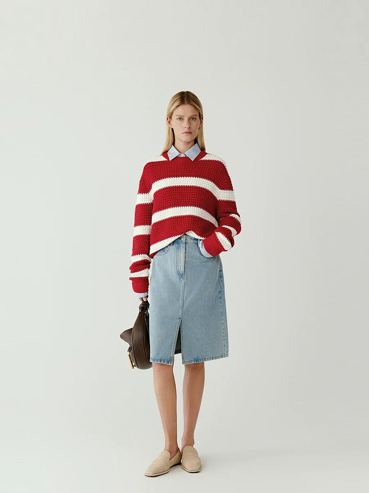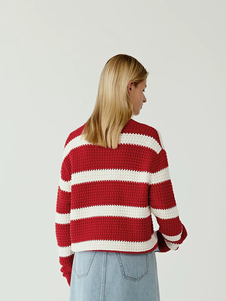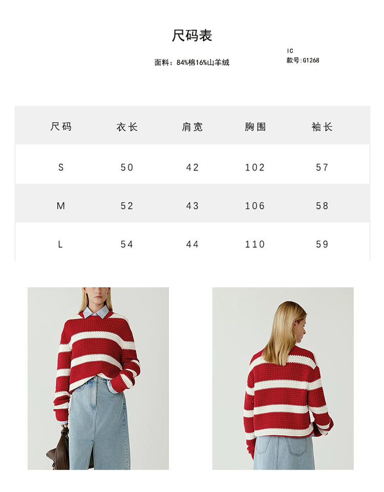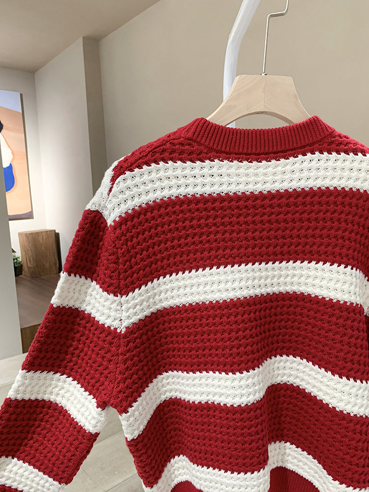 棉羊绒条纹套头毛衣 氛围感针织衫 精选精梳棉条与优质山羊绒混纺 经典红白宽条纹设计 复古法式风情