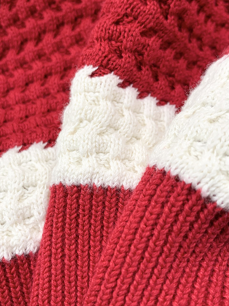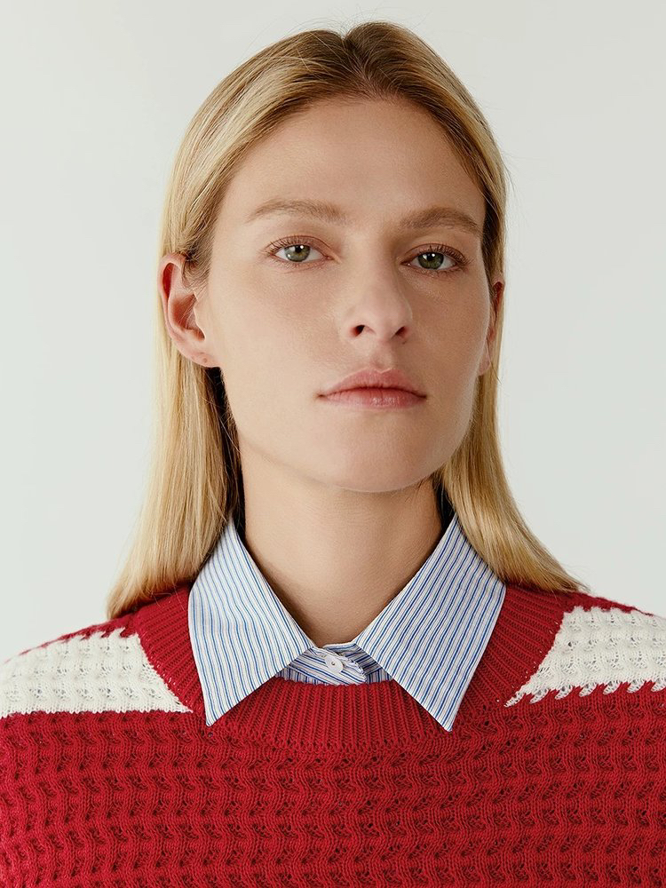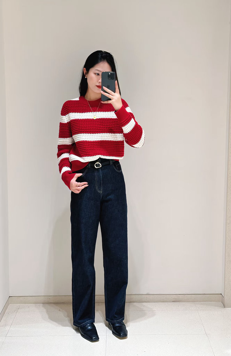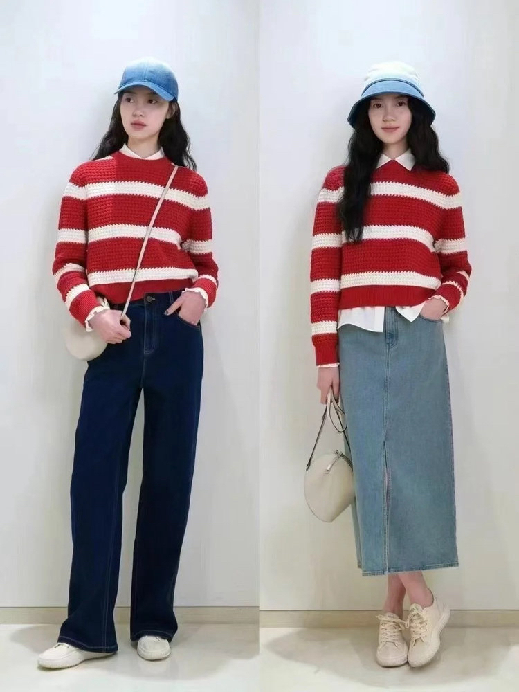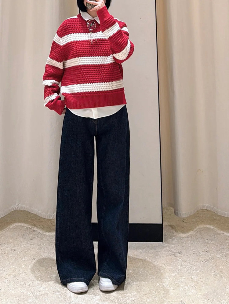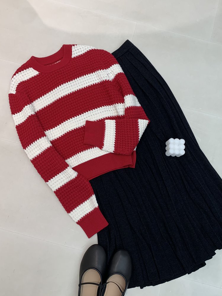 棉羊绒条纹套头毛衣 氛围感针织衫 精选精梳棉条与优质山羊绒混纺 经典红白宽条纹设计 复古法式风情