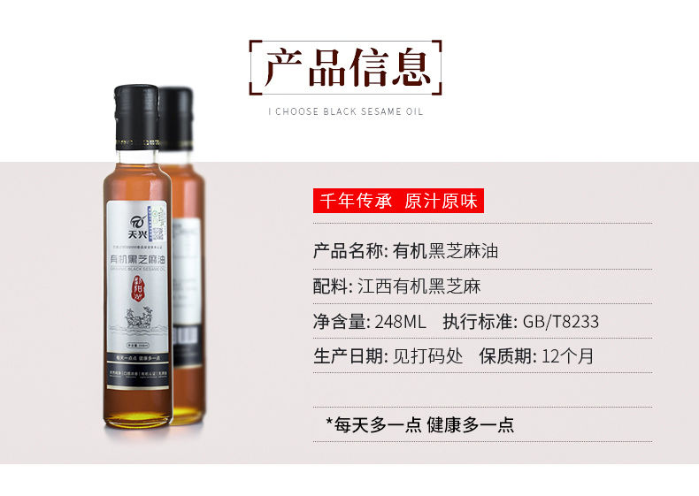 有机黑芝麻香油一级冷榨凉拌火锅炒菜油碟调料 248ml/750ml