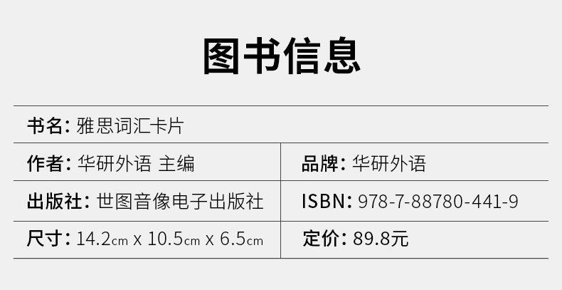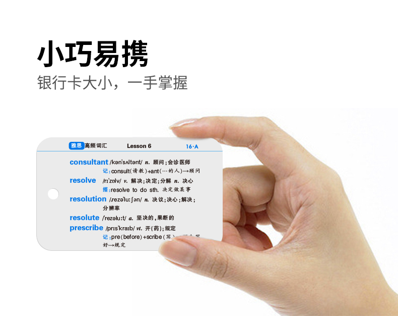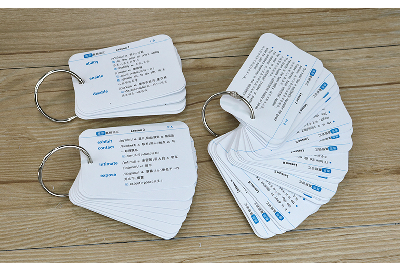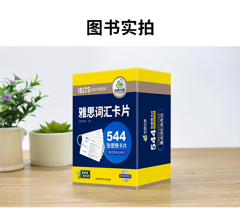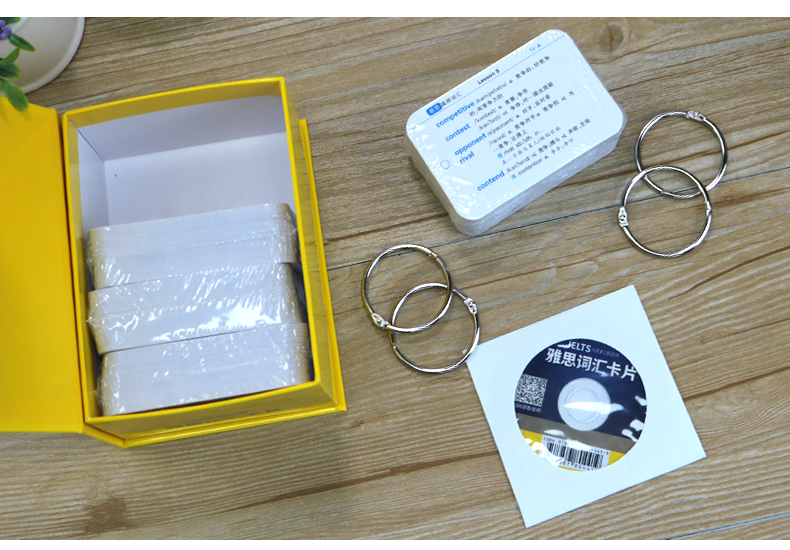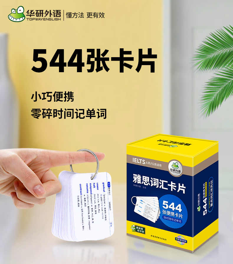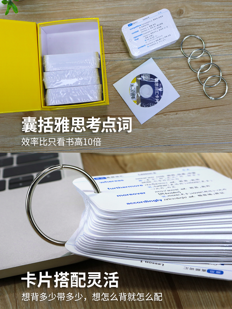 1. 便携卡片:544张词汇卡片,带装订孔,赠装订圈,小巧便携,可与《雅思词汇念念不忘》配套,方便随时随地记雅思词汇,效率比只看书高10倍;