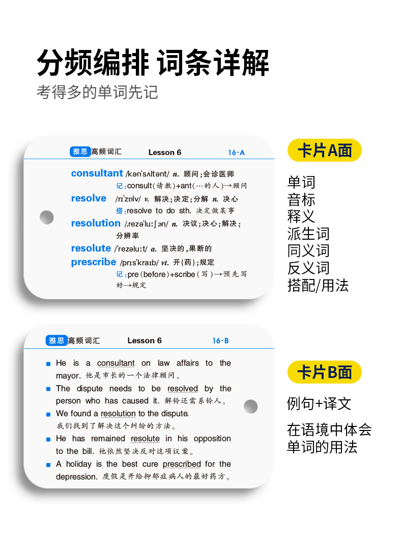 5. 重点词汇讲解详细:卡片A面有单词、音标、释义、派生词、同义词、反义词、搭配和用法等,B面为经典例句及译文;