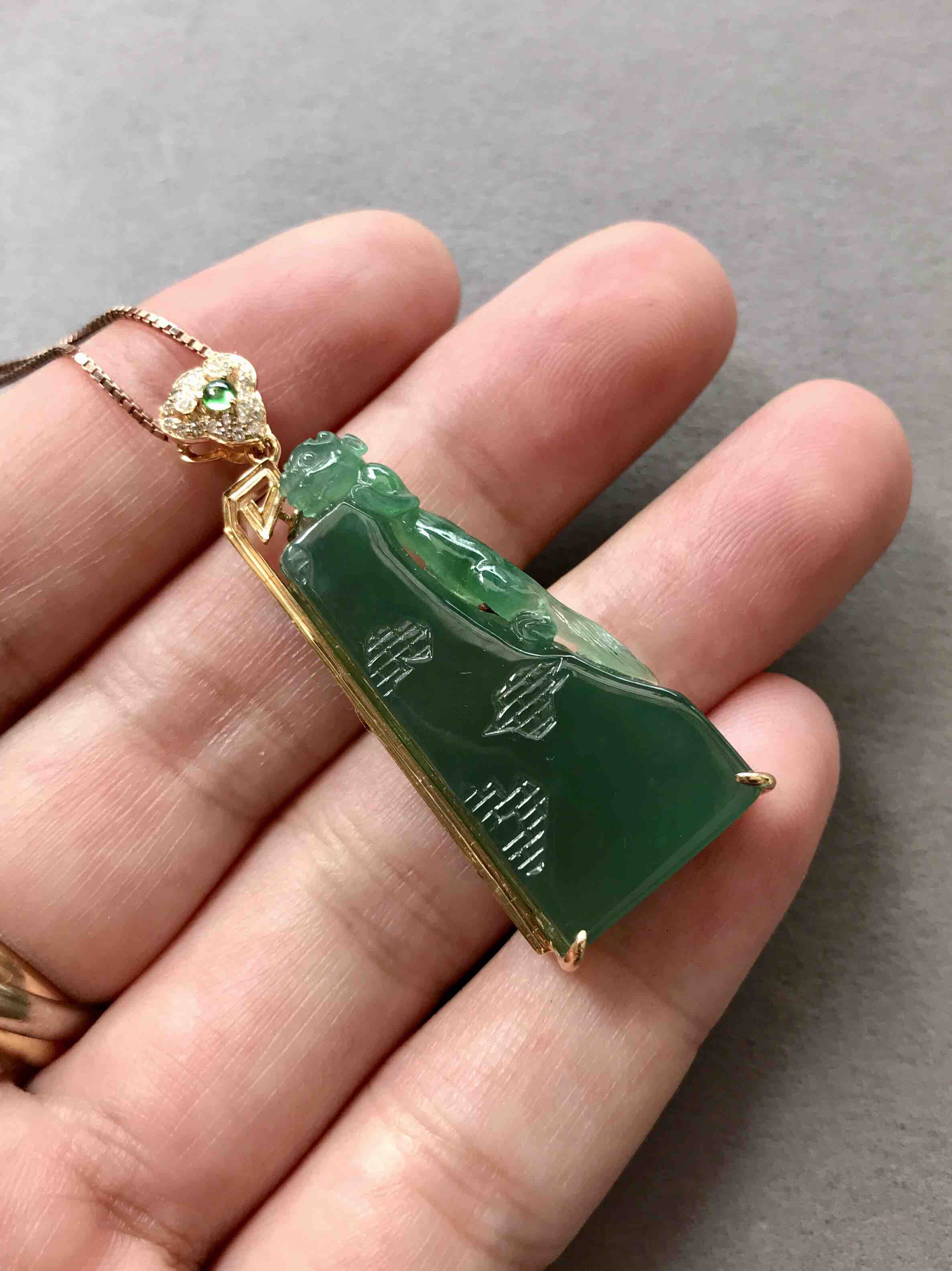 标本级精品,冰种湖水绿步步高升,府上有龙,35×15.2×6mm,镶嵌后43.8×17.7×7.9mm,种水晶莹剔透,起荧光,少有的湖水绿品种,绿油油的,特别漂亮,宝贝厚庄,立体饱满,设计师款独特设计,18k黄金钻石镶嵌搭配沙弗来石,从翡翠本身的品质,雕刻,到镶嵌的设计和细节都非常棒,古典与时尚的结合,精品推荐